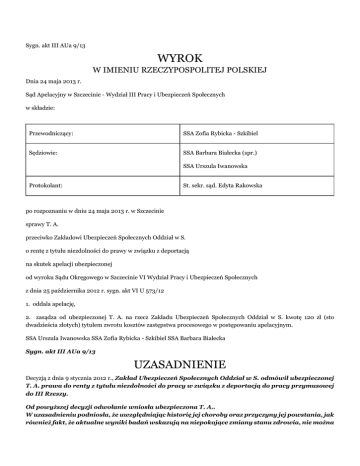Sygn. akt III AUa 9/13 WYROK W IMIENIU RZECZYPOSPOLITEJ POLSKIEJ Dnia 24 maja 2013 r. Sąd Apelacyjny w Szczecinie - Wydział III Pracy i Ubezpieczeń Społecznych w składzie: Przewodniczący: SSA Zofia Rybicka - Szkibiel Sędziowie: SSA Barbara Białecka (spr.) SSA Urszula Iwanowska Protokolant: St. sekr. sąd. Edyta Rakowska po rozpoznaniu w dniu 24 maja 2013 r. w Szczecinie sprawy T. A. przeciwko Zakładowi Ubezpieczeń Społecznych Oddział w S. o rentę z tytułu niezdolności do prawy w związku z deportacją na skutek apelacji ubezpieczonej od wyroku Sądu Okręgowego w Szczecinie VI Wydział Pracy i Ubezpieczeń Społecznych z dnia 25 października 2012 r. sygn. akt VI U 573/12 1. oddala apelację, 2. zasądza od ubezpieczonej T. A. na rzecz Zakładu Ubezpieczeń Społecznych Oddział w S. kwotę 120 zł (sto dwadzieścia złotych) tytułem zwrotu kosztów zastępstwa procesowego w postępowaniu apelacyjnym. SSA Urszula Iwanowska SSA Zofia Rybicka - Szkibiel SSA Barbara Białecka Sygn. akt III AUa 9/13 UZASADNIENIE Decyzją z dnia 9 stycznia 2012 r., Zakład Ubezpieczeń Społecznych Oddział w S. odmówił ubezpieczonej T. A. prawa do renty z tytułu niezdolności do pracy w związku z deportacją do pracy przymusowej do III Rzeszy. Od powyższej decyzji odwołanie wniosła ubezpieczona T. A.. W uzasadnieniu podniosła, że uwzględniając historię jej choroby oraz przyczyny jej powstania, jak również fakt, że aktualne wyniki badań wskazują na niepokojące zmiany stanu zdrowia, nie można zgodzić się ze stwierdzeniami zawartymi w orzeczeniach Lekarza Orzecznika, a następnie Komisji Lekarskiej ZUS. W czasie deportacji do III Rzeszy uległa zranieniu w głowę w czasie nalotów, a stan jej zdrowia w ostatnim czasie pogorszył się znacząco. Zakład Ubezpieczeń Społecznych Oddział w S. wniósł o oddalenie odwołania powołując się na orzeczenie Komisji Lekarskiej ZUS z dnia 2 stycznia 2012r. ustalające, że ubezpieczona nie jest niezdolna do pracy w związku z deportacją do pracy przymusowej do III Rzeszy. Sąd Okręgowy w Szczecinie – VI Wydział Pracy i Ubezpieczeń Społecznych wyrokiem z dnia 25 października 2012 r., sygn. akt VI U 573/12 oddalił odwołanie. Sąd I Instancji oparł swoje rozstrzygnięcie na następujących ustaleniach faktycznych i rozważaniach prawnych. T. A. urodzona dnia (...), została wraz ze swoimi rodzicami oraz bratem bliźniakiem wywieziona do III Rzeszy, do pracy przymusowej w miejscowości G. pow. V., gdzie przebywała w okresie od 8 maja 1943 r. do 24 kwietnia 1945 r. W trakcie tego pobytu, podczas jednego z nalotów ubezpieczona została ranna w tył głowy. Nie była wówczas hospitalizowana, jednak straciła przytomność i wezwano do niej pogotowie. W chwili wybuchu jej rodzice byli w pracy, a ona była w domu jedynie ze swoim bratem, nie było innych świadków tego zdarzenia. Ubezpieczona okoliczności wybuchu nie pamięta, zdarzenie zna przede wszystkim z opowiadań rodziców. Po tym zdarzeniu T. A. leczyła się u chirurga, zdarzało się że czuła się źle jednak dolegliwości przechodziły samoistnie. Decyzją Kierownika Urzędu do Spraw Kombatantów i Osób Represjonowanych z dnia 12 maja 2006r. Nr DO- (...), ubezpieczonej przyznano uprawnienie do świadczenia pieniężnego przewidzianego w ustawie z dnia 31 maja 1996 r. o świadczeniu pieniężnym przysługującym osobom deportowanym do pracy przymusowej oraz osadzonym w obozach pracy przez III Rzeszę i Związek Socjalistycznych Republik Radzieckich. T. A. z wykształcenia jest ekonomistą, pracowała m.in. jako pracownik kasowy, specjalista do spraw rewizji gospodarczej, specjalista do spraw finansowo księgowych, kierownik działu księgowości, zastępca głównego księgowego, główna księgowa, główny ekonomista. Decyzją ZUS z dnia 27 października 1999 r. ubezpieczonej przyznano prawo do emerytury od dnia 1 października 1999 r. Ubezpieczona nie występowała nigdy o prawo do renty z tytułu niezdolności do pracy. U ubezpieczonej rozpoznano przebyty w 2011 r. epizod wypadnięcia błędnika lewego, przy czym obecnie następuje wyrównanie choroby, zmiany zwyrodnieniowe kręgosłupa w odcinku lędźwiowo-krzyżowym bez istotnego upośledzenia funkcji. Nie wiadomo na jakim tle doszło do wypadnięcia błędnika, jednak należy przypuszczać, że nastąpiło to na tle naczyniowym. U ubezpieczonej dwukrotnie wykonywano badania (...) i ostatnie badanie wskazuje na to, że zmiany się cofają. Choroba może okresowo wracać, objawy mogą się zwiększać bądź zmniejszać, ale charakteryzuje się ustępowaniem zmian. Nie można natomiast doszukiwać się jakiegokolwiek związku między urazem jakiego doznała ubezpieczona w trakcie deportacji do III Rzeszy, a wypadnięciem błędnika. O takiej zależności w ocenie Sądu Okręgowego mogłaby być mowa gdyby wystąpiło złamanie podstawy czaszki lub piramidy kości skalistej, stłuczenie pnia mózgu. W wypadku ubezpieczonej brak jest danych by tego typu uszkodzenia nastąpiły, przy czym gdyby tak się stało nastąpiłyby natychmiast po urazie, nie zaś po wielu latach. Wystąpienie tych objawów dopiero teraz wyklucza związek z tym epizodem. W dokumentacji medycznej ubezpieczonej brak jest takich zapisów, które miałyby wpływ na ocenę zdrowia ubezpieczonej z tego punktu widzenia. T. A. jest zdolna do pracy i nie stwierdzono u niej niezdolności do pracy w związku z urazem głowy w okresie deportacji do III Rzeszy. W oparciu o tak ustalony stan faktyczny Sąd Okręgowy uznał, że odwołanie ubezpieczonej nie zasługiwało na uwzględnienie i wskazał za podstawę prawną rozstrzygnięcia art. 3 oraz art. 12 ust. 1 – 4 ustawy z dnia 24 stycznia 1991 r. o kombatantach oraz niektórych osobach będących ofiarami represji wojennych i okresu powojennego (Dz.U z 2002 r. nr 42 poz. 371, tj. ). Sąd pierwszej instancji podniósł, że bezsporny pozostaje fakt wywiezienia ubezpieczonej do pracy przymusow