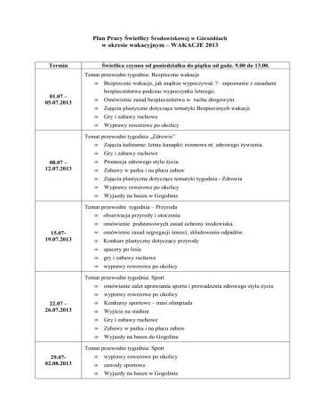 Plan Pracy Świetlicy Środowiskowej w Górażdżach w okresie wakacyjnym – WAKACJE 2013 Świetlica czynna od poniedziałku do piątku od godz. 9.00 do 13.00. Termin Temat przewodni tygodnia: Bezpieczne wakacje 01.07 – 05.07.2013 • Bezpieczne wakacje, jak mądrze wypoczywać ?– zapoznanie z zasadami bezpieczeństwa podczas wypoczynku letniego. • Omówienie zasad bezpieczeństwa w ruchu drogowym. • Zajęcia plastyczne dotyczące tematyki Bezpiecznych wakacji. • Gry i zabawy ruchowe • Wyprawy rowerowe po okolicy Temat przewodni tygodnia „Zdrowie” 08.07 – 12.07.2013 • Zajęcia kulinarne: letnie kanapki; rozmowa nt. zdrowego żywienia. • Gry i zabawy ruchowe • Promocja zdrowego stylu życia • Zabawy w parku i na placu zabaw • Zajęcia plastyczne dotyczące tematyki tygodnia - Zdrowia • Wyprawy rowerowe po okolicy • Wyjazdy na basen w Gogolinie Temat przewodni tygodnia – Przyroda 15.0719.07.2013 • obserwacja przyrody i otoczenia • omówienie podstawowych zasad ochrony środowiska. • omówienie zasad segregacji śmieci, składowania odpadów. • Konkurs plastyczny dotyczący przyrody • spacery po lesie • gry i zabawy ruchowe • wyprawy rowerowe po okolicy Temat przewodni tygodnia: Sport 22.07 – 26.07.2013 • omówienie zalet uprawiania sportu i prowadzenia zdrowego stylu życia • wyprawy rowerowe po okolicy • Konkursy sportowe – mini olimpiada • Wyjście na stadion • Gry i zabawy ruchowe • Zabawy w parku i na placu zabaw • Wyjazdy na basen do Gogolina Temat przewodni tygodnia: Sport 29.0702.08.2013 • wyprawy rowerowe po okolicy • zawody sportowe • Wyjazdy na basen w Gogolinie • Gry i zabawy ruchowe • Zabawy w parku i na placu zabaw • Gry i zabawy planszowe • Turniej gier planszowych Temat przewodni tygodnia – Zwiedzanie okolicy 05.08 – 09.08.2013 • pogadanka na temat okolicznych miejscowości, atrakcje turystyczne w Gminie Gogolin • podania i legendy dotyczące naszego regionu • piesze wycieczki w znane i mniej znane miejsca naszej Gminy • wyprawy rowerowe po okolicy • konkurs plastyczny dotyczący atrakcji naszego regionu • zagadki i rebusy • gry i zabawy świetlicowe Temat przewodni tygodnia – Muzyka 12.08 – 16.08.2013 • omówienie instrumentów muzycznych • elementy muzykoterapii • zaznajomienie dzieci ze poszczególnymi stylami muzycznymi • konkurs talentów • malowanie muzyki – zajęcia plastyczne • zagadki muzyczne • gry i zabawy świetlicowe • spacery po lesie i parku • wyprawy rowerowe Temat przewodni tygodnia Książka 19.08 – 23.08.2013 • Zajęcia prowadzone wspólnie z Gminną Biblioteka Publiczną Filia w Górażdżach • promowanie czytelnictwa • czytanie dzieciom • konkurs plastyczny – Mój ulubiony bohater książkowy • gry i zabawy planszowe • gry i zabawy ruchowe Temat przewodni tygodnia Koniec Wakacji 26.08 – 30.08.2013 • Podsumowanie okresu wakacyjnego • Zajęcia plastyczne – wspomnienia z wakacji • Gry i zabawy świetlicowe • Wyprawy rowerowe • Wyjazdy na basen • Wyprawy rowerowe po okolicy • Zabawy sportowe Uwagi: Dzieci dziennie mogą skorzystać z małego poczęstunku (bułka, rogalik lub drożdżówka) oraz z herbaty. Dzieci uczestniczące w zajęciach wezmą udział w organizowanej wycieczce do ogrodu zoologicznego w Opolu. Plan pracy może być modyfikowany ze względu na pogodę i potrzeby dzieci