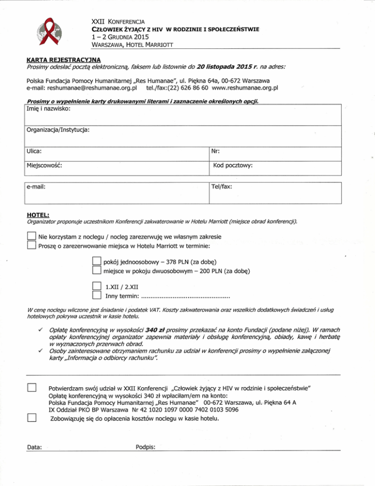 XXII KONFERENOA CZŁOWIEK ŻYlĄCY Z HIV W RODZINIE I SPOŁECZEŃSTWIE 1 - 2 GRUDNIA 2015 WARSZAWA, HOTEL MARRIOn KARTA REJESTRACYJNA Prosimy odesłać pocztą ełektrontcznę. faksem lub listownie do 20 listopada 2015 r. na adres: Polska Fundacja Pomocy Humanitarnej .Res Humanae", ul. Piękna 64a, 00-672 Warszawa e-mail: [email protected] tel./fax:(22) 626 86 60 www.reshumanae.org.pl Prosimy o wvoełntente karty drukowanymi literami i zaznaczenie określonvch oocil. Imię i nazwisko: Organizacja/Instytucja: Ulica: Nr: Kod pocztowy: Miejscowość: '_e_-m_a_i_I: I_T_el_/f_ax_: _ HOTEL: Organizator proponuje uczestnikom Konferencji zakwaterowanie w Hotelu Marriott (miejsce obrad konferencji). D Nie korzystam z noclegu / nocleg zarezerwuję we własnym zakresie D Proszę o zarezerwowanie miejsca w Hotelu Marriott w terminie: D pokój jednoosobowy - 378 PLN (za dobę) D miejsce w pokoju dwuosobowym D l.XII / 2.XII D Inny termin: - 200 PLN (za dobę) . W cenę noclegu wliczone jest śniadanie i podatek VAT. Koszty zakwaterowania oraz wszelkich dodatkowych świadczeń i usług hotelowych pokrywa uczestnik w kasie hotelu. y' y' D D Data: Opłatę konferencyjną w wysokości 340 zł prosimy przekazać na konto Fundacji (podane niżej). W ramach opłaty konferencyjnej organizator zapewnia materiały i obsługę konterencyjnę, obiady, kawę i herbatę w wyznaczonych przerwach obrad. Osoby zainteresowane otrzymaniem rachunku za udział w konferencji prosimy o wypełnienie załączonej karty "Informacja o odbiorcy redumku", Potwierdzam swój udział w XXII Konferencji "Człowiek żyjący z HIV w rodzinie i społeczeństwie" Opłatę konferencyjną w wysokości 340 zł wpłaclłam/ern na konto: Polska Fundacja Pomocy Humanitarnej .Res Humanae" 00-672 Warszawa, uh Piękna 64 A IX Oddział PKO BP Warszawa Nr 42 1020 1097 0000 7402 0103 5096 Zobowiązuję się do opłacenia kosztów noclegu w kasie hotelu. Podpis: