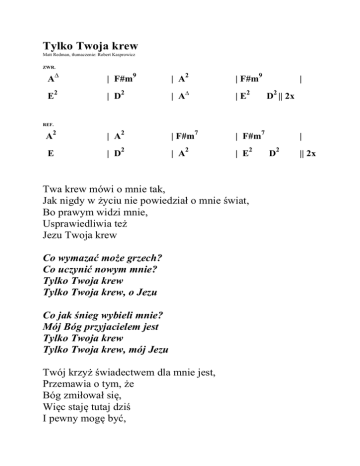 Tylko Twoja krew Matt Redman, tłumaczenie: Robert Kasprowicz ZWR. A ∆ E2 | F#m 9 | A 2 | F#m 9 | D2 | A∆ | E2 A2 | A2 | F#m7 | F#m7 E | D2 | A2 | E2 | D2 || 2x REF. Twa krew mówi o mnie tak, Jak nigdy w życiu nie powiedział o mnie świat, Bo prawym widzi mnie, Usprawiedliwia też Jezu Twoja krew Co wymazać może grzech? Co uczynić nowym mnie? Tylko Twoja krew Tylko Twoja krew, o Jezu Co jak śnieg wybieli mnie? Mój Bóg przyjacielem jest Tylko Twoja krew Tylko Twoja krew, mój Jezu Twój krzyż świadectwem dla mnie jest, Przemawia o tym, że Bóg zmiłował się, Więc staję tutaj dziś I pewny mogę być, | D2 || 2x Bo mówi Twoja krew