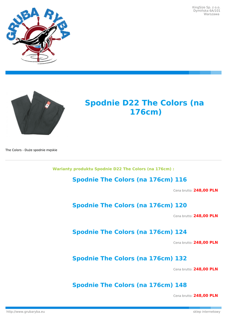 KingSize Sp. z o.o. Dymińska 6A/101 Warszawa Spodnie D22 The Colors (na 176cm) The Colors - Duże spodnie męskie Warianty produktu Spodnie D22 The Colors (na 176cm) : Spodnie The Colors (na 176cm) 116 Cena brutto: 248,00 PLN Spodnie The Colors (na 176cm) 120 Cena brutto: 248,00 PLN Spodnie The Colors (na 176cm) 124 Cena brutto: 248,00 PLN Spodnie The Colors (na 176cm) 132 Cena brutto: 248,00 PLN Spodnie The Colors (na 176cm) 148 Cena brutto: http://www.grubaryba.eu 248,00 PLN sklep internetowy