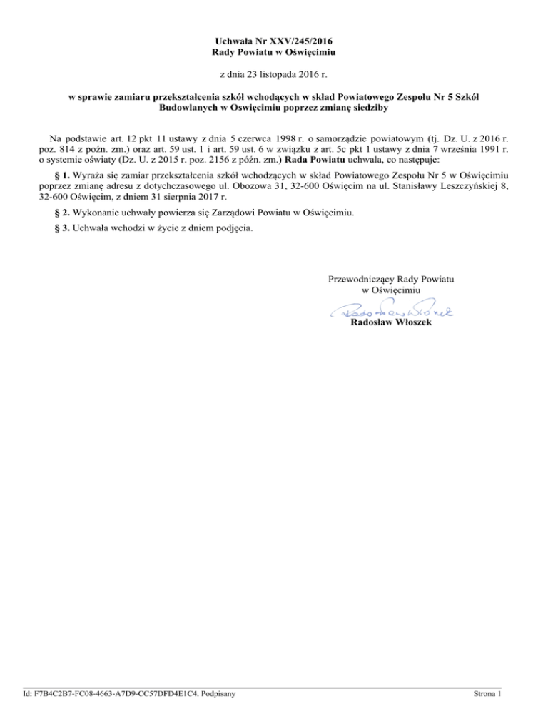 Uchwała Nr XXV/245/2016 Rady Powiatu w Oświęcimiu z dnia 23 listopada 2016 r. w sprawie zamiaru przekształcenia szkół wchodących w skład Powiatowego Zespołu Nr 5 Szkół Budowlanych w Oswięcimiu poprzez zmianę siedziby Na podstawie art. 12 pkt 11 ustawy z dnia 5 czerwca 1998 r. o samorządzie powiatowym (tj. Dz. U. z 2016 r. poz. 814 z poźn. zm.) oraz art. 59 ust. 1 i art. 59 ust. 6 w związku z art. 5c pkt 1 ustawy z dnia 7 września 1991 r. o systemie oświaty (Dz. U. z 2015 r. poz. 2156 z późn. zm.) Rada Powiatu uchwala, co następuje: § 1. Wyraża się zamiar przekształcenia szkół wchodzących w skład Powiatowego Zespołu Nr 5 w Oświęcimiu poprzez zmianę adresu z dotychczasowego ul. Obozowa 31, 32-600 Oświęcim na ul. Stanisławy Leszczyńskiej 8, 32-600 Oświęcim, z dniem 31 sierpnia 2017 r. § 2. Wykonanie uchwały powierza się Zarządowi Powiatu w Oświęcimiu. § 3. Uchwała wchodzi w życie z dniem podjęcia. Przewodniczący Rady Powiatu w Oświęcimiu Radosław Włoszek Id: F7B4C2B7-FC08-4663-A7D9-CC57DFD4E1C4. Podpisany Strona 1 Uzasadnienie Zmiana siedziby szkoły stanowi jej przekształcenie. Podjęcie niniejszej uchwały jest zasadne w związku z wymogiem art. 59 ust. 1 i 6 ustawy o systemie oświaty, zgodnie z którym organ prowadzący szkołę jest zobowiązany, co najmniej na sześć miesięcy przed terminem przekształcenia, zawiadomić o zamiarze przekształcenia szkoły właściwego kuratora oświaty oraz rodziców. W budynku Powiatowego Zespołu Nr 5 w Oświęcimiu znajduje się 19 sal lekcyjnych. W roku szkolnym 2016/2017 w technikum uczy się 133 uczniów, w zasadniczej szkole zawodowej 120 oraz w liceum ogólnokształcącym dla dorosłych 65 uczniów. Łącznie w budynku funcjonuje 12 oddziałów, co pokazuje, że budynek nie jest wykorzystywany w pełni jego możliwości. Taki stan generuje wysokie koszty utrzymania tj. 6.977 zł na ucznia w 2015 r. W budynku Powiatowego Zespołu Nr 3 w Oświęcimiu znajduje się 25 dużych i 10 mniejszych sal lekcyjnych W roku szkolnym 2016/2017 w technikum uczy się 635 uczniów, w liceum ogólnokształcącym 116 uczniow, natomiast w zasadniczej szkole zawodowej nie ma uczniów. Łącznie w budynku funcjonuje 28 oddziałów. To pokazuje, że budynek nie jest wykorzystywany w pełni jego możliwości. Taki stan generuje wysokie koszty utrzymania tj. 7.510 zł na ucznia w 2015 r. Przeniesienie siedziby Powiatowego Zespołu Nr 5 w Oświęcimiu do znajdujacego się w odległości około 1,5 km budynku Powiatowego Zespołu Nr 3 w Oświęcimiu podyktowane jest zarówno względami ekonomicznymi jak i demograficznymi. Na przestrzeni ostatnich lat malało zainteresowanie uczniów nauką w Powiatowym Zespołe Nr 5 w Oświęcimiu co obrazują poniższe dane: - liczba uczniów w roku szk. 2010/11 – 545 - liczba uczniów w roku szk. 2011/12 – 469 - liczba uczniów w roku szk. 2012/13 – 452 - liczba uczniów w roku szk. 2013/14 – 403 - liczba uczniów w roku szk. 2014/15 – 382 - liczba uczniów w roku szk. 2015/16 – 374 - liczba uczniów w roku szk. 2016/17 – 318 W konsekwencji, na przestrzeni lat szkolnych 2010/2011 - 2016/2017 zmalała liczba zatrudnionych nauczycieli z 42 (38,75 etatu) do 24 (23,58 etatu). Na dzień 30.09.2016 r. w szkole zatrudnionych jest także 10 (7,38 etatu) pracowników administracji i obsługi. Po zmianie siedziby szkoły uczniowie szkół wchodzących w skład Powiatowego Zespołu Nr 5 w Oświęcimiu będą kontynuować naukę w dotychczasowych oddziałach. Niekorzystną perspektywę demograficzną obrazują wieloletnie dane obejmujące: 1) planowane ilości uczniów kończących naukę w gimnazjach na terenie powiatu oświęcimskiego: - w roku szkolnym 2015/2016 – 1.431 - w roku szkolnym 2016/2017 – 1.345 - w roku szkolnym 2017/2018 – 1.343 - w roku szkolnym 2018/2019 – 1.313 Id: F7B4C2B7-FC08-4663-A7D9-CC57DFD4E1C4. Podpisany Strona 1 2) liczbę urodzeń w Polsce w latach 2008-2014 r. oraz prognozy urodzeń do 2035 r. (nabory w szkołach ponadgimnazjalnych do roku szkolnego 2051/2052): Powyższe uwarunkowania są przyczyną długotrwałej, głębokiej niewspółmierności kosztów funkcjonowania ww. Zespołu do zakresu prowadzonej działalności, co obrazuje poniższe zestawienie naliczonej subwencji i wykonania budżetu w poszczególnych latach: Liczba uczniów wg stanu na 30 września roku poprzedzającego Razem kwota naliczonej subwencji wg metryczki zadania szkolne Wykonanie za rok (bez dotacji i środków pozyskanych z zewnątrz) Subwencja oświatowa minus wykonanie Rok 2011 Rok 2012 Rok 2013 Rok 2014 Rok 2015 545 469 452 403 382 3 250 060 zł 2 990 292 zł 2 934 218 zł 2 607 256 zł 2 480 190 zł 2 728 623 zł 2 787 583 zł 2 644 562 zł 2 679 926 zł 2 665 444 zł 521 437 zł 202 709 zł 289 656 zł -72 670 zł -185 254 zł Ponadto Powiat Oświęcimski planuje utworzenie od 1 września 2017 r. Centrum Kształcenia Zawodowego i Ustawicznego w skład którego wchodzić będą szkoły Powiatowego Zespołu Nr 3 w Oświęcimiu i Powiatowego Zespołu Nr 5 w Oświęcimiu oraz Centrum Kształcenia Praktycznego w Oświęcimiu. Dlatego konieczne będzie rozwiązanie z dniem 31 sierpnia 2017 r. Powiatowego Zespołu Nr 3 oraz Powiatowego Zespołu Nr 5 w Oświęcimiu. Działania powyższe mają na celu podniesienie jakości nauczania oraz lepsze wykorzystanie bazy technicznej i dydaktycznej, otwarcie się na zmiany w otoczeniu gospodarczym poprzez współpracę z pracodawcami oraz racjonalizację wydatków w powiatowej oświacie. Z uwagi na obecną i przewidywaną sytuację w zakresie naboru do Powiatowego Zespołu Nr 5 Szkół Budowlanych w Oświęcimiu oraz wcześniejszą, malejącą tendencją - racjonalnym staje się przeniesienie szkół wchodzących w skład PZ Nr 5 z dniem 31 sierpnia 2017 r. Id: F7B4C2B7-FC08-4663-A7D9-CC57DFD4E1C4. Podpisany Strona 2