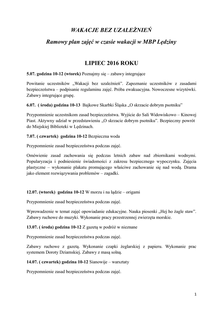WAKACJE BEZ UZALEŻNIEŃ Ramowy plan zajęć w czasie wakacji w MBP Lędziny LIPIEC 2016 ROKU 5.07. godzina 10-12 (wtorek) Poznajmy się – zabawy integrujące Powitanie uczestników „Wakacji bez uzależnień”. Zapoznanie uczestników z zasadami bezpieczeństwa – podpisanie regulaminu zajęć. Próba ewakuacyjna. Nowoczesne wizytówki. Zabawy integrujące grupę. 6.07. ( środa) godzina 10-13 Bajkowe Skarbki Śląska „O skrzacie dobrym psotniku” Przypomnienie uczestnikom zasad bezpieczeństwa. Wyjście do Sali Widowiskowo – Kinowej Piast. Aktywny udział w przedstawieniu „O skrzacie dobrym psotniku”. Bezpieczny powrót do Miejskiej Biblioteki w Lędzinach. 7.07. ( czwartek) godzina 10-12 Bezpieczna woda Przypomnienie zasad bezpieczeństwa podczas zajęć. Omówienie zasad zachowania się podczas letnich zabaw nad zbiornikami wodnymi. Popularyzacja i podniesienie świadomości z zakresu bezpiecznego wypoczynku. Zajęcia plastyczne – wykonanie plakatu promującego właściwe zachowanie się nad wodą. Drama jako element rozwiązywania problemów – zagadki. 12.07. (wtorek) godzina 10-12 W morzu i na lądzie – origami Przypomnienie zasad bezpieczeństwa podczas zajęć. Wprowadzenie w temat zajęć opowiadanie edukacyjne. Nauka piosenki „Hej ho żagle staw”. Zabawy ruchowe do muzyki. Wykonanie pracy przestrzennej zwierzęta morskie. 13.07. ( środa) godzina 10-12 Z gazetą w podróż w nieznane Przypomnienie zasad bezpieczeństwa podczas zajęć. Zabawy ruchowe z gazetą. Wykonanie czapki żeglarskiej z papieru. Wykonanie prac systemem Doroty Dziamskiej. Zabawy z masą solną. 14.07. ( czwartek) godzina 10-12 Sianowije – warsztaty Przypomnienie zasad bezpieczeństwa podczas zajęć. 1 Aktywny udział w warsztatach Sianowije. Wykonanie prac przestrzennych z siana oraz elementów codziennego użytku. 19.07. (wtorek) godzina 10-12 W świecie owadów – zajęcia plastyczno – techniczne Przypomnienie zasad bezpieczeństwa podczas zajęć. Poznanie przyrody najmniejszych owadów – praca z atlasem i książkami przyrodniczymi. Wykonanie owadów za pomocą różnych technik i materiałów. Zabawy ruchowe. 20.07. ( środa) godzina 10-12 Karnawał kolorów – zajęcia plastyczne Przypomnienie zasad bezpieczeństwa podczas zajęć. Zabawy ruchowe do muzyki poważnej. Wprowadzenie w świat kolorów – taniec kwiatów. Wykonanie kolorowych kwiatów za pomocą różnych materiałów. Prezentacja prac. 21.07. ( czwartek) godzina 10-13 Bajkowe Skarbki Śląska „O skarbku w głębokiej kopalni” Przypomnienie uczestnikom zasad bezpieczeństwa. Wyjście do Sali Widowiskowo – Kinowej Piast. Aktywny udział w przedstawieniu „O skrzacie dobrym psotniku”. Bezpieczny powrót do Miejskiej Biblioteki w Lędzinach. 26.07. (wtorek) godzina 10-12 Kolorowe kwiaty-warsztaty Przypomnienie zasad bezpieczeństwa podczas zajęć. Aktywny udział w warsztatach- wykonanie kuli kwiatowej z wyciętych elementów. Wykonanie ozdobnego koszyczka. 27.07. ( środa) godzina 10-12 Cudaki – warsztaty plastyczne Zabawy kolorami – taniec kolorów. Cudaki – odbijanie rąk i tworzenie elementów przyrody na kartkach. Dorysowywanie ciekawych elementów. Rozwój twórczy uczestników. 28.07. ( czwartek) godzina 10-12 Piknik dla dzieci Przypomnienie zasad bezpieczeństwa podczas zajęć. Aktywny udział w pikniku – wykonanie strojów postaci bajkowych. Prezentacja prac- przemarsz korowodu. 2 SIERPIEŃ 2016 ROKU 2.08. ( wtorek) godzina 10-12 Moje wymarzone wakacje – zajęcia plastyczne , praca w grupach. Przypomnienie zasad bezpieczeństwa podczas zajęć. Przypomnienie drogi ewakuacyjnej uczestnikom. 3.08. ( środa) godzina 10-12 Ilustracje do mojej książki – konkurs plastyczny Przypomnienie zasad bezpieczeństwa podczas zajęć. 4.08. ( czwartek) godzina 10-12 Szkatułka na wakacyjne skarby- warsztaty Konkurs plastyczny Przypomnienie zasad bezpieczeństwa podczas zajęć. 9.08. ( wtorek) godzina 10-12 Moje pasje – warsztaty plastyczno- techniczne Marek Szołtysek Przypomnienie zasad bezpieczeństwa podczas zajęć. 10.08. ( środa) godzina 10-12 Sianowije- warsztaty 11.08. ( czwartek) godzina 10-12 Spotkanie z leśnikiem „Mój las” Przypomnienie zasad bezpieczeństwa podczas zajęć. 16.08. ( wtorek) godzina 10-12 Widok z okna – wykonanie makiety Przypomnienie zasad bezpieczeństwa podczas zajęć. 17.08. ( środa)godzina 10-12.30 Przedstawienie w Sali widowiskowo kinowej Piast 18.08. ( czwartek) Spotkanie z Panem Markiem Szołtyskiem „ Czym dawniej straszono śląskie dzieci” 3 23.08. ( wtorek) godzina 10-12 Kukiełkowy świat Przypomnienie zasad bezpieczeństwa podczas zajęć. 24.08. ( środa) godzina 10-12 Robienie instrumentów domowym sposobem Przypomnienie zasad bezpieczeństwa podczas zajęć. 25.08. ( czwartek) Piknik na zakończenie wakacji Przypomnienie zasad bezpieczeństwa podczas zajęć. 4