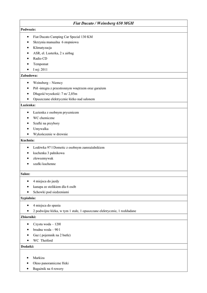 Fiat Ducato / Weinsberg 650 MGH Podwozie: ● Fiat Ducato Camping Car Special 130 KM ● Skrzynia manualna 6 stopniowa ● Klimatyzacja ● ASR, el. Lusterka, 2 x airbag ● Radio CD ● Tempomat ● I rej: 2011 Zabudowa: ● Weinsberg – Niemcy ● Pół -integra z przestronnym wnętrzem oraz garażem ● Długość/wysokość: 7 m/ 2,85m ● Opuszczane elektrycznie łóżko nad salonem Łazienka: ● Łazienka z osobnym prysznicem ● WC chemiczne ● Szafki na przybory ● Umywalka ● Wykończenie w drewnie Kuchnia: ● Lodówka 97 l Dometic z osobnym zamrażalnikiem ● kuchenka 3 palnikowa ● zlewozmywak ● szafki kuchenne Salon: ● 4 miejsca do jazdy ● kanapa ze stolikiem dla 6 osób ● Schowki pod siedzeniami Sypialnia: ● 4 miejsca do spania ● 2 podwójne łóżka, w tym 1 stałe, 1 opuszczane elektrycznie, 1 rozkładane Zbiorniki: ● Czysta woda – 120l ● brudna woda – 90 l ● Gaz ( pojemnik na 2 butle) ● WC Thetford Dodatki: ● Markiza ● Okno panoramiczne Heki ● Bagażnik na 4 rowery Fiat Ducato / Weinsberg 650 MGH ● TV DVD 15 '' 12 V ● Zestaw TV ● Pakiet Startowy ( przyłącz 230V, wąż do wody, płyn do WC, woda 30 % zbiornika ● Ubezpieczenie Auto Casco, OC, NW, zielona karta, assistance Generali LUX