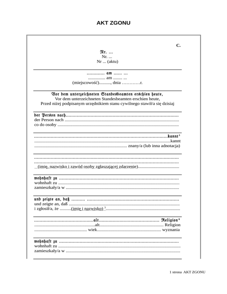 AKT ZGONU C. Nr. ... Nr. ... Nr ... (aktu) ............. am ...... ... ............... am ........ ... (miejscowość).........., dnia …………r. Vor dem unterzeichneten Standesbeamten erschien heute, Vor dem unterzeichneten Standesbeamten erschien heute, Przed niżej podpisanym urzędnikiem stanu cywilnego stawił/a się dzisiaj der Person nach.................................................................................. der Person nach .................................................................................................... co do osoby .......................................................................................................... .................................................................................................kannt 1 .......................................................................................................................kannt ................................................................................. znany/a (lub inna adnotacja) ......................................................................................................... ......................................................................................................... (imię, nazwisko i zawód osoby zgłaszającej zdarzenie).................................... wohnhaft zu ....................................................................................... wohnhaft zu .......................................................................................................... zamieszkały/a w ................................................................................................... und zeigte an, daß .......... ................................................................... und zeigte an, daß ................................................................................................. i zgłosił/a, że ..........(imię i nazwisko) 3................................................................. ...........................................alt............................................ Religion 4 .....................................................alt........................................................ Religion .............................................. wiek........................................................ wyznania wohnhaft zu ....................................................................................... wohnhaft zu ........................................................................................................... zamieszkały/a w .................................................................................................... 1 strona AKT ZGONU geboren zu ..........................................................................verheiratet geboren zu ...........................................................................................verheiratet urodzony/a w ......(miejscowość)................................................żonaty/zamężna5 ................ 6 de ............................................................................. 7 .................. de ....................................................................................................... adnotacja o tym, czyim synem, czyją żoną itd. była zmarła osoba zu ..................................................................................................... zu ........................................................................................................................... w ............................................................................................................................ am ..................................................... ten ........................................ am ................................................................. ten.................................................. dzień.............................................................., miesiąc.......................................... des Jahres tausend acht /neun hundert ................................................. des Jahres tausend acht /neun hundert .................................................................. tysiąc osiemset / dziewięćset …......................................................................... r. .......................................s 8 um ................................................... Uhr .................................................. um ............................................................... Uhr .................................................. o godz.. ............................................................... verstorben sei .................................................................................... verstorben sei ....................................................................................................... zmarł/a .................................................................................................................. Vorgelesen, genehmigt und ... Vorgelesen, genehmigt und ... Przeczytano, zatwierdzono i ... Der Standesbeamte Der Standesbeamte Urzędnik Stanu Cywilnego 2 strona AKT ZGONU 1 miejsce na adnotację o sposobie ustalenia tożsamości osoby zgłaszającej; (be kannt= znany/a) 3 geb. lub geborene = z domu; katholischer = „katolickiego“ ; evangelischer = „ewangelickiego“ verheiratet = żonaty/zamężna; un verheiratet = nieżonaty/niezamężna Sohn (Sohn) = syn; Ehemann (Ehemann) = mąż; Bruder (Bruder) = brat; Tochter (Tochter) = córka; Ehefrau (Ehefrau) = żona; Schwester (Schwester) = siostra: Schwiegermutter (Schwiegermutter) = teściowa; Schwiegervater ( Schwiegervater) = teść; Schwiegersohn (Schwiegersohn) = zięć; Schwiegertochter (Schwiegertochter) = synowa Mutter (Mutter) = matka; Vater (Vater) = ojciec 4 5 6 7 8 miejsce na imię i nazwisko przed przyimkiem „um“ (tłum. „o“) urzędnik wpisywał najczęściej porę dnia: Vormittags = przed południem; Nachmittags = po 