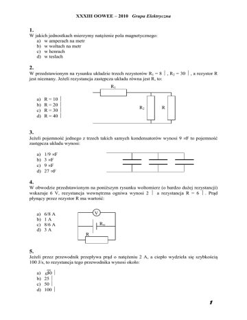 XXXIII OOWEE – 2010 Grupa Elektryczna 1. W jakich jednostkach mierzymy natężenie pola magnetycznego: a) w amperach na metr b) w woltach na metr c) w henrach d) w teslach 2. W przedstawionym na rysunku układzie trzech rezystorów R1 = 8 Ω, R2 = 30 Ω, a rezystor R jest nieznany. Jeżeli rezystancja zastępcza układu równa jest R, to: R1 a) b) c) d) R = 10 Ω R = 20 Ω R = 30 Ω R = 40 Ω R2 R 3. Jeżeli pojemność jednego z trzech takich samych kondensatorów wynosi 9 µF to pojemność zastępcza układu wynosi: a) b) c) d) 1/9 µF 3 µF 9 µF 27 µF 4. W obwodzie przedstawionym na poniższym rysunku woltomierz (o bardzo dużej rezystancji) wskazuje 6 V, rezystancja wewnętrzna ogniwa wynosi 2 Ω a rezystancja R = 6 Ω. Prąd płynący przez rezystor R ma wartość: a) b) c) d) V 6/8 A 1A 8/6 A 3A Rw R 5. Jeżeli przez przewodnik przepływa prąd o natężeniu 2 A, a ciepło wydziela się szybkością 100 J/s, to rezystancja tego przewodnika wynosi około: a) b) c) d) √50 Ω 25 Ω 50 Ω 100 Ω 1 XXXIII OOWEE – 2010 Grupa Elektryczna 6. Dwa przewody o długości 4 m ułożone równolegle, znajdują się w powietrzu w odległości 10 cm. Przez oba przewody płynie prąd o tym samym natężeniu równym 2 A. Przewody oddziałują na siebie z siłą F wynoszącą: a) F = 4π 10-6 N b) F = 32 10-6 N c) F = 2 10-7 N d) F = 16 10-6 N 7. Przez przewód prostoliniowy, nieskończenie długi, znajdujący się w powietrzu płynie prąd o natężeniu 10 A. W punkcie odległym od osi przewodu o 20 cm indukcja magnetyczna B wynosi: a) B = 10-5 T b) B = 1000 T c) B = µ0 10-5 T d) B = 10000 T 8. W obwodzie przedstawionym na poniższym rysunku R1 = 12 Ω, E1 =10 V, R2 =3 Ω, E2 =5 V; napięcie U na zaciskach ab wynosi: a) b) c) d) U=-5V U = 15 V U=-2V U= 8V 9. W obwodzie przedstawionym na poniższym rysunku Gw1= 2 S, Iż1 = 2 A, Gw2 = 3 S, Iż2 = 4 A, oraz G = 1 S; prąd I w gałęzi o konduktancji G wynosi: a) b) c) d) I=2A I=1A I=6A I=3A 10. W obwodzie przedstawionym na poniższym rysunku R1 = 5 Ω, E1 =10 V, R2 =3 Ω, E2 =20 V; oraz R3 = 2 Ω, U =30 V; moc P pobierana przez rezystory R1, R2, R3 wynosi: a) 40 W b) 20 W c) 100 W d) 80 W 2 XXXIII OOWEE – 2010 Grupa Elektryczna 11. Metodę superpozycji stosuje się do obliczania obwodów: a) tylko liniowych b) tylko nieliniowych c) zarówno liniowych jak i nieliniowych d) tylko w obwodach nierozgałęzionych 12. Na poniższym rysunku przedstawiono przebieg przyrostu temperatury przewodu podczas obciążenia a) logarytmicznie-zmiennego b) dorywczego c) przerywanego d) zwarciowego 13. Transformator elektroenergetyczny o danych: moc znamionowa SN = 1000 kVA, straty ∆Pcu = 10 kW, ∆PFe = 2 kW; pracuje przez cały czas bezawaryjnie i bezpostojowo. Wykres obciążenia transformatora przedstawiono na poniższym rysunku. W ciągu roku straty energii w rdzeniu wynoszą: a) 2 kWh b) 10 kWh c) 17520 kWh d) 4380 kWh 750 kVA 0 kVA 1 rok 14. Rezystancję transformatora można wyznaczyć z zależności: U2 a) RT = ∆Pcu ⋅ NT S NT U b) RT = ∆Pcu ⋅ 2NT S NT U c) RT = ∆Pcu ⋅ NT S NT d) RT = ∆Pcu ⋅ 2 U NT 2 S NT 3 XXXIII OOWEE – 2010 Grupa Elektryczna 15. W linii kablowej stosunek rezystancji do reaktancji wynosi 2:1, straty mocy czynnej wynoszą 30 W, straty mocy biernej będą: a) b) c) d) cztery razy większe cztery razy mniejsze równe 15 W równe 60 W 16. Kilowatogodzina energii jest pobierana przez odbiornik jednofazowy 120 omowy, w czasie 5 minut. Oznacza to, że natężenie prądu wynosi: a) b) c) d) 4A 2A 10 A 20 A 17. Napięcie dotykowe: a) jest to napięcie między dwoma punktami nie należącymi do obwodu elektrycznego, z którymi mogą się zetknąć jednocześnie obie ręce lub ręka i noga człowieka b) jest to napięcie między dwoma punktami na powierzchni ziemi lub na powierzchni stanowiska pracy, odległymi od siebie o 1 m c) jest to dostępna dla dotyku przewodząca część instalacji, która nie jest pod napięciem w warunkach normalnej pracy, a na której napięcie może pojawić się w wyniku uszkodzenia d) nazywa się spadek napięcia na rezystancji ciała człowieka przy przepływie przez niego prądu rażeniowego 18. Prace wykonywane na polecenie ustne to: a) wszystkie prace wykonywane w warunkach szczególnego zagrożenia życia i zdrowia ludzkiego b) prace, które nie wymagają polecenia pisemnego c) czynności związane z ratowaniem zdrowia i życia ludzkiego d) prace eksploatacyjne określone w instrukcjach wykonywanych przez uprawnione i upoważnione osoby 19. Dotyk pośredni nazywamy porażenie spowodowane: a) b) c) d) napięciem roboczym napięciem dotykowym niskim wysokim 4 XXXIII OOWEE – 2010 Grupa Elektryczna 20. W wyniku prostowania półfalowego otrzymamy prąd: a) stały b) zmienny okresowy c) przemienny d) nieokresowy 21. W wyniku prostowania całofalowego otrzymamy prąd: a) stały b) zmienny okresowy c) przemienny d) zmienny nieokresowy 22. Do maszyn indukcyjnych nie należy: a) b) c) d) prądnica asynchroniczna turbogenerator silnik klatkowy silnik pierścieniowy 23. Zależność przedstawia: a) b) c) d) wzór na moment krytyczny wzór na poślizg krytyczny wzór Klossa wzór Davenporta 24. Jeżeli poślizg w maszynie indukcyjnej jest mniejszy od „0” to maszyna pracuje jako: a) b) c) d) hamulec transformator silnik generator 25. Cechą generatora synchronicznego jest to, że poślizg: a) b) c) d) jest większy od 1 (jeden) jest mniejszy od 1 jest równy 1 nie występuje 5 XXXIII OOWEE – 2010 Grupa Elektryczna 26. Turbina wodna akcyjna to: a) b) c) d) turbina Peltona turbina Francisa turbina Kaplana turbina Tesli 27. W układzie trójfazowym symetrycznym przedstawionym na poniższym rysunku R = 30 Ω, XL = 40 Ω, Up = 400 V. Prąd przewodowy Ip wynosi: a) b) c) d) Ip = 8 A Ip = 4 A Ip = 8√3 A Ip =√3 A 28. Odbiorem w sieci trójfazowej niskiego napięcia jest silnik o mocy znamionowej P = 50 kW, cos ϕN = 0.8, przy rozruchu cos ϕR = 0.2 i współczynniku rozrychu k = 6, oraz sprawności