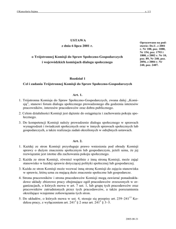 ©Kancelaria Sejmu s. 1/1 USTAWA Opracowano na podstawie: Dz.U. z 2001 r. Nr 100, poz. 1080, Nr 154, poz. 1793 i 1800, z 2002 r. Nr 10, poz. 89, Nr 240, poz. 2056, z 2004 r. Nr 240, poz. 2407. z dnia 6 lipca 2001 r. o Trójstronnej Komisji do Spraw Społeczno-Gospodarczych i wojewódzkich komisjach dialogu społecznego Rozdział 1 Cel i zadania Trójstronnej Komisji do Spraw Społeczno-Gospodarczych Art. 1. 1. Trójstronna Komisja do Spraw Społeczno-Gospodarczych, zwana dalej „Komisją”, stanowi forum dialogu społecznego prowadzonego dla godzenia interesów pracowników, interesów pracodawców oraz dobra publicznego. 2. Celem działalności Komisji jest dążenie do osiągnięcia i zachowania pokoju społecznego. 3. Do kompetencji Komisji należy prowadzenie dialogu społecznego w sprawach wynagrodzeń i świadczeń społecznych oraz w innych sprawach społecznych lub gospodarczych, a także realizacja zadań określonych w odrębnych ustawach. Art. 2. 1. Każdej ze stron Komisji przysługuje prawo wniesienia pod obrady Komisji sprawy o dużym znaczeniu społecznym lub gospodarczym, jeżeli uzna, że jej rozwiązanie jest istotne dla zachowania pokoju społecznego. 2. Każda ze stron Komisji, również wspólnie z inną stroną Komisji, może zająć stanowisko w każdej sprawie dotyczącej polityki społecznej lub gospodarczej. 3. Każda ze stron Komisji może wezwać inną stronę Komisji do zajęcia stanowiska w sprawie, którą uzna za mającą duże znaczenie społeczne lub gospodarcze. 4. Strona pracowników i strona pracodawców Komisji mogą zawierać ponadzakładowe układy zbiorowe pracy obejmujące ogół pracodawców zrzeszonych w organizacjach, o których mowa w art. 7 ust. 1, lub grupę tych pracodawców oraz pracowników zatrudnionych przez tych pracodawców, a także porozumienia określające wzajemne zobowiązania tych stron. 5. Do układów, o których mowa w ust. 4, stosuje się przepisy art. 239–24113 Kodeksu pracy, z wyłączeniem art. 2412 § 2 oraz art. 2419 § 3–5. 2005-08-31 ©Kancelaria Sejmu s. 2/2 Art. 2a. 1. Wszystkie strony Komisji mogą wspólnie zawierać porozumienia. 2. Przedmiotem porozumień są wzajemne zobowiązania stron służące realizacji celów, o których mowa w art. 1 ust. 1 i 2. 3. Porozumienia określają w szczególności: 1) czas obowiązywania, 2) tryb dokonywania zmian treści, 3) tryb rozwiązania, 4) przypadki wygaśnięcia, 5) tryb rozstrzygania kwestii spornych. Art. 2b. 1. Komisja może przekazać sprawę o zasięgu wojewódzkim, o której mowa w art. 1 ust. 3 i art. 2 ust. 1, wojewódzkiej komisji dialogu społecznego. 2. W sprawie przekazania komisja podejmuje uchwałę. Art. 3. 1. Strona rządowa, w terminie do dnia 10 maja każdego roku, przedstawia Komisji wstępną prognozę wielkości makroekonomicznych stanowiących podstawę do prac nad projektem ustawy budżetowej na rok następny. 2. Strony pracowników i pracodawców, w terminie do dnia 20 maja każdego roku, przedstawiają wspólną propozycję w sprawie wzrostu w następnym roku: 1) wynagrodzeń w gospodarce narodowej, w tym w państwowej sferze budżetowej oraz u przedsiębiorców, a także minimalnego wynagrodzenia za pracę, 2) emerytur i rent z Funduszu Ubezpieczeń Społecznych. 3. W przypadku gdy w terminie, o którym mowa w ust. 2, strony pracowników i pracodawców nie przedstawią wspólnej propozycji, każda z tych stron może, w terminie do dnia 25 maja, przedstawić swoją propozycję w każdej ze spraw, o których mowa w ust. 2. 4. W przypadku gdy w terminie, o którym mowa w ust. 3, strona nie przedstawi propozycji w sprawach, o których mowa w ust. 2, propozycję w każdej ze spraw może przedstawić, w terminie do dnia 30 maja, każda z organizacji, której przedstawiciele reprezentują stronę w Komisji. 5. Strona rządowa, w terminie do dnia 15 czerwca każdego roku, kieruje założenia projektu budżetu państwa na rok następny do Komisji w celu zajęcia stanowiska przez strony pracowników i pracodawców. 6. Strony pracowników i pracodawców zajmują, w terminie do dnia 20 lipca każdego roku, wspólne stanowisko w sprawie założeń projektu budżetu państwa na rok następny. 2005-08-31 ©Kancelaria Sejmu s. 3/3 7. W przypadku gdy w terminie, o którym mowa w ust. 6, strony nie uzgodnią wspólnego stanowiska, każda ze stron może, w terminie do dnia 25 lipca, zająć stanowisko w sprawie założeń projektu budżetu państwa na rok następny. 8. W przypadku gdy w terminie, o którym mowa w ust. 7, strona nie uzgodni stanowiska w sprawie założeń projektu budżetu państwa na rok następny, opinię w sprawie założeń projektu budżetu państwa na rok następny może przedstawić, w terminie do dnia 31 lipca, każda z organizacji, której przedstawiciele reprezentują stronę w Komisji. 9. Strona rządowa, nie później niż 20 dni przed przedstawieniem projektu ustawy budżetowej Sejmowi, kieruje projekt ustawy budżetowej na rok następny wraz z uzasadnieniem do Komisji w celu zajęcia stanowiska przez strony pracowników i pracodawców. 10. Strony pracowników i pracodawców zajmują wspólne stanowisko w sprawie projektu ustawy budżetowej na rok następny, nie później niż w 6 dniu roboczym po dniu, w którym otrzymały ten projekt. 11. W przypadku gdy w terminie, o którym mowa w ust. 10, strony nie uzgodnią wspólnego stanowiska, każda ze stron może, w ciągu następnych 3 dni roboczych, zająć stanowisko w sprawie projektu ustawy budżetowej na rok następny. 12. W przypadku gdy w terminie, o którym mowa w ust. 11, strona nie uzgodni stanowiska w sprawie projektu ustawy budżetowej na rok następny, opinię w sprawie projektu ustawy budżetowej na rok następny może przedstawić, w ciągu następnych 2 dni roboczych, każda z organizacji, której przedstawiciele reprezentują stronę w Komisji. 13. Terminy, o których mowa w ust. 1-8, Komisja może zmieniać na wniosek strony rządowej. 14. Nieprzedstawienie prop