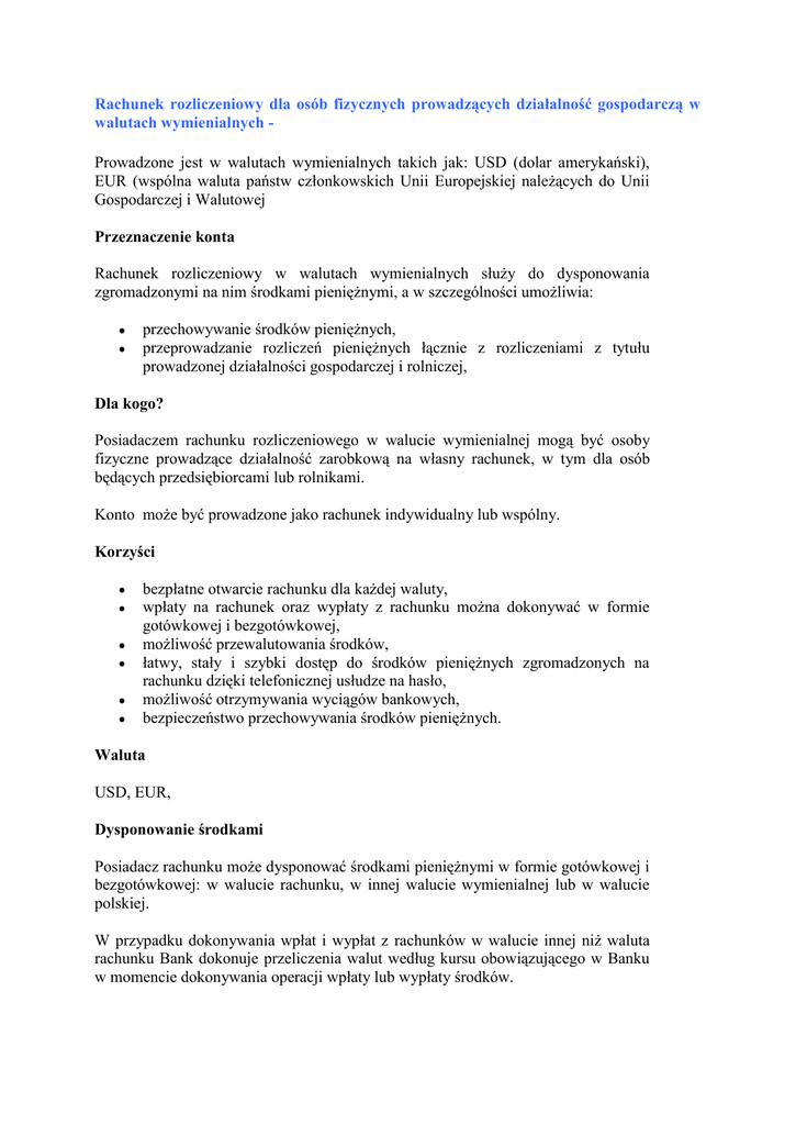Rachunek rozliczeniowy dla osób fizycznych prowadzących działalność gospodarczą w walutach wymienialnych Prowadzone jest w walutach wymienialnych takich jak: USD (dolar amerykański), EUR (wspólna waluta państw członkowskich Unii Europejskiej należących do Unii Gospodarczej i Walutowej Przeznaczenie konta Rachunek rozliczeniowy w walutach wymienialnych służy do dysponowania zgromadzonymi na nim środkami pieniężnymi, a w szczególności umożliwia: przechowywanie środków pieniężnych, przeprowadzanie rozliczeń pieniężnych łącznie z rozliczeniami z tytułu prowadzonej działalności gospodarczej i rolniczej, Dla kogo? Posiadaczem rachunku rozliczeniowego w walucie wymienialnej mogą być osoby fizyczne prowadzące działalność zarobkową na własny rachunek, w tym dla osób będących przedsiębiorcami lub rolnikami. Konto może być prowadzone jako rachunek indywidualny lub wspólny. Korzyści bezpłatne otwarcie rachunku dla każdej waluty, wpłaty na rachunek oraz wypłaty z rachunku można dokonywać w formie gotówkowej i bezgotówkowej, możliwość przewalutowania środków, łatwy, stały i szybki dostęp do środków pieniężnych zgromadzonych na rachunku dzięki telefonicznej usłudze na hasło, możliwość otrzymywania wyciągów bankowych, bezpieczeństwo przechowywania środków pieniężnych. Waluta USD, EUR, Dysponowanie środkami Posiadacz rachunku może dysponować środkami pieniężnymi w formie gotówkowej i bezgotówkowej: w walucie rachunku, w innej walucie wymienialnej lub w walucie polskiej. W przypadku dokonywania wpłat i wypłat z rachunków w walucie innej niż waluta rachunku Bank dokonuje przeliczenia walut według kursu obowiązującego w Banku w momencie dokonywania operacji wpłaty lub wypłaty środków. Dyspozycje do rachunku Pełnomocnictwo do dysponowania rachunkiem Posiadacz rachunku może ustanowić pełnomocnika uprawnionego do dysonowania rachunkiem. Pełnomocnikiem Posiadacza rachunku może być osoba fizyczna posiadająca pełną zdolność do czynności prawnych. Oprocentowanie Środki pieniężne zgromadzone na rachunku są nie oprocentowane.. Opłaty i prowizje Za świadczone czynności związane z obsługą rachunku Bank Spółdzielczy Bank Rolników „w Opolu pobiera prowizje i opłaty określone w "Taryfie prowizji i opłat bankowych w obrocie krajowym pobieranych przez Bank Spółdzielczy „Bank Rolników” w Opolu dla klientów indywidualnych oraz rolników ".
