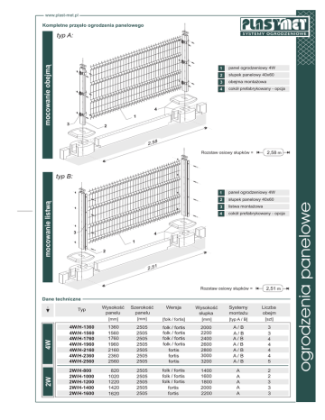 www.plast-met.pl Kompletne przês³o ogrodzenia panelowego mocowanie obejm¹ typ A: 1 panel ogrodzeniowy 4W 2 s³upek panelowy 40x60 3 obejma monta¿owa 4 cokó³ prefabrykowany - opcja 4 1 3 2 2,58 2,58 m Rozstaw osiowy s³upków = 3 1 panel ogrodzeniowy 4W 2 s³upek panelowy 40x60 3 listwa monta¿owa 4 cokó³ prefabrykowany - opcja 4 1 2 2,51 Rozstaw osiowy s³upków = 2,51 m Wysokoœæ panelu Szerokoœæ panelu Wersja Wysokoœæ s³upka Systemy monta¿u Liczba obejm [mm] [mm] [folk / fortis] [mm] [typ A / B] [szt] 4W 4W/H-1360 4W/H-1560 4W/H-1760 4W/H-1960 4W/H-2160 4W/H-2360 4W/H-2560 1360 1560 1760 1960 2160 2360 2560 2505 2505 2505 2505 2505 2505 2505 folk / fortis folk / fortis folk / fortis folk / fortis fortis fortis fortis 2000 2200 2400 2600 2800 3000 3200 A/B A/B A/B A/B A/B A/B A/B 3 3 4 4 4 4 5 2W Dane techniczne 2W/H-800 2W/H-1000 2W/H-1200 2W/H-1400 2W/H-1600 820 1020 1220 1420 1620 2505 2505 2505 2505 2505 folk / fortis folk / fortis folk / fortis fortis fortis 1400 1600 1800 2000 2200 A A A A A 2 2 3 3 3 Typ ogrodzenia panelowe mocowanie listw¹ typ B: www.plast-met.pl Modu³y wymiarowe i parametry paneli ogrodzeniowych 2W i 4W: 4W 2W 4W - 4 wzmocnienia 4W HxL-2505 2W - 2 wzmocnienia 2W HxL-2505 H 1360 1760 1560 1960 2160 H 2560 mm 2360 820 1020 1220 1620 mm 1420 Panel wykonany zgodnie z norm¹: 4W ( PKN 06-2005r. ) 2W [mm] 75 [mm] FORTIS nx200 H=820 - 1620 mm nx200 75 nx200 H = 4.0 mm V = 4.9 mm V = 4.9 mm 75 75 oczko: 50x200 mm 35 30 50x50 = 2500 mm H = 4.9 mm FOLK Œrednica prêtów nx200 75 H=1360 - 2560 mm H System monta¿u paneli do s³upków A przekrój A-A: poœrednia PLAST-MET 7 1 3 5 2 1 5 6 4 6 3 1 s³upek 40x60x2.0 xH [mm] 2 panel ogrodzeniowy 3 obejma monta¿owa 40x60 4 œruba zamkowa M8x25 / A2 5 nakrêtka zrywalna / A2 6 dystans / PE-H 7 kapturek nawierzchniowy / PE A A 4 rodzaje obejm monta¿owych mocowanie obejm¹ monta¿ow¹ 40x60 ogrodzenia panelowe nx200 V 35 nx200 75 30 EN 10223-7: 2002 poczatkowa naro¿na www.plast-met.pl System monta¿u paneli do s³upków B przekrój B-B: PLAST-MET 6 mocowanie listw¹ monta¿ow¹ 7 5 1 4 3 5 2 3 2 1 s³upek 40x60x2.0 xH [mm] 2 panel ogrodzeniowy 3 listwa monta¿owa 40x6 4 œruba zamkowa M8x80 / A2 5 nakrêtka zrywalna / A2 6 podk³adka 7 kapturek nawierzchniowy / PE B B 1 Cokó³ prefabrykowany - dane techniczne: beton monolityczny min. B-15 ( 2-8 mm) 2 205 25 3 1 3 lokalna strefa 0.80 - 1.40m przemarzania gruntu 380 185 50 1c 1b A= 2230 // B=2310 typ A = 2580 mm typ B = 2510 mm 1a Waga [kg] Materia³ stopa noœna 22,00 beton B-15 2 p³yta coko³owa 53,00 3 pokrywa 1 beton B-15 - zbrojony beton B-15 3,00 1a - stopa noœna (pustak) 1b - wpust na p³ytê coko³ow¹ 1c - gniazdo monta¿owe s³upka 25cm 10 150 100 Hs Dn = 20 ~ 6 +/- 0.00 na stopie stalowej 100x150 mm b 80 ~ 140 cm w monolitycznym fundamencie a mm Warianty utwierdzenia s³upków panelowych: ogrodzenia panelowe 2 www.plast-met.pl W wyniku procesu cynkowania ogniowego (k¹pieli w ciek³ym cynku o temp. 440-460 C) zachodzi na powierzchni cynkowanego elementu zjawisko dyfuzji tzn. stal i cynk tworz¹ wspóln¹ warstwê stopow¹, na której odk³ada siê warstwa czystego cynku. Zabezpieczenie antykorozyjne w systemie DUPLEX polega na na³o¿eniu na wczeœniej odpowiednio przygotowan¹ pow³okê cynkow¹ specjalnej pow³oki malarskiej. W systemie DUPLEX firmy PLAST-MET pow³ok¹ t¹ jest poliestrowy lakier proszkowy nak³adany metod¹ elektrostatyczn¹. Przygotowanie powierzchni ocynkowanej stali stanowi najistotniejszy element wp³ywaj¹cy na trwa³oœæ pow³oki malarskiej. Œwiadomi tego stosujemy obróbkê strumieniowo - œciern¹ lub inaczej omiatanie, które umo¿liwia uzyskanie najwy¿szego stopnia przyczepnoœci pow³oki malarskiej, a co za tym idzie najwy¿szej ich jakoœci. pow³oka cynkowa gr. ~ 100 - 120 um poliester gr. ~ 80 um kolorystyka standardowa: RAL 6005 / RAL 8017 / RAL 5010 / RAL 7030 / RAL 9005 / RAL 9010 Opcje, uwagi i rozwi¹zania specjalne: 1 wysiêgnik ( odkos ): opcja wyposa¿enia s³upka panelowego 40x60 w wysiêgnik pozwala jeszcze bardziej bardziej iskuteczniej zwiêkszyæ zabezpieczenie ogrodzonego terenu lub obiektu, mo¿e wystêpowaæ - w wersji pojedynczej lub podwójnej; - ustawiony do wewn¹trz lub na zewn¹trz ogrodzenia; - mo¿liwoœæ dowolnego wype³nienia panelem ogrodzeniowym lub drutem kolczastym 1, 2 lub 3 rzêdach. 2 uwagi: 2.1) panele ogrodzeniowe przeznaczone do wykonania ogrodzenia terenów szkó³, przedszkoli i przystanków autobusowych i innych zaleca siê wykonaæ wg specjalnego zlecenia polegaj¹cego na tym, i¿ panel pozbawiany jest górnych koñcówek drutów (grzebienia), zapobiegamy w ten sposób ewentualnej mo¿liwoœci zranienia osób mog¹cych w sposób niedozwolony przechodziæ przez ogrodzenie. 2.2) w przypadku monta¿u paneli ogrodzeniowych na odcinkach o d³ugoœci < 2.50 m, dokonujemy ich skrócenia w miejscu instalacji (na placu budowy). Czynnoœæ ciêcia paneli realizujemy za pomoc¹ no¿yc (umo¿liwiaj¹cych ciêcie prêtów do 8mm). Panel skracamy modularnie co 50 mm, mo¿liwie blisko zgrzewu. Przeciête prêty zabezpieczamy zaprawk¹ lakiernicz¹ w danym kolorze. 3 rozwi¹zania indywidualne: system paneli ogrodzeniowych dopuszcza mo¿liwoœæ dowolnej zabudowy w postaci: - kojców dla psów; - os³on œmietników; - pi³ko³apów ( ogrodzeñ > 2,56 m , zestawianych z podwójnych paneli ); - ogrodzeñ tymczasowych placu budowy. PLAST-MET Systemy Ogrodzeniowe / ul. Milicka 34, PL55-100 Trzebnica / tel. 0048 (071) 312 07 93 copyright by plast-met `2006 ogrodzenia panelowe ET T-M AS PL wszystkie elementy z³¹czne tj. œruba zamkowa M8x25 / 80 , nakrêtki ( zrywalne i szeœciok¹tne) wykonano ze stali nierdzewnej kl. A2 A2 RAL pow³oki: EN-ISO 1461 Elementy ogrodzenia panelowego sys. PLAS-MET: panele, s³upki, obejmy i listwy monta¿owe s¹ zabezpieczone antykorozyjnie pow³ok¹ cynkow¹ przez proces cynkowania ogniowego, œciœle wg norm: EN-ISO 1491 ( DIN 50976 ). EN-ISO 12944-5 DUPLEX C