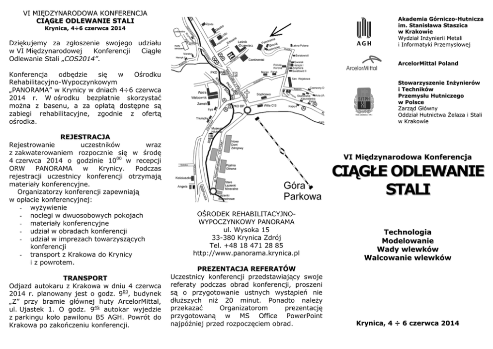 VI MIĘDZYNARODOWA KONFERENCJA CIĄGŁE ODLEWANIE STALI Akademia Górniczo-Hutnicza im. Stanisława Staszica w Krakowie Wydział Inżynierii Metali i Informatyki Przemysłowej Krynica, 4÷6 czerwca 2014 Dziękujemy za zgłoszenie swojego udziału w VI Międzynarodowej Konferencji Ciągłe Odlewanie Stali „COS2014”. ArcelorMittal Poland Konferencja odbędzie się w Ośrodku Rehabilitacyjno-Wypoczynkowym „PANORAMA” w Krynicy w dniach 4÷6 czerwca 2014 r. W ośrodku bezpłatnie skorzystać można z basenu, a za opłatą dostępne są zabiegi rehabilitacyjne, zgodnie z ofertą ośrodka. REJESTRACJA Rejestrowanie uczestników wraz z zakwaterowaniem rozpocznie się w środę 4 czerwca 2014 o godzinie 1000 w recepcji ORW PANORAMA w Krynicy. Podczas rejestracji uczestnicy konferencji otrzymają materiały konferencyjne. Organizatorzy konferencji zapewniają w opłacie konferencyjnej: - wyżywienie - noclegi w dwuosobowych pokojach - materiały konferencyjne - udział w obradach konferencji - udział w imprezach towarzyszących konferencji - transport z Krakowa do Krynicy i z powrotem. TRANSPORT Odjazd autokaru z Krakowa w dniu 4 czerwca 2014 r. planowany jest o godz. 900, budynek „Z” przy bramie głównej huty ArcelorMittal, ul. Ujastek 1. O godz. 945 autokar wyjedzie z parkingu koło pawilonu B5 AGH. Powrót do Krakowa po zakończeniu konferencji. Stowarzyszenie Inżynierów i Techników Przemysłu Hutniczego w Polsce Zarząd Główny Oddział Hutnictwa Żelaza i Stali w Krakowie VI Międzynarodowa Konferencja CIĄGŁE ODLEWANIE STALI OŚRODEK REHABILITACYJNOWYPOCZYNKOWY PANORAMA ul. Wysoka 15 33-380 Krynica Zdrój Tel. +48 18 471 28 85 http://www.panorama.krynica.pl PREZENTACJA REFERATÓW Uczestnicy konferencji przedstawiający swoje referaty podczas obrad konferencji, proszeni są o przygotowanie ustnych wystąpień nie dłuższych niż 20 minut. Ponadto należy przekazać Organizatorom prezentację przygotowaną w MS Office PowerPoint najpóźniej przed rozpoczęciem obrad. Technologia Modelowanie Wady wlewków Walcowanie wlewków Krynica, 4 ÷ 6 czerwca 2014 PROGRAM KONFERENCJI COS2014 4 czerwca /środa/ 2014 r. 10:00–13:00 Rejestracja uczestników w recepcji O.R.W. „PANORAMA” 13:00 Obiad (jadalnia, parter) 14:30–18:00 Obrady (sala konferencyjna, I p.) 14:30 Otwarcie konferencji 14:40 Marcin Rywotycki, Zbigniew Malinowski, Katarzyna Miłkowska-Piszczek, Andrzej Gołdasz, Beata Hadała Wpływ modelu radiacyjnej wymiany ciepła pomiędzy powierzchniami płaskimi na pole temperatury na przykładzie krystalizatora COS 15:00 Marek Warzecha, Tomasz Merder, Piotr Warzecha Metody RANS i LES a struktura przepływu w kadzi pośredniej 15:20 Katja Vrbek, Metod Marolt, Martin Debelak, Jakob Lamut, Matjaž Knap Changes in hydrogen content during steelmaking 15:40 Szymon Ostafin Sposoby zapobiegania przenoszenia żużla pomiędzy kolejnymi etapami produkcji slabów w cyklu produkcyjnym Zakładu Wielkie Piece i Stalownia Kraków 16:00–16:20 Przerwa kawowa 16:20 Tomasz Kargul, Ewa Wielgosz, Jan Falkus Zastosowanie wyników badań analizy termicznej w obliczeniach numerycznych procesów odlewania stali 16:40 Jacek Pieprzyca, Zdzisław Kudliński, Tomasz Merder Wpływ niejednorodności pól temperatury w kadzi pośredniej na strukturę pierwotną wlewków ciągłych 17:00 Krzysztof Konopka, Katarzyna MiłkowskaPiszczek, Lechosław Trębacz, Jan Falkus Poprawa wydajności obliczeń numerycznych symulacji COS poprzez wykorzystanie przetwarzania równoległego 17:20 Jarosław Skorupa CASTEMP® - korzyści stosowania ciągłego pomiaru temperatury w kadzi pośredniej 17:40–18:00 Dyskusje. Podsumowanie obrad 20:00 Uroczysta kolacja (jadalnia, parter) 5 czerwca /czwartek/ 2014 r. 8:00–10:00 Śniadanie (jadalnia, parter) 10:00–13:20 Obrady (sala konferencyjna, I p.) 10:00 Katarzyna Miłkowska-Piszczek, Marcin Rywotycki, Jan Falkus, Krzysztof Konopka Porównanie modeli opisujących wymianę ciepła w pierwotnej strefie chłodzenia maszyny COS 10:20 Jacek Pieprzyca, Tomasz Merder, Jan Jowsa Metoda wyznaczania stałych czasowych charakteryzujących intensywność mieszania się stali w kadzi pośredniej urządzenia COS 10:40 Jacek Gajda Zapobieganie wyciekom na maszynie ciągłego odlewania stali poprzez wykrywanie przyklejeń naskórka w krystalizatorze 11:00 Nejc Drofelnik, Metod Marolt, Matjaž Knap, Jakob Lamut Interrelation between steel melt and refractory materials in tundish 11:20–11:40 Przerwa kawowa 11:40 Marcin Bielnicki, Jan Jowsa, Adam Cwudziński Wielofazowy model numeryczny zachowania się ciekłej stali i żużla w krystalizatorze COS 12:00 Paweł Drożdż Analiza stanu równowagi zasypek w krystalizatorze podczas ciągłego odlewania stali 12:20 Adam Cwudziński Symulacja numeryczna i fizyczna zachowania się ciekłej stali w jednowylewowej kadzi pośredniej z podstrumieniowym regulatorem turbulencji 12:40 Andrzej Gołdasz Wpływ ekranowania na temperaturę szyn walcowanych w walcarce nawrotnej 13:00–13:20 Dyskusje. Podsumowanie obrad 14:00 Obiad (jadalnia, parter) 15:00–18:00 Sesja posterowa 20:00 Ognisko 6 czerwca /piątek/ 2014 r. 8:00–10:00 Śniadanie (jadalnia, parter) 10:00–12:00 Obrady (sala konferencyjna, I p.) 10:00 Marek Dziarmagowski, Krzysztof Konopka Polska terminologia procesu ciągłego odlewania stali 10:20 Włodzimierz Derda, Przemysław Pardela Zastosowanie stopów baru i wapnia w obróbce pozapiecowej wybranych gatunków stali odlewanych w sposób ciągły 10:40 Wojciech Ślęzak, Marta Korolczuk-Hejnak, Piotr Migas Wysokotemperaturowe pomiary reometryczne zasypek krystalizatorowych 11:00–11:20 Przerwa kawowa 11:20 Dyskusje. Podsumowanie konferencji 12:00 Zakończenie konferencji 13:00 Obiad (jadalnia, parter) 14:00 Odjazd do Krakowa