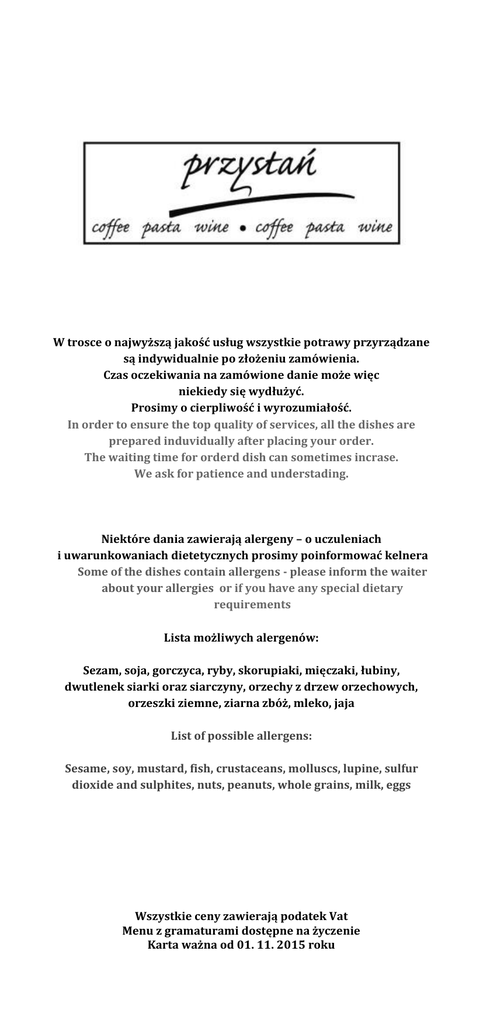 W trosce o najwyższą jakość usług wszystkie potrawy przyrządzane są indywidualnie po złożeniu zamówienia. Czas oczekiwania na zamówione danie może więc niekiedy się wydłużyć. Prosimy o cierpliwość i wyrozumiałość. In order to ensure the top quality of services, all the dishes are prepared induvidually after placing your order. The waiting time for orderd dish can sometimes incrase. We ask for patience and understading. Niektóre dania zawierają alergeny – o uczuleniach i uwarunkowaniach dietetycznych prosimy poinformować kelnera Some of the dishes contain allergens - please inform the waiter about your allergies or if you have any special dietary requirements Lista możliwych alergenów: Sezam, soja, gorczyca, ryby, skorupiaki, mięczaki, łubiny, dwutlenek siarki oraz siarczyny, orzechy z drzew orzechowych, orzeszki ziemne, ziarna zbóż, mleko, jaja List of possible allergens: Sesame, soy, mustard, fish, crustaceans, molluscs, lupine, sulfur dioxide and sulphites, nuts, peanuts, whole grains, milk, eggs Wszystkie ceny zawierają podatek Vat Menu z gramaturami dostępne na życzenie Karta ważna od 01. 11. 2015 roku Zupy / Soups Zupa dnia / Soup of the Day od / from 18 pln Zupa cebulowa z czerwonym winem, mieloną polędwicą wołową, tymiankiem i grzanką z serem Gruyere / Onion soup with red wine, minced beef fillet, thyme and toast with Gruyere cheese / 200g 19 pln Zimne przystawki / Cold starters Carpaccio wołowe / Beef Carpaccio Cieniutkie plastry marynowanej wołowiny podane w asyście płatków parmezanowych, kaparów, pomidorków cherry i rukoli skropione oliwą truflową oraz pistacjowym sosem vinaigrette / Thin slices of marinated beef accompanied by parmesan cheese, capers, cherry tomatoes and arugula sprinkled with truffle olive oil and pistachio vinaigrette sauce / 150g 36 pln Tatar z łososia / Salmon tartar Serwowany na carpaccio z ogórka z kaparami, cebulą oraz cytryną / Served with cucumber, capers, onion and lemon / 200g 34 pln Selekcja szlachetnych wędlin i serów / Selection of cold cuts and cheese (dla dwóch osób / for two)/ 300g 46 pln Ciepłe przystawki / Hot starters Krewetki chardonnay / Chardonnay prawns Krewetki tygrysie głębokomorskie w lekkim sosie chardonnay podane na bruschette verdure / Deepsea tiger prawns in light chardonnay sauce on bruschette verdure / 150g 32 pln Manzo al Cabernet Soczysta polędwica wołowa podana z truskawkami w karmelowym sosie cabernet sauvignon na łożu sałat z serem gorgonzola / Juicy slices of beef fillet served with strawberry in caramel cabernet sauvignon sauce with salads and gorgonzola cheese / 150g 40 pln Małże św.Jakuba / St.Jacob’s scalops Małże św. Jakuba w wyśmienitym sosie z białego Porto serwowane na chrupiącej sałacie / St. Jacob’s scalops served with delicious white Porto sauce and crispy salads / 150g 45 pln Bruschette Toskana Chrupiąca ciabatta podana z pastą z trufli z dodatkiem białej fasoli i rukoli posypana pudrem z szynki parmeńskiej / Crispy ciabatta served with truffle paste, white beans and fresh arugula with powder of Parma ham / 100g 21 pln Dania wegetariańskie / Vegetarian dishes Risotto z soczewicy z dynią / Lentils risotto with pumpkin Risotto z soczewicy podane z dynią, jarmużem i marchewką / Lentils risotto served with pumpkin, kale and carrot / 350g 36 pln Risotto z warzywami / Risotto with vegetables (czas oczekiwania 30 min/ waiting time 30 min) Risotto z warzywami z dodatkiem strużyn parmezanu / Risotto with vegetables and shaved parmesan / 350g 42 pln Makarony / Pasta Lasagne bolognese Warstwy makaronu przełożone mieloną polędwicą wołową zapieczone z serem i sosem pomidorowym / Layers of pasta and ground beef fillet baked with cheese and tomato sauce / 350g 38 pln Tagliatelle z łososiem i szpinakiem / Tagliatelle with salmon and spinach Makaron tagliatelle z kawałkami łososia i szpinakiem w delikatnym sosie śmietanowo-cytrynowym z dodatkiem świeżego szpinaku / Tagliatelle pasta with salmon and spinach in a delicate creamy lemon sauce with fresh spinach / 350g 35 pln Spaghetti z krewetkami tygrysimi/ Spaghetti with tiger prawns Spaghetti z krewetkami tygrysimi z dodatkiem cytrynowej oliwy, zielonego groszku i świeżej kolendry/ Spaghetti with tiger prawns, lemon olive oil, green peas and fresh coriander /350g 42 pln Sałatki / Salads Sałatka z krewetkami i ananasem / Salad with prawns and pineapple Różnorodne sałaty skropione sosem vinaigrette serwowane z ananasem i duszonymi w mleku kokosowym krewetkami / A variety of salads sprinkled with vinaigrette sauce served with pineapple and prawns stewed in coconut milk / 350g 42 pln Sałatka „Kapitańska” / „Captain's “salad Grillowane pałeczki polędwicy wołowej podane z serem taleggio, pomidorami, świeżym ogórkiem, prażonymi orzechami pinii na kruchych sałatach z sosem jogurtowym/ Grilled beef loin sticks served on fresh crispy salad with taleggio cheese, tomatoes, cucumber, roasted pine nuts and yoghurt sauce/ 350g 42 pln Sałatka „Przystań” / Przystań salad (House) Filet z soczystej piersi kaczki Barbarie podany na sałatach z dodatkiem truskawek, winogron, cząstek pomarańczy i płatków parmezanowych, skropiony malinowym vinaigrette/ Barbarie duck breast served with salads, strawberries, grapes, orange chunks and parmesan slices sprinkled with raspberry vinaigrette / 350g 36 pln Sałatka z kurczakiem / Chicken salad Mieszanka soczystych sałat podana z grillowanym kurczakiem w sosie miodowo- musztardowym z dodatkiem prażonych orzechów pinii, pomidorów i grissini, posypane ziołowymi grzankami / Salad mix served with grilled chicken in honey-mustard sauce, roasted pine nuts, tomatoes and breadsticks (grissini) sprinkled with croutons / 400g 33 pln Sałatka z wątróbką drobiową / Chicken liver salad Różnorodne kruche sałaty serwowane z wątróbką drobiową, cząstkami jabłek, pomarańczy i avocado posypane strużynami parmezanu / A va