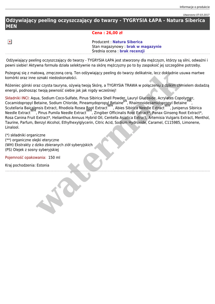 Informacje o produkcie Utworzono 07-03-2017 Odżywiający peeling oczyszczający do twarzy - TYGRYSIA ŁAPA - Natura Siberica MEN Cena : 26,00 zł Producent : Natura Siberica Stan magazynowy : brak w magazynie Średnia ocena : brak recenzji Odżywiający peeling oczyszczający do twarzy - TYGRYSIA ŁAPA jest stworzony dla mężczyzn, którzy są silni, odważni i pewni siebie! Aktywna formuła działa selektywnie na skórę mężczyzny po to by zaspokoić jej szczególne potrzeby. Pożegnaj się z matową, zmęczoną cerą. Ten odżywiający peeling do twarzy delikatnie, lecz dokładnie usuwa martwe komórki oraz inne oznaki niedoskonałości. er m ar k Różeniec górski oraz czysta tauryna, ożywią twoją Skórę, a TYGRYSIA TRAWA w połączeniu z dzikim chmielem dodadzą energii, podnosząc twoją pewność siebie jak jak nigdy wcześniej! Składniki INCI: Aqua, Sodium Coco-Sulfate, Pinus Sibirica Shell Powder, Lauryl Glucoside, Acrylates Copolymer, ps HR Cocamidopropyl Betaine, Sodium Chloride, Pineamydopropyl Betaine , Rhaimnoidesamidopropyl Betaine , WH WH Scutellaria Baicalensis Extract, Rhodiola Rosea Root Extract , Abies Sibirica Needle Extract , Juniperus Sibirica WH WH Needle Extract , Pinus Pumila Needle Extract , Zingiber Officinalis Root Extract*, Panax Ginseng Root Extract*, Rosa Canina Fruit Extract*, Helianthus Annuus Hybrid Oil, Centella Asiatica Extract, Artemisia Vulgaris Extract, Menthol, Taurine, Parfum, Benzyl Alcohol, Ethylhexylglycerin, Citric Acid, Sodium Hydroxide, Caramel, C115985, Limonene, Linalool. (*) składniki organiczne (**) organiczne olejki eteryczne (WH) Ekstrakty z dziko zbieranych ziół syberyjskich (PS) Olejek z sosny syberyjskiej Pojemność opakowania: 150 ml w at Kraj pochodzenia: Estonia