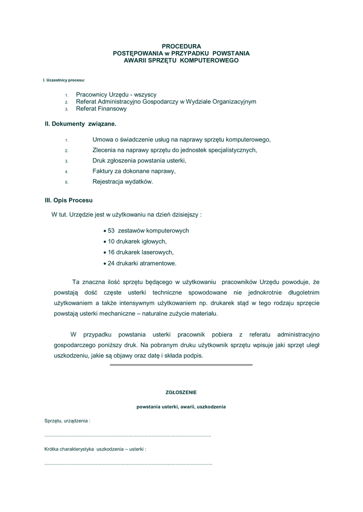 PROCEDURA POSTĘPOWANIA w PRZYPADKU POWSTANIA AWARII SPRZĘTU KOMPUTEROWEGO I. Uczestnicy procesu: 1. 2. 3. Pracownicy Urzędu - wszyscy Referat Administracyjno Gospodarczy w Wydziale Organizacyjnym Referat Finansowy II. Dokumenty związane. 1. Umowa o świadczenie usług na naprawy sprzętu komputerowego, 2. Zlecenia na naprawy sprzętu do jednostek specjalistycznych, 3. Druk zgłoszenia powstania usterki, 4. Faktury za dokonane naprawy, 5. Rejestracja wydatków. III. Opis Procesu W tut. Urzędzie jest w użytkowaniu na dzień dzisiejszy : 53 zestawów komputerowych 10 drukarek igłowych, 16 drukarek laserowych, 24 drukarki atramentowe. Ta znaczna ilość sprzętu będącego w użytkowaniu pracowników Urzędu powoduje, że powstają dość częste usterki techniczne spowodowane nie jednokrotnie długoletnim użytkowaniem a także intensywnym użytkowaniem np. drukarek stąd w tego rodzaju sprzęcie powstają usterki mechaniczne – naturalne zużycie materiału. W przypadku powstania usterki pracownik pobiera z referatu administracyjno gospodarczego poniższy druk. Na pobranym druku użytkownik sprzętu wpisuje jaki sprzęt uległ uszkodzeniu, jakie są objawy oraz datę i składa podpis. ZGŁOSZENIE powstania usterki, awarii, uszkodzenia Sprzętu, urządzenia : ........................................................................................................................... Krótka charakterystyka uszkodzenia – usterki : ............................................................................................................................ ............................................................................................................................ Zgłaszający : .......................................................... ( pracownik – imię nazwisko) .................................. ( data ) Opinia techniczna np. informatyka lub innej osoby uprawnionej w tym przewidywany koszt naprawy. .............................................................................................................................. .............................................................................................................................. Podjęto działanie przez ref. OAG Oddano do naprawy Data .............. do .......................................................................................... Przyjęto po naprawie Dnia ...................... stan techniczny ................................................................... ................................................................................................................................ Informatyk dokonuje oceny technicznej, jednocześnie określa orientacyjny koszt naprawy, aby stwierdzić, czy naprawa jest opłacalna dla Urzędu. Po dokonanych spisach referat administracyjno gospodarczy przekazuje sprzęt do naprawy. Po naprawie referat administracyjno gospodarczy – kierownik referatu, a w razie jego nieobecności informatyk, przyjmuje sprzęt stwierdza dokonanie naprawy, dokonuje wpisu w rejestrze wykonanych napraw sprzętu, przekazuje sprzęt do użytkownika. Kierownik referatu dokonuje opisu faktury, stwierdza pod względem merytorycznym, dokonuje wpisu w rejestrze wydatków, przekazuje fakturę do referatu finansowego, który dokona zapłaty.