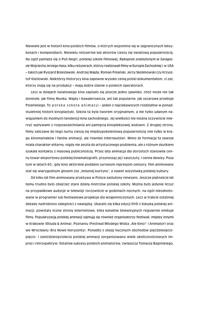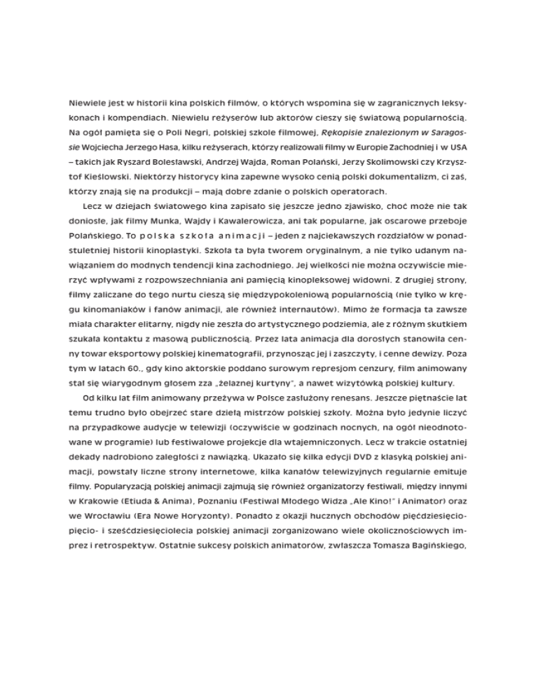 Niewiele jest w historii kina polskich filmów, o których wspomina się w zagranicznych leksykonach i kompendiach. Niewielu reżyserów lub aktorów cieszy się światową popularnością. Na ogół pamięta się o Poli Negri, polskiej szkole filmowej, Rękopisie znalezionym w Saragossie Wojciecha Jerzego Hasa, kilku reżyserach, którzy realizowali filmy w Europie Zachodniej i w USA – takich jak Ryszard Bolesławski, Andrzej Wajda, Roman Polański, Jerzy Skolimowski czy Krzysztof Kieślowski. Niektórzy historycy kina zapewne wysoko cenią polski dokumentalizm, ci zaś, którzy znają się na produkcji – mają dobre zdanie o polskich operatorach. Lecz w dziejach światowego kina zapisało się jeszcze jedno zjawisko, choć może nie tak doniosłe, jak filmy Munka, Wajdy i Kawalerowicza, ani tak popularne, jak oscarowe przeboje Polańskiego. To p o l s k a s z k o ł a a n i m a c j i – jeden z najciekawszych rozdziałów w ponadstuletniej historii kinoplastyki. Szkoła ta była tworem oryginalnym, a nie tylko udanym nawiązaniem do modnych tendencji kina zachodniego. Jej wielkości nie można oczywiście mierzyć wpływami z rozpowszechniania ani pamięcią kinopleksowej widowni. Z drugiej strony, filmy zaliczane do tego nurtu cieszą się międzypokoleniową popularnością (nie tylko w kręgu kinomaniaków i fanów animacji, ale również internautów). Mimo że formacja ta zawsze miała charakter elitarny, nigdy nie zeszła do artystycznego podziemia, ale z różnym skutkiem szukała kontaktu z masową publicznością. Przez lata animacja dla dorosłych stanowiła cenny towar eksportowy polskiej kinematografii, przynosząc jej i zaszczyty, i cenne dewizy. Poza tym w latach 60., gdy kino aktorskie poddano surowym represjom cenzury, film animowany stał się wiarygodnym głosem zza „żelaznej kurtyny”, a nawet wizytówką polskiej kultury. Od kilku lat film animowany przeżywa w Polsce zasłużony renesans. Jeszcze piętnaście lat temu trudno było obejrzeć stare dziełą mistrzów polskiej szkoły. Można było jedynie liczyć na przypadkowe audycje w telewizji (oczywiście w godzinach nocnych, na ogół nieodnotowane w programie) lub festiwalowe projekcje dla wtajemniczonych. Lecz w trakcie ostatniej dekady nadrobiono zaległości z nawiązką. Ukazało się kilka edycji DVD z klasyką polskiej animacji, powstały liczne strony internetowe, kilka kanałów telewizyjnych regularnie emituje filmy. Popularyzacją polskiej animacji zajmują się również organizatorzy festiwali, między innymi w Krakowie (Etiuda & Anima), Poznaniu (Festiwal Młodego Widza „Ale Kino!” i Animator) oraz we Wrocławiu (Era Nowe Horyzonty). Ponadto z okazji hucznych obchodów pięćdziesięciopięcio- i sześćdziesięciolecia polskiej animacji zorganizowano wiele okolicznościowych imprez i retrospektyw. Ostatnie sukcesy polskich animatorów, zwłaszcza Tomasza Bagińskiego, 6 Wstęp Mariusza Wilczyńskiego i Marka Skrobeckiego, oraz studia Se-Ma-For, w którym wyprodukowano oscarowy film Piotruś i wilk Suzie Templeton, sprawiły wrażenie, że wiele lat po sukcesach starych mistrzów, takich jak Lenica, Borowczyk, Szczechura i Rybczyński, film animowany pozostaje narodową specjalnością polskiej kultury. Wysoką pozycję polskiej animacji w świecie potwierdziła ankieta ASIFA (Association Internationale du Film d’Animation) z 2010 roku, rozpisana z okazji pięćdziesięciolecia tej organizacji. W pięćdziesiątce najważniejszych filmów powstałych po roku 1960 znalazło się aż sześć filmów z Polski (Labirynt Lenicy, Apel Czekały, Tango Rybczyńskiego, Refleksy i Strojenie instrumentów Kuci oraz Łagodna Dumały). Lepszym wynikiem mogła się pochwalić tylko kinematografia kanadyjska. Lecz nawet sześć filmów i druga pozycja w rankingu drużynowym pozostawiają niedosyt. Brakuje wielu arcydzieł, wielu nazwisk, bez których trudno sobie wyobrazić historię animacji autorskiej. Prawdziwa klęska urodzaju. ••• Książka ta nie jest standardową historią polskiej animacji, omawiającą tytuł za tytułem, nazwisko po nazwisku dzieje tej formy sztuki na przestrzeni kilkudziesięciu lat. Jest czymś mniej, a jednocześnie czymś więcej. M n i e j, gdyż dotyczy tylko tych zjawisk, które odegrały ważną rolę w dziejach kinoplastyki, pomija zaś – lub marginalizuje – to wszystko, co wtórne lub bez związku z głównym nurtem światowej animacji. Poza tym książka ta skupia się głównie na okresie od połowy lat 50. do końca lat 70. XX wieku, choć nie brak w niej nawiązań do przedwojennych prapoczątków, socrealistycznego przełomu czy współczesności. W i ę c e j, gdyż książka ta nie dotyczy tylko polskiej kinematografii. Moim celem było bowiem ukazanie zjawiska polskiej szkoły na tle artystycznej rewolucji, która nastąpiła w dziedzinie animacji po roku 1945. Starałem się również ukazać polską animację w kontekście przemian zachodzących w życiu politycznym i społecznym, jako specyficzną kronikę wydarzeń. Pytanie o poetykę polskiej szkoły animacji jest jednocześnie pytaniem o polską kulturę międzywojnia, PRL-u i okresu transformacji. Animacja – ta niezwykła sztuka istniejąca na pograniczu filmu, rzeczywistości i plastyki – może bowiem posłużyć jako soczewka, przez którą uważny widz dostrzeże coś, czego nie widać gołym okiem. Gdańsk, jesień 2006 – lato 2011