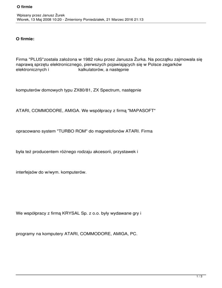 O firmie Wpisany przez Janusz Żurek Wtorek, 13 Maj 2008 10:20 - Zmieniony Poniedziałek, 21 Marzec 2016 21:13 O firmie: Firma "PLUS"została założona w 1982 roku przez Janusza Żurka. Na początku zajmowała się naprawą sprzętu elektronicznego, pierwszych pojawiających się w Polsce zegarków elektronicznych i kalkulatorów, a następnie komputerów domowych typu ZX80/81, ZX Spectrum, następnie ATARI, COMMODORE, AMIGA. We współpracy z firmą "MAPASOFT" opracowano system "TURBO ROM" do magnetofonów ATARI. Firma była też producentem różnego rodzaju akcesorii, przystawek i interfejsów do w/wym. komputerów. We współpracy z firmą KRYSAL Sp. z o.o. były wydawane gry i programy na komputery ATARI, COMMODORE, AMIGA, PC. 1/3 O firmie Wpisany przez Janusz Żurek Wtorek, 13 Maj 2008 10:20 - Zmieniony Poniedziałek, 21 Marzec 2016 21:13 Wraz z nastaniem ery komputerów PC firma zajmowała się głównie montażem, serwisem i sprzedażą domowego sprzętu tej klasy we współpracy z nieistniejącą już firmą "Bit -Plus". Z czasem działalność firmy przesunęła się w kierunku fizjoterapii, poradnictwa żywieniowego, elektroniki hobbystycznej, elektroniki użytkowej, sieci komputerowych i internetu w związku z czym firma w 2012r. zmieniła nazwę na "Arkadia Plus" pozostając nadal firmą rodzinną, a także przyjazną klientom. Prowadzenie firmy od 2010r. przejął Piotr Żurek (syn Janusza Żurka), a od 2013r. Joanna Bulsza (córka Janusza Żurka). 2/3 O firmie Wpisany przez Janusz Żurek Wtorek, 13 Maj 2008 10:20 - Zmieniony Poniedziałek, 21 Marzec 2016 21:13 Adres: "Arkadia Plus" ul. Saska 4 pok. 103. 30-720 Kraków tel. kom.: 691866368 Tel.: 12 396 3960, 12 396 3969 w godz. 19 - 21 kom.: 508 672 895 (w godz. 9 - 21) listy i zapytania: mailto:[email protected] 3/3