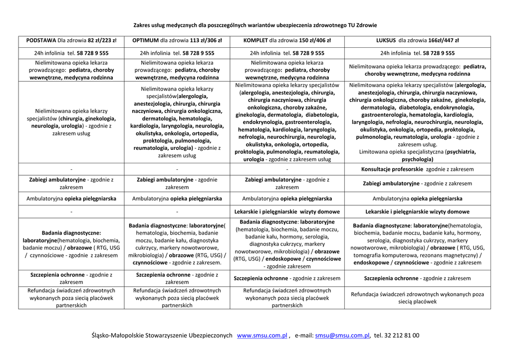 Zakres usług medycznych dla poszczególnych wariantów ubezpieczenia zdrowotnego TU Zdrowie PODSTAWA Dla zdrowia 82 zł/223 zł OPTIMUM dla zdrowia 113 zł/306 zł KOMPLET dla zdrowia 150 zł/406 zł LUKSUS dla zdrowia 166zł/447 zł 24h infolinia tel. 58 728 9 555 24h infolinia tel. 58 728 9 555 24h infolinia tel. 58 728 9 555 24h infolinia tel. 58 728 9 555 Nielimitowana opieka lekarza prowadzącego: pediatra, choroby wewnętrzne, medycyna rodzinna Nielimitowana opieka lekarza prowadzącego: pediatra, choroby wewnętrzne, medycyna rodzinna Nielimitowana opieka lekarzy specjalistów (chirurgia, ginekologia, neurologia, urologia) - zgodnie z zakresem usług Nielimitowana opieka lekarzy specjalistów(alergologia, anestezjologia, chirurgia, chirurgia naczyniowa, chirurgia onkologiczna, dermatologia, hematologia, kardiologia, laryngologia, neurologia, okulistyka, onkologia, ortopedia, proktologia, pulmonologia, reumatologia, urologia) - zgodnie z zakresem usług Nielimitowana opieka lekarza prowadzącego: pediatra, choroby wewnętrzne, medycyna rodzinna Nielimitowana opieka lekarzy specjalistów (alergologia, anestezjologia, chirurgia, chirurgia naczyniowa, chirurgia onkologiczna, choroby zakaźne, ginekologia, dermatologia, diabetologia, endokrynologia, gastroenterologia, hematologia, kardiologia, laryngologia, nefrologia, neurochirurgia, neurologia, okulistyka, onkologia, ortopedia, proktologia, pulmonologia, reumatologia, urologia - zgodnie z zakresem usług - - - Konsultacje profesorskie zgodnie z zakresem Zabiegi ambulatoryjne - zgodnie z zakresem Zabiegi ambulatoryjne - zgodnie zakresem Zabiegi ambulatoryjne - zgodnie z zakresem Zabiegi ambulatoryjne - zgodnie z zakresem Ambulatoryjna opieka pielęgniarska Ambulatoryjna opieka pielęgniarska Ambulatoryjna opieka pielęgniarska Ambulatoryjna opieka pielęgniarska - - Lekarskie i pielęgniarskie wizyty domowe Lekarskie i pielęgniarskie wizyty domowe Badania diagnostyczne: laboratoryjne(hematologia, biochemia, badanie moczu) / obrazowe ( RTG, USG / czynnościowe - zgodnie z zakresem Badania diagnostyczne: laboratoryjne( hematologia, biochemia, badanie moczu, badanie kału, diagnostyka cukrzycy, markery nowotworowe, mikrobiologia) / obrazowe (RTG, USG) / czynnościowe - zgodnie z zakresem. Badania diagnostyczne: laboratoryjne (hematologia, biochemia, badanie moczu, badanie kału, hormony, serologia, diagnostyka cukrzycy, markery nowotworowe, mikrobiologia) / obrazowe (RTG, USG) / endoskopowe / czynnościowe - zgodnie zakresem Badania diagnostyczne: laboratoryjne(hematologia, biochemia, badanie moczu, badanie kału, hormony, serologia, diagnostyka cukrzycy, markery nowotworowe, mikrobiologia) / obrazowe ( RTG, USG, tomografia komputerowa, rezonans magnetyczny) / endoskopowe / czynnościowe - zgodnie z zakresem Szczepienia ochronne - zgodnie z zakresem Refundacja świadczeń zdrowotnych wykonanych poza siecią placówek partnerskich Szczepienia ochronne - zgodnie z zakresem Refundacja świadczeń zdrowotnych wykonanych poza siecią placówek partnerskich Szczepienia ochronne - zgodnie z zakresem Szczepienia ochronne - zgodnie z zakresem Refundacja świadczeń zdrowotnych wykonanych poza siecią placówek partnerskich Refundacja świadczeń zdrowotnych wykonanych poza siecią placówek Nielimitowana opieka lekarza prowadzącego: pediatra, choroby wewnętrzne, medycyna rodzinna Nielimitowana opieka lekarzy specjalistów (alergologia, anestezjologia, chirurgia, chirurgia naczyniowa, chirurgia onkologiczna, choroby zakaźne, ginekologia, dermatologia, diabetologia, endokrynologia, gastroenterologia, hematologia, kardiologia, laryngologia, nefrologia, neurochirurgia, neurologia, okulistyka, onkologia, ortopedia, proktologia, pulmonologia, reumatologia, urologia - zgodnie z zakresem usług. Limitowana opieka specjalistyczna (psychiatria, psychologia) Śląsko-Małopolskie Stowarzyszenie Ubezpieczonych www.smsu.com.pl , e-mail: [email protected], tel. 32 212 81 00