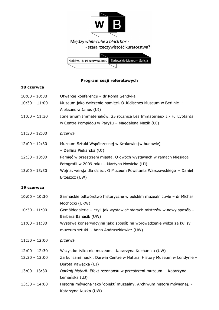 Program sesji referatowych 18 czerwca 10:00 - 10:30 Otwarcie konferencji – dr Roma Sendyka 10:30 – 11:00 Muzeum jako ćwiczenie pamięci. O Jüdisches Museum w Berlinie Aleksandra Janus (UJ) 11:00 – 11:30 Itinerarium Immaterialiów. 25 rocznica Les Immateriaux J.- F. Lyotarda w Centre Pompidou w Paryżu – Magdalena Mazik (UJ) 11:30 - 12:00 przerwa 12:00 - 12:30 Muzeum Sztuki Współczesnej w Krakowie (w budowie) – Delfina Piekarska (UJ) 12:30 - 13:00 Pamięć w przestrzeni miasta. O dwóch wystawach w ramach Miesiąca Fotografii w 2009 roku – Martyna Nowicka (UJ) 13:00 - 13:30 Wojna, wersja dla dzieci. O Muzeum Powstania Warszawskiego – Daniel Brzeszcz (UW) 19 czerwca 10:00 – 10:30 Sarmackie odtwórstwo historyczne w polskim muzealnictwie – dr Michał Mochocki (UKW) 10:30 - 11:00 Gemäldegalerie – czyli jak wystawiać starych mistrzów w nowy sposób – Barbara Banasik (UW) 11:00 - 11:30 Wystawa konserwacyjna jako sposób na wprowadzenie widza za kulisy muzeum sztuki. - Anna Andruszkiewicz (UW) 11:30 – 12:00 przerwa 12:00 – 12:30 Wszystko tylko nie muzeum - Katarzyna Kucharska (UW) 12:30 – 13:00 Za kulisami nauki. Darwin Centre w Natural History Museum w Londynie – Dorota Kawęcka (UJ) 13:00 - 13:30 Dotknij historii. Efekt rezonansu w przestrzeni muzeum. - Katarzyna Lemańska (UJ) 13:30 – 14:00 Historia mówiona jako ‘obiekt’ muzealny. Archiwum historii mówionej. Katarzyna Kuzko (UW)
