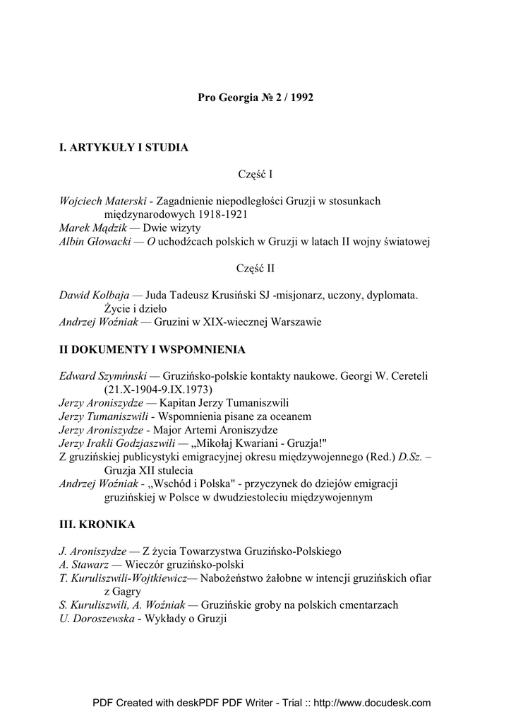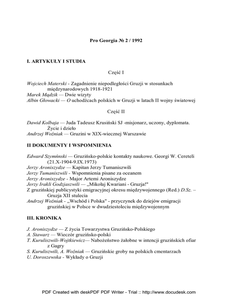 3UR*HRUJLD ,$57<.8à<,678',$ &] ü, Wojciech Materski -=DJDGQLHQLHQLHSRGOHJáRFL*UX]MLZVWRVXQNDFK PL G]\QDURGRZ\FK-1921 0DUHN0G]LN— Dwie wizyty $OELQ*áRZDFNL— OXFKRG(FDFKSROVNLFKZ*UX]MLZODWDFK,,ZRMQ\ZLDWRZHM &] ü,, Dawid Kolbaja —-XGD7DGHXV].UXVLVNL6--misjonarz, uczony, dyplomata. )\FLHLG]LHáR $QGU]HM:R(QLDN— Gruzini w XIX-wiecznej Warszawie II DOKUMENTY I WSPOMNIENIA (GZDUG6]\PQVNL—*UX]LVNR-polskie kontakty naukowe. Georgi W. Cereteli (21.X-1904-9.IX.1973) Jerzy Aroniszydze — Kapitan Jerzy Tumaniszwili Jerzy Tumaniszwili - Wspomnienia pisane za oceanem Jerzy Aroniszydze - Major Artemi Aroniszydze Jerzy Irakli Godzjaszwili —Ä0LNRáDM.ZDULDQL- Gruzja!" =JUX]LVNLHMSXEOLF\VW\NLHPLJUDF\MQHMRNUHVXPL G]\ZRMHQQHJR5HGD.Sz. – Gruzja XII stulecia $QGU]HM:R(QLDN- „Wschód i Polska" - przyczynek do dziejów emigracji JUX]LVNLHMZ3ROVFHZGZXG]LHVWROHFLXPL G]\ZRMHQQ\P III. KRONIKA J. Aroniszydze —=*\FLD7RZDU]\VWZD*UX]LVNR-Polskiego A. Stawarz —:LHF]yUJUX]LVNR-polski T. Kuruliszwili-Wojtkiewicz—1DER*HVWZR*DáREQHZLQWHQFMLJUX]LVNLFKRILDU z Gagry 6.XUXOLV]ZLOL$:R(QLDN—*UX]LVNLHJURE\QDSROVNLFKFPHQWDU]DFK U. Doroszewska -:\NáDG\R*UX]ML PDF Created with deskPDF PDF Writer - Trial :: http://www.docudesk.com M. Kobalja, N. Kortua, E. Wos — Polonica w zbiorach Muzeum Historycznego w Zugdidi IV. RECENZJE I OMÓWIENIA -DNXE&XUWDZHOL0 F]HVWZRZ6]XV]DQLNWá(%LHGND.UDNyZA W. Guram Lordkipanidze, Biczwinlis nakalakari, Tbilisi 1991, D. Kolbaja Andrzej DraZLF]3RFDáXQHNQDPUR]LHàyG(A. Milewska Gruzini w Wojsku Polskim, 5RODQG0á\QLN 0QLHMV]RFLSROVNLHL3RORQLDZ=655SRGUHG+.XELDNDLLQ:URFáDZ A.W. PDF Created with deskPDF PDF Writer - Trial :: http://www.docudesk.com