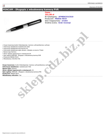 Informacje o produkcie Utworzono 07-03-2017 PENCAM - Długopis z wbudowaną kamerą PVR Cena : 101,99 zł ● ● ● ● ● ● ● dz ● Grupa towarowa:Audio Video\Aparaty i kamery cyfrowe\Kamery cyfrowe Informacje dodatkowe:rozdzielczość VGA Informacje dodatkowe:tryb kamery PC Informacje dodatkowe:zapis obrazu i dźwięku na karcie T-flash Nazwa typu:Kamery Okres rękojmi (gwarancji) w miesiącach:24 Opis ogólny:PENCAM - Długopis z wbudowaną kamerą PVR Producent:MEDIA-TECH Wbudowany mikrofon:Tak .b ● iz .p l Nr katalogowy : AFMEKC01C010 Producent : MEDIA-TECH Stan magazynowy : średni Średnia ocena : brak recenzji sk le p .c Grupa towarowa: Audio Video\Aparaty i kamery cyfrowe\Kamery cyfrowe Informacje dodatkowe: rozdzielczość VGA Nazwa typu: Kamery Okres rękojmi (gwarancji) w miesiącach: 24 Opis ogólny: PENCAM - Długopis z wbudowaną kamerą PVR Producent: MEDIA-TECH Wbudowany mikrofon: Tak Wygenerowano w programie www.oscGold.com