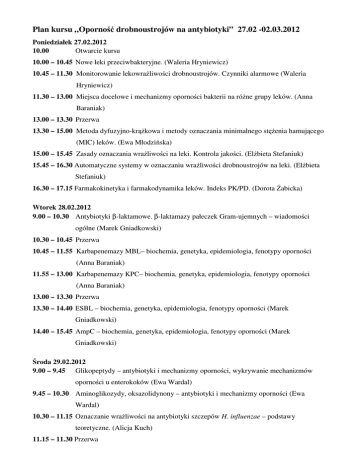 Plan kursu „Oporność drobnoustrojów na antybiotyki” 27.02 -02.03.2012 Poniedziałek 27.02.2012 10.00 Otwarcie kursu 10.00 – 10.45 Nowe leki przeciwbakteryjne. (Waleria Hryniewicz) 10.45 – 11.30 Monitorowanie lekowrażliwości drobnoustrojów. Czynniki alarmowe (Waleria Hryniewicz) 11.30 – 13.00 Miejsca docelowe i mechanizmy oporności bakterii na różne grupy leków. (Anna Baraniak) 13.00 – 13.30 Przerwa 13.30 – 15.00 Metoda dyfuzyjno-krążkowa i metody oznaczania minimalnego stężenia hamującego (MIC) leków. (Ewa Młodzińska) 15.00 – 15.45 Zasady oznaczania wrażliwości na leki. Kontrola jakości. (Elżbieta Stefaniuk) 15.45 – 16.30 Automatyczne systemy w oznaczaniu wrażliwości drobnoustrojów na leki. (Elżbieta Stefaniuk) 16.30 – 17.15 Farmakokinetyka i farmakodynamika leków. Indeks PK/PD. (Dorota Żabicka) Wtorek 28.02.2012 9.00 – 10.30 Antybiotyki β-laktamowe. β-laktamazy pałeczek Gram-ujemnych – wiadomości ogólne (Marek Gniadkowski) 10.30 – 10.45 Przerwa 10.45 – 11.55 Karbapenemazy MBL– biochemia, genetyka, epidemiologia, fenotypy oporności (Anna Baraniak) 11.55 – 13.00 Karbapenemazy KPC– biochemia, genetyka, epidemiologia, fenotypy oporności (Anna Baraniak) 13.00 – 13.30 Przerwa 13.30 – 14.40 ESBL – biochemia, genetyka, epidemiologia, fenotypy oporności (Marek Gniadkowski) 14.40 – 15.45 AmpC – biochemia, genetyka, epidemiologia, fenotypy oporności (Marek Gniadkowski) Środa 29.02.2012 9.00 – 9.45 Glikopeptydy – antybiotyki i mechanizmy oporności, wykrywanie mechanizmów oporności u enterokoków (Ewa Wardal) 9.45 – 10.30 Aminoglikozydy, oksazolidynony – antybiotyki i mechanizmy oporności (Ewa Wardal) 10.30 – 11.15 Oznaczanie wrażliwości na antybiotyki szczepów H. influenzae – podstawy teoretyczne. (Alicja Kuch) 11.15 – 11.30 Przerwa 11.30 – 12.00 Oznaczanie wrażliwości Streptococcus pneumoniae na antybiotyki β-laktamowe podstawy teoretyczne. (Radosław Izdebski) 12.00- 13.00 Oporność gronkowców na antybiotyki β-laktamowe, glikopeptydy i linezolid – mechanizmy oporności, genetyka, epidemiologia. (Aleksandra Kozińska) 13.00 – 13.45 Makrolidy. Linkozamidy. Streptograminy. Ketolidy. Oporność paciorkowców na makrolidy, linkozamidy, streptograminy i ketolidy (Aleksandra Kozińska) 13.45 – 14.15 Przerwa 14.15 - 17.00 Ćwiczenia praktyczne, część I wykonanie badań: wykrywanie karbapenemaz MBL i β-laktamazy KPC oraz ESBL i AMPC, oznaczanie wrażliwości S. pneumoniae na penicylinę, oznaczanie wrażliwości gronkowców na meticylinę i glikopeptydy, oznaczanie wrażliwości na antybiotyki β-laktamowe szczepów H.influenzae. Mechanizm oporności MLSB u paciorkowców – demonstracje, odczyt i interpretacja wyników (Anna Baraniak, Alicja Kuch, Radosław Izdebski, Katarzyna Bojarska, Aleksandra Kozińska, Dorota Żabicka) Czwartek 01.02.2012 9.00 – 9.45 Oznaczanie wrażliwości grzybów (Dorota Żabicka) 9.45 – 10.30 Chinolony – antybiotyki i mechanizmy oporności (Katarzyna Bojarska) 10.30 – 11.15 Oznaczanie wrażliwości bakterii beztlenowych (Katarzyna Bojarska) 11.15 – 11.30 Przerwa 11.30 – 12.15 Tetracykliny, kwas fusidowy, rifampicyna, chloramfenikol - antybiotyki i mechanizmy oporności. (Elżbieta Literacka) 12.15 – 13.00 Definicje i fenotypy MDR, XDR, PDR (Dorota Żabicka) 13.00 – 13.45 Rekomendacje doboru testów do oznaczania wrażliwości bakterii na antybiotyki i chemioterapeutyki. (Dorota Żabicka) 13.45 – 14.15 Przerwa 14.15 – 17.00 Odczyt i interpretacja wyników oznaczania lekowrażliwości. z dnia poprzedniego. Wykrywanie oporności na glikopeptydy u enterokoków – demonstracja. (Anna Baraniak, Alicja Kuch, Radosław Izdebski, Katarzyna Bojarska, Ewa Wardal, Dorota Żabicka) Piątek 02.02.2012 8.30 – 10.00 Racjonalna antybiotykoterapia (Waleria Hryniewicz) 10.00– 10.45 Interpretacja wyników badań mikrobiologicznych i oznaczania lekowrażliwości. (Dorota Żabicka) 10.45 – 11.00. Przerwa 11.00 – 11.45 Sprawdzian wiadomości. Omówienie sprawdzianu wiadomości. Zakończenie kursu. (Dorota Żabicka)