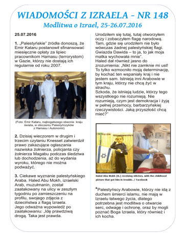 WIADOMOŚCI Z IZRAELA - NR 148 Modlitwa o Izrael, 25-26.07.2016 25.07.2016 1. „Palestyńskie” źródła donoszą, że Emir Kataru postanowił sfinansować miesięczne opłaty za lipiec pracownikom Hamasu (terrorystom) w Gazie, którzy nie dostają ich regularnie od roku 2007. Urodziłem się tutaj, tutaj otworzyłem oczy i zobaczyłem flagę narodową. Tam, gdzie się urodziłem nie było wówczas żadnej palestyńskiej flagi. Gwiazda Dawida – to ja, to jak moja matka wychowała mnie”. Haled dał również jasno do zrozumienia: „Nikt nie zamknie mi ust! To tylko wzmocniło moją determinację, by kochać ten wspaniały kraj i nie jestem sam. Istnieją inni Arabowie w tym kraju, którzy nie chcą żyć w strachu. Szkoda, że istnieją ludzie, którzy tego wszystkiego nie rozumieją. Nie rozumieją, czym jest demokracja i żyją w pełnej przemocy, barbarzyńskiej rzeczywistości. Jaką przyszłość chcą mieć?” (Foto: Emir Kataru, najbogatszego obecnie kraju świata, w otoczeniu Palestyńczyków z Hamasu i Autonomii) 2. Dzisiaj wieczorem w drugim i trzecim czytaniu Knesset zatwierdził prawo zakazujące ogłaszania nazwiska żołnierza, policjanta czy żołnierza Magabu podczas śledztwa lub dochodzenia, aż do wydania wyroku, którego nie można podważyć. 3. Ciekawe wyznanie palestyńskiego Araba. Haled Abu Mokh, izraelski Arab, muzułmanin, został zaatakowany na ulicy w zeszłym tygodniu po zamieszczeniu na profilu, swojego zdjęcia z dzieciństwa z flagą Izraela. Jego odważna wypowiedź po zaatakowaniu: „Idę prawdziwą drogą. Taka jest prawda. *Palestyńscy Arabowie, którzy nie idą z duchem śmierci islamu, nie mają w Izraelu łatwego życia, dlatego potrzebna jest modlitwa o otwarcie serc, odwagę i ochronę, oraz by mogli poznać Boga Izraela, który również i ich kocha. 4. Dzisiaj wczesnym wieczorem na tereny Izraela na Golanie spadła rakieta wystrzelona w miejscowości Qunaitra podczas walk w Syrii pomiędzy siłami Assada i tzw. rebeliantami. Nikt nie został ranny. W odpowiedzi dwa izraelskie samoloty ostrzelały miejsce, z którego wyleciały rakiety. IDF poinformowały, że nie będą tolerowały żadnych prób uderzenia w suwerenność państwa Izrael i bezpieczeństwo jego obywateli. systemów i dostaw broni, że przestaliśmy myśleć twórczo pod względem operacyjnym”. *W czasie ostatniej wojny z Gazą dwa lata temu (co nie było rozgłaszane w mediach), prezydent Obama wstrzymał dostawy amunicji dla Izraela. Zmusiło to wojsko izraelskie do zakończenia działań. (Foto: W tle Qunaitra w Syrii, wrzesień 2015) 26.07.2016 5. Gershon Hacohen, generał rezerwy, w wywiadzie dla „Defense news” powiedział, że współpraca izraelsko-amerykańska będzie silniejsza i byłoby lepiej dla wszystkich stron, gdyby Izrael znalazł drogę do uniezależnienia się od pomocy amerykańskiej. Hacohen, który w przeszłości był dowódcą korpusu sztabu generalnego i dowódcą uczelni wojskowych oraz dowodził ewakuacją Gush Katif, podkreślił, że jego zdaniem Izrael powinien przyjąć stopniowe zmniejszenie pomocy, a nie jej zwiększenie: „Wymaga to silnego przywództwa, ale jeśli zostanie to zrobione drogą przemyślenia i dobrego planowania, przywróci to naszą suwerenność, samodzielność i możliwości naszego przemysłu… Izrael jest tak uzależniony od amerykańskich zaawansowanych (Foto: Gen. Gerszon Hacohen) 6. Terrorystyczna organizacja Dżabhat an-Nusra zawiadomiła, że oddziela się od al. Kaidy. *W praktyce oznacza to jeszcze jedno ugrupowanie walczące w Syrii o swoje wpływy. (Foto: Terroryści z an-Nusry w Syrii) 7. Po raz pierwszy od lat policja i krajowa jednostka planowania i budowy, zburzyły 20 nielegalnych budynków we wschodnich dzielnicach Jerozolimy Issawiye i Qalandii. Budynki znajdowały się koło muru odgradzającego, nie były zamieszkane i w większości znajdowały się w końcowym etapie budowy. Nie było rozruchów. chcąc utrwalać i rozwijać palestyńską obecność na tym rdzennie żydowskim terenie zwanym w Biblii „Judeą”. *Jak do tej pory izraelskie władze wyburzały jedynie żydowskie domy wybudowane bez pozwolenia, mimo że w jeszcze więcej nielegalnych budowli jest wciąż budowanych przez Palestyńczyków, co wywoływało wiele protestów. Wiadomości oraz zdjęcia zebrał Jarosław Papiór Korekta oraz opracowanie graficzne Stowarzyszenie Służba Szalom w Oświęcimiu 8. Unia Europejska wybudowała ponownie, niezgodnie z prawem, kolejne budynki dla Arabów w pobliżu żydowskich osiedli koło Hebronu,