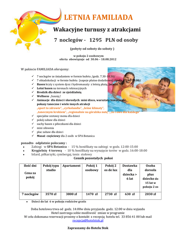 LETNIA FAMILIADA Wakacyjne turnusy z atrakcjami 7 noclegów - 1295 PLN od osoby (pobyty od soboty do soboty ) w pokoju 2 osobowym oferta obowiązuje od 30.06 – 18.08.2012 W pakiecie FAMILIADA oferujemy: 7 noclegów ze śniadaniem w formie bufetu /godz. 7.30-10.30/ 7 obiadokolacji w formie bufetu (napoje płatne dodatkowo) /godz. 17.30-20.00/ Basen kryty z system dysz i hydromasaży z letnią plażą, Jacuzzi Letni basen na terenach rekreacyjnych Brodzik dla dzieci ze zjeżdżalnią Wellness /sauny/ Animacje dla dzieci i dorosłych: mini disco, warsztaty tematyczne, pokazy taneczne i wiele innych atrakcji „sport to zdrowie”, „cyrkolandia”, „leśne klimaty”, „tanecznym krokiem”, „regionalnie na góralska nutę”, „to i owo dla każdego” specjalne zestawy menu dla dzieci pokój zabaw dla dzieci suchy basen z piłeczkami dla dzieci mini siłownia plac zabaw dla dzieci Masaż częściowy dla 2 osób w SPA Botanica ponadto odpłatnie polecamy : Zabiegi w SPA Botanica - 15 % bonifikaty na zabiegi w godz. 12:00-15:00 Kręgielnię 4 torową - 10 % bonifikaty na wynajęcie torów w godz. 16:00-18:00 bilard, piłkarzyki, cymbergaj, tenis stołowy Cennik pozostałych pokoi Ilość dni Cena za pokój Pokój typu studio Apartament Pokój 1 osobowy Pokój 2 os de lux Dostawka dla dziecka > 6 lat Osoba dorosła plus dziecko do 15 lat w pokoju 2 os 7 noclegów 3570 zł 3800 zł 1470 zł 2730 zł 630 zł 2030 zł Dzieci do lat 6 w pokoju rodziców gratis Doba hotelowa trwa od godz. 14:00w dniu przyjazdu godz. 12:00 w dniu wyjazdu Hotel zastrzega sobie możliwość zmian w programie W celu dokonana rezerwacji prosimy o kontakt z recepcją hotelu tel. 33 856 41 00 lub mail [email protected] Zapraszamy do Hotelu Stok