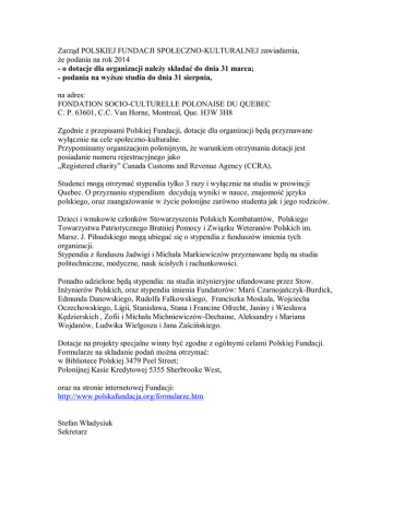 Zarząd POLSKIEJ FUNDACJI SPOŁECZNO-KULTURALNEJ zawiadamia, że podania na rok 2014 - o dotacje dla organizacji należy składać do dnia 31 marca; - podania na wyższe studia do dnia 31 sierpnia, na adres: FONDATION SOCIO-CULTURELLE POLONAISE DU QUEBEC C. P. 63601, C.C. Van Horne, Montreal, Que. H3W 3H8 Zgodnie z przepisami Polskiej Fundacji, dotacje dla organizacji będą przyznawane wyłącznie na cele społeczno-kulturalne. Przypominamy organizacjom polonijnym, że warunkiem otrzymania dotacji jest posiadanie numeru rejestracyjnego jako „Registered charity” Canada Customs and Revenue Agency (CCRA). Studenci mogą otrzymać stypendia tylko 3 razy i wyłącznie na studia w prowincji Quebec. O przyznaniu stypendium decydują wyniki w nauce, znajomość języka polskiego, oraz zaangażowanie w życie polonijne zarówno studenta jak i jego rodziców. Dzieci i wnukowie członków Stowarzyszenia Polskich Kombatantów, Polskiego Towarzystwa Patriotycznego Bratniej Pomocy i Związku Weteranów Polskich im. Marsz. J. Piłsudskiego mogą ubiegać się o stypendia z funduszów imienia tych organizacji. Stypendia z funduszu Jadwigi i Michała Markiewiczów przyznawane będą na studia politechniczne, medyczne, nauk ścisłych i rachunkowości. Ponadto udzielone będą stypendia: na studia inżynieryjne ufundowane przez Stow. Inżynierów Polskich, oraz stypendia imienia Fundatorów: Marii Czarnojańczyk-Burdick, Edmunda Danowskiego, Rudolfa Falkowskiego, Franciszka Moskala, Wojciecha Oczechowskiego, Ligii, Stanisława, Stana i Francine Ofrecht, Janiny i Wiesława Kędzierskich , Zofii i Michała Michniewiczów-Dechaine, Aleksandry i Mariana Wojdanów, Ludwika Wielgosza i Jana Zaścińskiego. Dotacje na projekty specjalne winny być zgodne z ogólnymi celami Polskiej Fundacji. Formularze na składanie podań można otrzymać: w Bibliotece Polskiej 3479 Peel Street; Polonijnej Kasie Kredytowej 5355 Sherbrooke West, oraz na stronie internetowej Fundacji: http://www.polskafundacja.org/formularze.htm Stefan Władysiuk Sekretarz