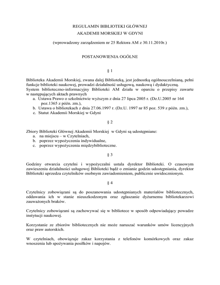 REGULAMIN BIBLIOTEKI GŁÓWNEJ AKADEMII MORSKIEJ W GDYNI (wprowadzony zarządzeniem nr 25 Rektora AM z 30.11.2010r.) POSTANOWIENIA OGÓLNE §1 Biblioteka Akademii Morskiej, zwana dalej Biblioteką, jest jednostką ogólnouczelnianą, pełni funkcje biblioteki naukowej, prowadzi działalność usługową, naukową i dydaktyczną. System biblioteczno-informacyjny Biblioteki AM działa w oparciu o przepisy zawarte w następujących aktach prawnych a. Ustawa Prawo o szkolnictwie wyższym z dnia 27 lipca 2005 r. (Dz.U.2005 nr 164 poz.1365 z późn. zm.), b. Ustawa o bibliotekach z dnia 27.06.1997 r. (Dz.U. 1997 nr 85 poz. 539 z późn. zm.), c. Statut Akademii Morskiej w Gdyni §2 Zbiory Biblioteki Głównej Akademii Morskiej w Gdyni są udostępniane: a. na miejscu – w Czytelniach, b. poprzez wypożyczenia indywidualne, c. poprzez wypożyczenia międzybiblioteczne. §3 Godziny otwarcia czytelni i wypożyczalni ustala dyrektor Biblioteki. O czasowym zawieszeniu działalności usługowej Biblioteki bądź o zmianie godzin udostępniania, dyrektor Biblioteki uprzedza czytelników osobnym zawiadomieniem, publicznie uwidocznionym. §4 Czytelnicy zobowiązani są do poszanowania udostępnianych materiałów bibliotecznych, oddawania ich w stanie nieuszkodzonym oraz zgłaszanie dyżurnemu bibliotekarzowi zauważonych braków. Czytelnicy zobowiązani są zachowywać się w bibliotece w sposób odpowiadający powadze instytucji naukowej. Korzystanie ze zbiorów bibliotecznych nie może naruszać warunków umów licencyjnych oraz praw autorskich. W czytelniach, obowiązuje zakaz korzystania z telefonów komórkowych oraz zakaz wnoszenia lub spożywania posiłków i napojów. KORZYSTANIE Z CZYTELNI §5 Prawo do korzystania z Czytelni mają wszyscy zainteresowani literaturą charakterystyczną dla Akademii Morskiej w Gdyni. §6 Osoby korzystające z Czytelni obowiązane są: a. pozostawić dyżurującemu bibliotekarzowi legitymację studencką lub inny dokument potwierdzający tożsamość ze zdjęciem b. wpisać się do księgi odwiedzin lub zarejestrować elektronicznie c. czytelnie wypełnić zamówienie (rewers) na książki lub czasopisma (nie dotyczy aktualnego roku kalendarzowego) d. zamówienie złożyć najpóźniej na pół godziny przed zamknięciem Czytelni, a zwracać książki lub czasopisma i inne materiały biblioteczne na 15 minut przed zamknięciem Czytelni. e. oddać materiały biblioteczne w stanie nieuszkodzonym, a zauważone braki zgłosić dyżurującemu bibliotekarzowi f. zgłosić dyżurującemu bibliotekarzowi chęć wyniesienia materiałów bibliotecznych z Czytelni do punktu kserowania g. zachować ciszę §7 Osoby korzystające z Internetu (tylko do celów naukowych, dydaktycznych i edukacyjnych) obowiązane są: a. wpisać się do księgi odwiedzin lub zarejestrować elektronicznie b. pozostawić legitymację studencką / pracowniczą dyżurującemu bibliotekarzowi c. nie zmieniać ustawień i nie usuwać plików związanych z funkcjonowaniem systemu operacyjnego d. nie instalować oprogramowania przyniesionego z zewnątrz lub ściągniętego z Internetu e. nie kopiować i nie rozpowszechniać programów oraz innych zasobów elektronicznych objętych licencją Biblioteki Głównej bądź chronionych prawem autorskim f. nie korzystać z komputerów w celach zarobkowych g. nie korzystać z gier Przed opuszczeniem stanowiska należy skasować i doprowadzić miejsce pracy do stanu wyjściowego. wszystkie wprowadzone §8 Wyłącznie w Czytelniach udostępnia się: a. księgozbiór podręczny b. czasopisma polskie i zagraniczne – bieżące i roczniki z lat ubiegłych c. pozycje sprowadzane przez Wypożyczalnię Międzybiblioteczną d. wydawnictwa zastrzeżone przez Bibliotekę do korzystania na miejscu e. prasę codzienną dane KORZYSTANIE Z WYPOŻYCZALNI Wypożyczalnia Naukowa §9 Prawo do korzystania z Wypożyczalni Biblioteki Głównej Akademii Morskiej w Gdyni ma osoba posiadająca aktywne konto czytelnika BG AM w komputerowym systemie bibliotecznym Virtua Do posiadania konta czytelnika uprawnieni są: a. pracownicy i studenci Akademii Morskiej w Gdyni b. pracownicy i studenci państwowych szkół wyższych Trójmiasta (po dostarczeniu skierowania z biblioteki macierzystej uczelni) c. studenci i pracownicy innych szkół w przypadku zawarcia umowy pomiędzy BG AM a daną szkołą (po dostarczeniu skierowania lub listy uprawnionych uczniów z danej szkoły) Dokumentem potwierdzającym rejestrację w systemie Virtua jest karta biblioteczna Z wypożyczalni mogą również korzystać kursanci SDK AM w Gdyni po wpłaceniu kaucji, której wysokość zależy od wartości wypożyczanych dzieł (kaucja przewyższa ich wartość) § 10 Dokumentem uprawniającym do wypożyczania na zewnątrz jest karta biblioteczna AM lub elektroniczna legitymacja studencka AM pełniąca jednocześnie funkcję karty bibliotecznej. a. Elektroniczna Legitymacja Studencka Akademii Morskiej jest jednocześnie kartą biblioteczną studenta AM b. Za kartę biblioteczną wystawioną przez BG AM pobierana jest opłata (z wyłączeniem pracowników AM) c. Czytelnik zobowiązany jest okazać kartę biblioteczną na żądanie pracownika biblioteki d. Karty bibliotecznej nie wolno odstępować innej osobie; tożsamość użytkownika karty bibliotecznej może być weryfikowana na podstawie dowodu osobistego e. Zagubienie karty bibliotecznej, zmianę danych osobowych należy niezwłocznie zgłaszać w Wypożyczalni BG AM f. Duplikat karty bibliotecznej (oprócz duplikatu Elektronicznej Legitymacji Studenckiej) można uzyskać w Wypożyczalni po wpłaceniu odpowiedniej kwoty § 11 Książki wypożycza się czytelnikom na następujące okresy czasu: a. pracownikom Akademii Morskiej - 25 woluminów na okres 1 roku b. studentom, doktorantom, słuchaczom studiów podyplomowych Akademii Morskiej – 8 woluminów na okres 2 miesięcy c. studentom dwóch kierunków AM – 16 woluminów na okres 2 miesięcy d. kursantom S
