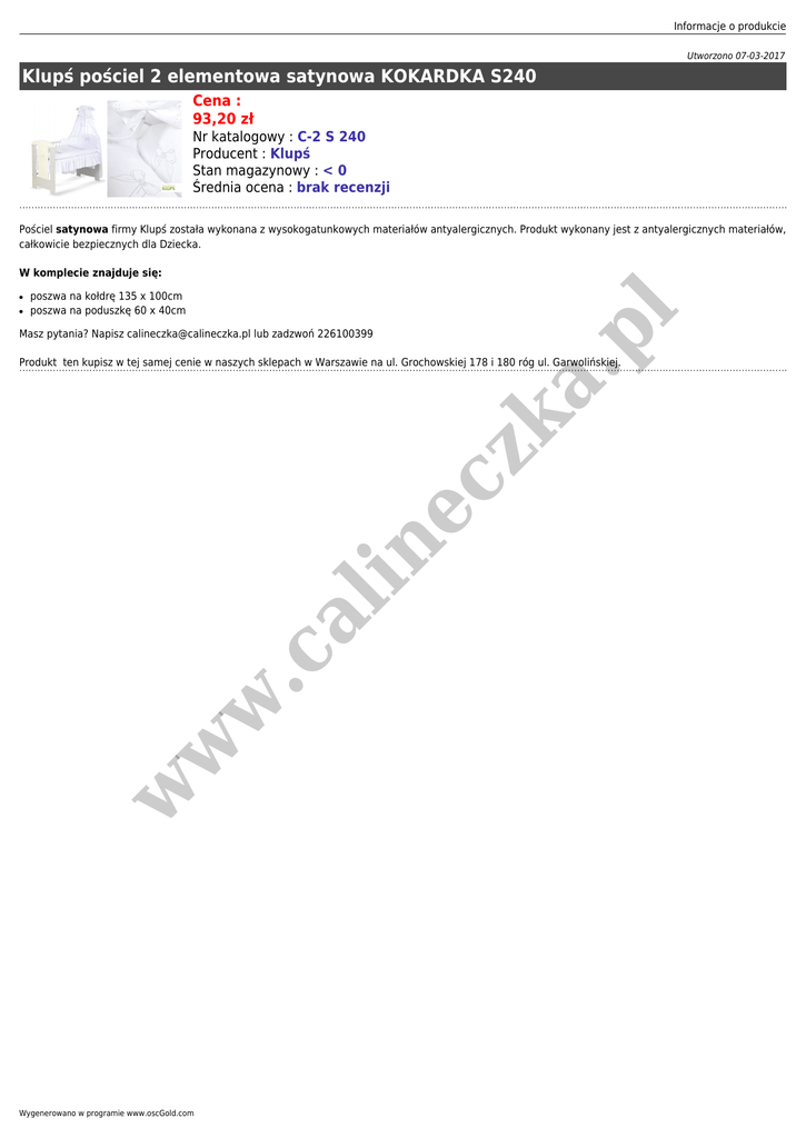 Informacje o produkcie Utworzono 07-03-2017 Klupś pościel 2 elementowa satynowa KOKARDKA S240 Cena : 93,20 zł Nr katalogowy : C-2 S 240 Producent : Klupś Stan magazynowy : < 0 Średnia ocena : brak recenzji Pościel satynowa firmy Klupś została wykonana z wysokogatunkowych materiałów antyalergicznych. Produkt wykonany jest z antyalergicznych materiałów, całkowicie bezpiecznych dla Dziecka. W komplecie znajduje się: ● poszwa na kołdrę 135 x 100cm poszwa na poduszkę 60 x 40cm pl ● Masz pytania? Napisz [email protected] lub zadzwoń 226100399 w w w .c al in ec zk a. Produkt ten kupisz w tej samej cenie w naszych sklepach w Warszawie na ul. Grochowskiej 178 i 180 róg ul. Garwolińskiej. Wygenerowano w programie www.oscGold.com