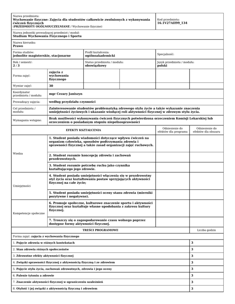 Nazwa przedmiotu: Wychowanie fizyczne: Zajęcia dla studentów całkowicie zwolnionych z wykonywania ćwiczeń fizycznych Kod przedmiotu: 16.1V27AII99_134 (PRZEDMIOTY OGÓLNOUCZELNIANE / Wychowanie fizyczne) Nazwa jednostki prowadzącej przedmiot / moduł: Studium Wychowania Fizycznego i Sportu Nazwa kierunku: Prawo Forma studiów: Profil kształcenia: jednolite magisterskie, stacjonarne ogólnoakademicki Rok / semestr: 2/3 Status przedmiotu / modułu: Język przedmiotu / modułu: obowiązkowy polski Specjalność: Forma zajęć: zajęcia z wychowania fizycznego Wymiar zajęć: 30 Koordynator przedmiotu / modułu: mgr Cezary Janiszyn Prowadzący zajęcia: według przydziału czynności Cel przedmiotu / modułu: Zainteresowanie studentów problematyką zdrowego stylu życie a także wykazanie znaczenia umiejętności życiowych i ukazanie wiodącej roli aktywności fizycznej w zdrowym stylu życia. Wymagania wstępne: Brak możliwości wykonywania ćwiczeń fizycznych potwierdzona orzeczeniem Komisji Lekarskiej lub orzeczeniem o posiadanym stopniu niepełnosprawności EFEKTY KSZTAŁCENIA Odniesienie do efektów dla programu Odniesienie do efektów dla obszaru 1. Student posiada wiadomości dotyczące wpływu ćwiczeń na organizm człowieka, sposobów podtrzymania zdrowia i sprawności fizycznej a także zasad organizacji zajęć ruchowych. Wiedza 2. Student rozumie koncepcję zdrowia i zachowań prozdrowotnych. 3. Student rozumie potrzebę ruchu jako czynnika kształtującego jego zdrowie. Umiejętności 4. Student posiada umiejętności włączenia się w prozdrowotny styl życia oraz kształtowania postaw sprzyjających aktywności fizycznej na całe życie; 5. Student posiada umiejętności oceny stanu zdrowia (mierniki pozytywne i negatywne). Kompetencje społeczne 6. Promuje społeczne, kulturowe znaczenie sportu i aktywności fizycznej oraz kształtuje własne upodobania z zakresu kultury fizycznej. 7. Troszczy się o zagospodarowanie czasu wolnego poprzez dostępne formy aktywności fizycznej. TREŚCI PROGRAMOWE Liczba godzin Forma zajęć: zajęcia z wychowania fizycznego 1. Pojęcie zdrowia w różnych kontekstach 3 2. Stan zdrowia różnych społeczeństw 3 3. Zdrowotne efekty aktywności fizycznej 3 4. Związki sprawności fizycznej z aktywnością fizyczną i ze zdrowiem 3 5. Pojęcie stylu życia, zachowań zdrowotnych, zdrowia i jego oceny 3 6. Palenie tytoniu a zdrowie 3 7. Znaczenie aktywności fizycznej w ograniczeniu uzależnień 3 8. Otyłość i jej związki z aktywnością fizyczną i zdrowiem 3 9. Rola aktywności fizycznej w opóźnieniu procesów starzeni 2 10. Miejsce aktywności fizycznej wśród innych czynników warunkujących zdrowie 2 11. Dieta i prawidłowe odżywianie się 2 Metody kształcenia - wykład konwersatoryjny, - prezentacja multimedialna. Nr efektu kształcenia z sylabusa Metody weryfikacji efektów kształcenia Forma i warunki zaliczenia * praca pisemna/esej/recenzja 1,2,3,4,5, * projekt 4,6,7, Zaliczenie zajęć na podstawie obecności, eseju i zrealizowanych projektów grupowych. Zaliczenie bez oceny. Literatura podstawowa Wojnarowska B. (2007): Edukacja zdrowotna. Podręcznik akademicki.. Wydawnictwo Naukowe PWN, Warszawa Drabik J. (1995): Aktywność fizyczna w edukacji zdrowotnej społeczeństwa. CZ. I.. AWFiS, Gdańsk Drabik J. (1996): Aktywność fizyczna w treningu zdrowotnym osób dorosłych. Cz. II. AWFiS, Gdańsk Drabik J. (1997): Promocja aktywności fizycznej. Cz. III. AWFiS, Gdańsk Drabik J. (1997): Aktywność, sprawność i wydolność fizyczna jako mierniki zdrowia człowieka.. AWFiS, Gdańsk Literatura uzupełniająca NAKŁAD PRACY STUDENTA: Liczba godzin Zajęcia dydaktyczne 30 Przygotowanie się do zajęć 20 ŁĄCZNY nakład pracy studenta w godz. 50 Liczba punktów ECTS 2