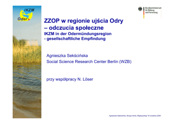 ZZOP w regionie ujścia Odry – odczucia społeczne IKZM in der Odermündungsregion - gesellschaftliche Empfindung Agnieszka Sekścińska Social Science Research Center Berlin (WZB) przy współpracy N. Löser Agnieszka Sekścińska, Brzeg morski, Międzyzdroje 16 września 2005 Projekt: „Badania nad Zintegrowanym Zarządzaniem Obszarami Przybrzeżnymi w regionie ujścia Odry (ZZOP-Odra/Oder)“ integracyjne – transdyscyplinarne intersektoralne ¾ Wsparcie finansowe: maj 2004 - kwiecień 2007 ¾ Jeden z dwóch narodowych projektów opiniodawczych Federalnego Ministerstwa Oświaty i Badań Naukowych na temat ZZOP ¾ 11 partnerów i instytucji. Koordynacja: Instytut Badań Morza Bałtyckiego w Warnemünde ¾ Udział w precedensowych badaniach (LOICZ, EUCC i UNEP ICARM) ¾ Włączony w działania Regionalnej Agendy 21 „Zalew Szczeciński“ W bliskiej współpracy z: ministerstwami, regionalnymi i lokalnymi urzędami, międzynarodowymi i narodowymi organizacjami Agnieszka Sekścińska, Brzeg morski, Międzyzdroje 16 września 2005 Tematy projektu ¾ Stocktaking ZZOP i ewaluacja zgodnie z rekomendacją UE w celu stworzenia narodowej strategii ZZOP ¾ Analiza i ewaluacja zależności obszarów dorzecze – wybrzeże ¾ Analiza zmian klimatycznych w dorzeczu, wpływu na wybrzeże, konsekwencji dla ZZOP i planowania przestrzennego ¾ Harmonizacja i integracja niemieckich i polskich narzędzi planistycznych i ZZOP ¾ Integracja wód wybrzeża w planowanie terestryczne ¾ Rozwój i aplikacja wskazników dla zrównoważonego rozwoju i ZZOP ¾ Propozycje zrównoważonej turystyki Agnieszka Sekścińska, Brzeg morski, Międzyzdroje 16 września 2005 Obszar projektu Satellite image: Siegel et al. 2000 ! Integracja: Ląd i morze, Niemcy i Polska, wybrzeże i dorzecze Agnieszka Sekścińska, Brzeg morski, Międzyzdroje 16 września 2005 Analiza artykułów prasowych styczeń 2000 - 2005 Polska Pogłębianie Niemcy Jakość wody Wojsko Ochrona przyrody Rybołówstwo Turystyka Żegluga/Porty Rozwój regionalny Ochrona wybrzeża/Powodzie Stosunki polsko-niemieckie 0 5 10 15 20 25 30 35 40 Agnieszka Sekścińska, Brzeg morski, Międzyzdroje 16 września 2005 Tematyka ZZOP a obszary regionu w Polsce Dorzecze Odry Ląd Zalew Szczeciński & Wybrzeże wewnętrzne Zatoka Pomorska & Wybrzeże zewnętrzne 0 5 10 Przejścia graniczne/Stosunki polsko-niemieckie Rozwój regionalny Tourystyka Ochrona przyrody/Parki narodowe Jakość wody 15 20 25 30 Ochrona wybrzeża/Powodzie Żegluga/Porty Rybołówstwo Amunicja/Wojsko Połębianie Agnieszka Sekścińska, Brzeg morski, Międzyzdroje 16 września 2005 Tematyka ZZOP a obszary regionu w Niemczech Dorzecze Odry Ląd Zalew Szczeciński & Wybrzeże wewnętrzne Zatoka Pomorska & Wybrzeże zewnętrzne 0 10 20 30 Przejścia graniczne/Stosunki polsko-niemieckie Rozwój regionalny Turystyka Ochrona przyrody/Parki narodowe Jakość wody 40 50 60 70 Ochrona wybrzeża/Powodzie Żegluga/Porty Rybołówstwo Amunicja/Wojsko Pogłębianie Agnieszka Sekścińska, Brzeg morski, Międzyzdroje 16 września 2005 Wyniki i cele ¾ Zagadnienie potencjału regionu, integracja środowiska z innymi użytkownikami i ich wspódziałanie nie są wystarczająco omawiane w prasie ¾ Świadomość wagi tych problemów jest niska ¾ Zwiększenie identyfikacji społeczeństwa z regionem ¾ Rozszeżenie informacji, komunikacji, partycypacji i edukacji ¾ Wzrost świadomości o zrównoważonym rozwoju i ZZOP ¾ Włączenie społeczeństwa w tematykę i cele projektu ¾ Intensyfikacja transgranicznej współpracy Agnieszka Sekścińska, Brzeg morski, Międzyzdroje 16 września 2005 Propozycje projektu dla komunikacji i partycypacji w regionie Grupa doradcza Transgraniczne konferencje, dialogi Biuro Regionalnej Agendy 21 Polsko-niemiecka “Regionalna Agenda 21 Zalew Szczeciński” Public relations Projekt ZZOP-Odra System szkolenia ZZOP Regionalny system informacji www.ikzm-oder.de/pl Agnieszka Sekścińska, Brzeg morski, Międzyzdroje 16 września 2005 Korzyści dla regionu ¾ Promocja ZZOP i utworzenie regionu modelowego ¾ Wsparcie polsko-niemieckiej współpracy oraz identyfikacja społeczeństwa z regionem ¾ Wzrost świadomości transgranicznej dla zrównoważonego rozwoju i ZZOP ¾ Ogólne udostępnienie danych, faktów i informacji ¾ Objektywizacja procesów decyzyjnych m.in. przez informacje, doradztwo i udostępnienie narzędzi ¾ Wspieranie projektów, intensyfikacja regionalnej kooperacji Agnieszka Sekścińska, Brzeg morski, Międzyzdroje 16 września 2005