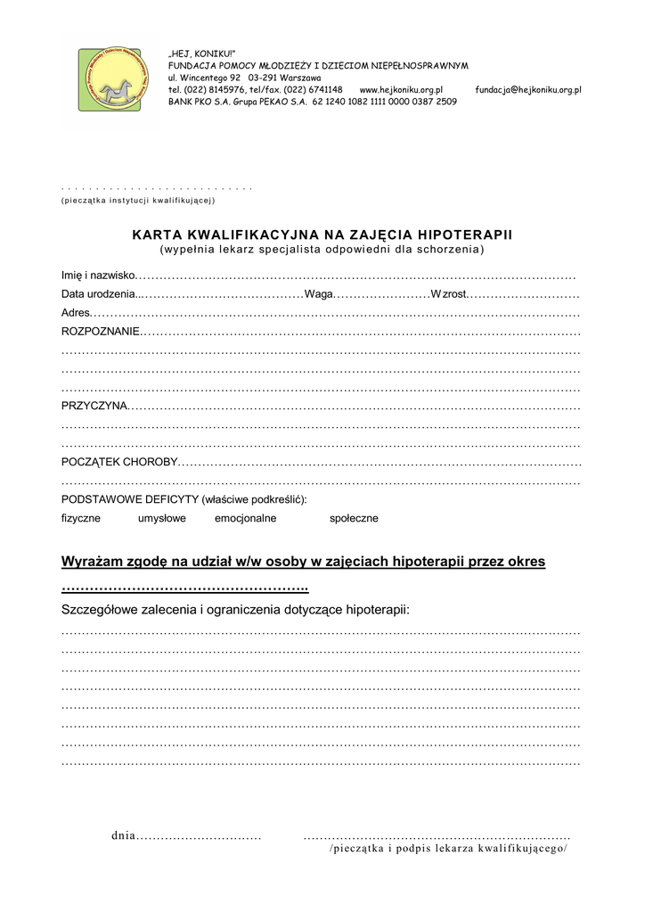 „HEJ, KONIKU!” FUNDACJA POMOCY MŁODZIEŻY I DZIECIOM NIEPEŁNOSPRAWNYM ul. Wincentego 92 03-291 Warszawa tel. (022) 8145976, tel/fax. (022) 6741148 www.hejkoniku.org.pl [email protected] BANK PKO S.A. Grupa PEKAO S.A. 62 1240 1082 1111 0000 0387 2509 . . . . . . . . . . . . . . . . . . . . . . . . . . . . (pi ecząt ka i nst ytucj i kwal i fi kuj ącej ) KART A KWAL IF IKACYJNA NA Z AJĘCIA HIPOT ERAPII (wy peł ni a l ekarz sp ecj al i st a odpo wi edni dl a schorzeni a ) Imię i nazwisko. . . . . . .. . . .. . . .. . . .. . .. . . .. . . .. . . .. . . .. . . .. . . ... . . . .. . . .. . . .. . . .. . . .. . . .. . .. . . .. . . .. . . .. . . .. . . .. . . .. . .. . . .. . Data urodzenia... . . .. . . .. . . .. . . .. . . .. . .. . . .. . . .. . . .. . . ..Waga. . . . . .. . . .. . . .. . .. . . .. . .W zrost. . . .. . . .. . . .. . . .. . . .. . .. . . .. Adres. . . . . . . .. . . .. . . .. . . .. . . .. . . .. . . .. . .. . . .. . . .. . . .. . . .. . . .. . .. . . . .. . . .. . . .. . . .. . . .. . . .. . .. . . .. . . .. . . .. . . .. . . .. . . .. . .. . . .. . . ROZPOZNANIE.. . . .. . . .. . . .. . .. . . .. . . .. . . .. . . .. . . .. . . .. . .. .. . . . .. . . .. . . .. . . .. . . .. . . .. . .. . . .. . . .. . . .. . . .. . . .. . . .. . .. . . .. . . . . . . . .. . . .. . . .. . . .. . . .. . . .. . .. . . .. . . .. . . .. . . .. . . .. . . .. . .. . . .. . . .. .. . . . .. . . .. . . .. . . .. . . .. . . .. . .. . . .. . . .. . . .. . . .. . . .. . . .. . .. . . .. . . . . . . .. . . .. . . .. . . .. . . .. . . .. . .. . . .. . . .. . . .. . . .. . . .. . . .. . .. . . .. . . .. .. . . . .. . . .. . . .. . . .. . . .. . . .. . .. . . .. . . .. . . .. . . .. . . .. . . .. . .. . . .. . . . . . . .. . . .. . . .. . . .. . . .. . . .. . .. . . .. . . .. . . .. . . .. . . .. . . .. . .. . . .. . . .. .. . . . .. . . .. . . .. . . .. . . .. . . .. . .. . . .. . . .. . . .. . . .. . . .. . . .. . .. . . .. . . PRZYCZYNA. . .. . .. . . .. . . .. . . .. . . .. . . .. . . .. . .. . . .. . . .. . . .. . .. . . . .. . . .. . . .. . . .. . . .. . . .. . .. . . .. . . .. . . .. . . .. . . .. . . .. . .. . . .. . . . . . . . .. . . .. . . .. . . .. . . .. . . .. . .. . . .. . . .. . . .. . . .. . . .. . . .. . .. . . .. . . .. .. . . . .. . . .. . . .. . . .. . . .. . . .. . .. . . .. . . .. . . .. . . .. . . .. . . .. . .. . . .. . . . . . . .. . . .. . . .. . . .. . . .. . . .. . .. . . .. . . .. . . .. . . .. . . .. . . .. . .. . . .. . . .. .. . . . .. . . .. . . .. . . .. . . .. . . .. . .. . . .. . . .. . . .. . . .. . . .. . . .. . .. . . .. . . POCZĄTEK CHOROBY. . . .. . . .. . . .. . . .. . . .. . . .. . .. . . .. . . ... . . . .. . . .. . . .. . . .. . . .. . . .. . .. . . .. . . .. . . .. . . .. . . .. . . .. . .. . . .. . . . . . . . .. . . .. . . .. . . .. . . .. . . .. . .. . . .. . . .. . . .. . . .. . . .. . . .. . .. . . .. . . .. .. . . . .. . . .. . . .. . . .. . . .. . . .. . .. . . .. . . .. . . .. . . .. . . .. . . .. . .. . . .. . . PODSTAWOWE DEFICYTY (właściwe podkreślić): fizyczne umysłowe emocjonalne społeczne Wyrażam zgodę na udział w/w osoby w zajęciach hipoterapii przez okres …………………………………………….. Szczegółowe zalecenia i ograniczenia dotyczące hipoterapii: . . . . .. . . .. . . .. . . .. . . .. . . .. . .. . . .. . . .. . . .. . . .. . . .. . . .. . .. . . .. . . .. .. . . . .. . . .. . . .. . . .. . . .. . . .. . .. . . .. . . .. . . .. . . .. . . .. . . .. . .. . . .. . . . . . . .. . . .. . . .. . . .. . . .. . . .. . .. . . .. . . .. . . .. . . .. . . .. . . .. . .. . . .. . . .. .. . . . .. . . .. . . .. . . .. . . .. . . .. . .. . . .. . . .. . . .. . . .. . . .. . . .. . .. . . .. . . . . . . .. . . .. . . .. . . .. . . .. . . .. . .. . . .. . . .. . . .. . . .. . . .. . . .. . .. . . .. . . .. .. . . . .. . . .. . . .. . . .. . . .. . . .. . .. . . .. . . .. . . .. . . .. . . .. . . .. . .. . . .. . . . . . . .. . . .. . . .. . . .. . . .. . . .. . .. . . .. . . .. . . .. . . .. . . .. . . .. . .. . . .. . . .. .. . . . .. . . .. . . .. . . .. . . .. . . .. . .. . . .. . . .. . . .. . . .. . . .. . . .. . .. . . .. . . . . . . .. . . .. . . .. . . .. . . .. . . .. . .. . . .. . . .. . . .. . . .. . . .. . . .. . .. . . .. . . .. .. . . . .. . . .. . . .. . . .. . . .. . . .. . .. . . .. . . .. . . .. . . .. . . .. . . .. . .. . . .. . . . . . . .. . . .. . . .. . . .. . . .. . . .. . .. . . .. . . .. . . .. . . .. . . .. . . .. . .. . . .. . . .. .. . . . .. . . .. . . .. . . .. . . .. . . .. . .. . . .. . . .. . . .. . . .. . . .. . . .. . .. . . .. . . . . . . .. . . .. . . .. . . .. . . .. . . .. . .. . . .. . . .. . . .. . . .. . . .. . . .. . .. . . .. . . .. .. . . . .. . . .. . . .. . . .. . . .. . . .. . .. . . .. . . .. . . .. . . .. . . .. . . .. . .. . . .. . . . . . . .. . . .. . . .. . . .. . . .. . . .. . .. . . .. . . .. . . .. . . .. . . .. . . .. . .. . . .. . . .. .. . . . .. . . .. . . .. . . .. . . .. . . .. . .. . . .. . . .. . . .. . . .. . . .. . . .. . .. . . .. . . dnia ............................... ..... ............................................. ................ / pi ecz ą t ka i podpi s l eka r za kwa l i fi kują c eg o/ „HEJ, KONIKU!” Załącznik nr 1 FUNDACJA POMOCY MŁODZIEŻY I DZIECIOM NIEPEŁNOSPRAWNYM ul. Wincentego 92 03-291 Warszawa tel. (022) 8145976, tel/fax. (022) 6741148 www.hejkoniku.org.pl [email protected] BANK PKO S.A. Grupa PEKAO S.A. 62 1240 1082 1111 0000 0387 2509 ……………………………………………………….. (pi eczą tka pl aców ki kwal i fi kuj ącej ) OPIS STANU PACJENTA KWALIFIKOWANEGO NA ZAJĘCIA HIPOTERAPII (wypełnia lekarz pierwszego kontaktu) Imię i nazwisko.. . .. .. .. . .. .. . .. .. .. . .. .. . .. .. .. . .. .. . .. .. .. . .. .. . .. . .. .. . .. .. . .. .. .. . .. .. . .. .. .. . .. .. . .. .. .. . .. .. . .. .. .. . .. .. . .. .. . . . . Data urodzenia.... .. . .. .. . .. .. .. . .. .. . .. .. .. . .. .