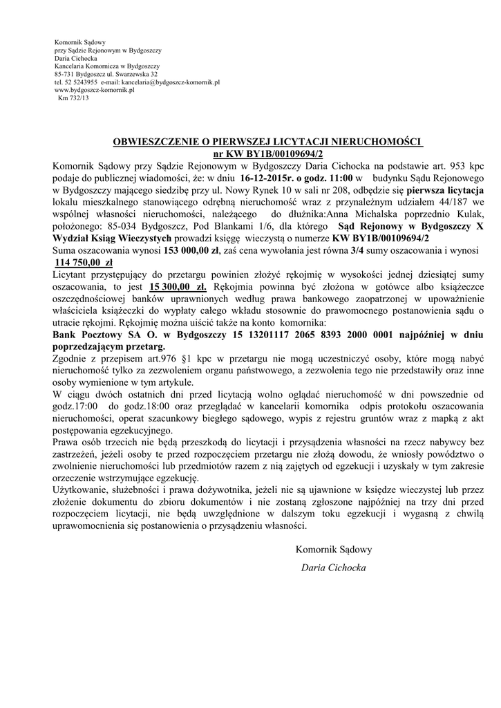 Komornik Sądowy przy Sądzie Rejonowym w Bydgoszczy Daria Cichocka Kancelaria Komornicza w Bydgoszczy 85-731 Bydgoszcz ul. Swarzewska 32 tel. 52 5243955 e-mail: [email protected] www.bydgoszcz-komornik.pl Km 732/13 OBWIESZCZENIE O PIERWSZEJ LICYTACJI NIERUCHOMOŚCI nr KW BY1B/00109694/2 Komornik Sądowy przy Sądzie Rejonowym w Bydgoszczy Daria Cichocka na podstawie art. 953 kpc podaje do publicznej wiadomości, że: w dniu 16-12-2015r. o godz. 11:00 w budynku Sądu Rejonowego w Bydgoszczy mającego siedzibę przy ul. Nowy Rynek 10 w sali nr 208, odbędzie się pierwsza licytacja lokalu mieszkalnego stanowiącego odrębną nieruchomość wraz z przynależnym udziałem 44/187 we wspólnej własności nieruchomości, należącego do dłużnika:Anna Michalska poprzednio Kulak, położonego: 85-034 Bydgoszcz, Pod Blankami 1/6, dla którego Sąd Rejonowy w Bydgoszczy X Wydział Ksiąg Wieczystych prowadzi księgę wieczystą o numerze KW BY1B/00109694/2 Suma oszacowania wynosi 153 000,00 zł, zaś cena wywołania jest równa 3/4 sumy oszacowania i wynosi 114 750,00_zł Licytant przystępujący do przetargu powinien złożyć rękojmię w wysokości jednej dziesiątej sumy oszacowania, to jest 15 300,00 zł. Rękojmia powinna być złożona w gotówce albo książeczce oszczędnościowej banków uprawnionych według prawa bankowego zaopatrzonej w upoważnienie właściciela książeczki do wypłaty całego wkładu stosownie do prawomocnego postanowienia sądu o utracie rękojmi. Rękojmię można uiścić także na konto komornika: Bank Pocztowy SA O. w Bydgoszczy 15 13201117 2065 8393 2000 0001 najpóźniej w dniu poprzedzającym przetarg. Zgodnie z przepisem art.976 §1 kpc w przetargu nie mogą uczestniczyć osoby, które mogą nabyć nieruchomość tylko za zezwoleniem organu państwowego, a zezwolenia tego nie przedstawiły oraz inne osoby wymienione w tym artykule. W ciągu dwóch ostatnich dni przed licytacją wolno oglądać nieruchomość w dni powszednie od godz.17:00 do godz.18:00 oraz przeglądać w kancelarii komornika odpis protokołu oszacowania nieruchomości, operat szacunkowy biegłego sądowego, wypis z rejestru gruntów wraz z mapką z akt postępowania egzekucyjnego. Prawa osób trzecich nie będą przeszkodą do licytacji i przysądzenia własności na rzecz nabywcy bez zastrzeżeń, jeżeli osoby te przed rozpoczęciem przetargu nie złożą dowodu, że wniosły powództwo o zwolnienie nieruchomości lub przedmiotów razem z nią zajętych od egzekucji i uzyskały w tym zakresie orzeczenie wstrzymujące egzekucję. Użytkowanie, służebności i prawa dożywotnika, jeżeli nie są ujawnione w księdze wieczystej lub przez złożenie dokumentu do zbioru dokumentów i nie zostaną zgłoszone najpóźniej na trzy dni przed rozpoczęciem licytacji, nie będą uwzględnione w dalszym toku egzekucji i wygasną z chwilą uprawomocnienia się postanowienia o przysądzeniu własności. Komornik Sądowy Daria Cichocka