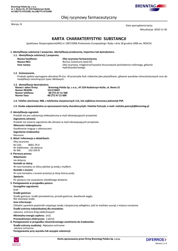 Brenntag Polska Sp. z o.o. ul. J. Bema 21, 47-224 Kędzierzyn-Koźle tel (48/77) 4721500, fax (48/77) 4721600 Olej rycynowy farmaceutyczny Wersja: III Data sporządzenia karty: __________ Aktualizacja: 2010-11-30 KARTA CHARAKTERYSTYKI SUBSTANCJI (podstawa: Rozporządzenie(WE) nr 1907/2006 Parlamentu Europejskiegi i Rady z dnia 18 grudnia 2006 ws. REACH) 1. Identyfikacja substancji / preparatu. Identyfikacja producenta, importera lub dystrybutora. 1.1. Identyfikacja substancji / preparatu. Nazwa handlowa: Olej rycynowy farmaceutyczny Nazwa INCI: Ricinus Communis Seed Oil Inne nazwy: Olej rycynowy, trójgliceryd kwasów tłuszczowych pochodzenia roślinnego, głównie hydroksyoleinowego 1.2. Zastosowanie. Produkt spełnia wymagania aktualnej Ph.Eur. W przemyśle farb i lakierów jako plastyfikator, głównie wyrobów nitrocelulozowych oraz do modyfikacji nieschnących żywic alkilowych. 1.3. Identyfikacja dystrybutora. Nazwa i adres firmy: Brenntag Polska Sp. z o.o., 47-224 Kedzierzyn-Koźle, ul. Bema 21 Numer REGON: 531174447 Numer telefonu: 48 (77) 47 21 500 Numer faxu: 48 (77) 47 21 600 1.4. Telefon alarmowy: 988, z telefonów stacjonarnych 112, lub najbliższa terenowa jednostak PSP. 1.5. Osoba odpowiedzialna za opracowanie karty charakterystyki: Violetta Pańczyk, e-mail: [email protected] 2. Identyfikacja zagrożeń: Produkt nie jest substancją niebezpieczną w myśl obowiązujących przepisów. Zagrożenia zdrowia: Produkt nie stwarza zagrożenia dla zdrowia w myśl obowiązujących przepisów. Własności niebezpieczne: Gwałtownie reaguje z utleniaczami. Zagrożenie środowiska: Nieznane 3. Skład i informacja o składnikach: Olej rycynowy Nr CAS: 8001-79-4 Nr indeksowy: nie dotyczy Nr WE: 232-293-8 4. Pierwsza pomoc: Wdychanie: nie dotyczy Kontakt ze skórą: W razie kontaktu ze skórą spłukać ją wodą z mydłem. Kontakt z oczami: W razie kontaktu z oczami przemyć je dużą ilością wody. Spożycie: Po spożyciu nie zauważono szkodliwego działania 5. Postępowanie w przypadku pożaru: Szczególne zagrożenia: brak Środki gaśnicze: Środki gaśnicze: środki pianotwórcze, proszki gaśnicze, dwutlenek węgla. Nie stosować wody. Inne informacje: Chłodzić sąsiednie pojemniki rozpylając wodę z bezpiecznej odległości, jeśli to możliwe usunąć z miejsca narażenia. Środki ochrony indywidualnej dla strażaków: zalecana ochrona dróg oddechowych Minimalna energia zapłonu: [mJ] Przewodnictwo elektryczne: [ pS/m] 6. Postępowanie w przypadku niezamierzonego uwolnienia do środowiska: Środki ochrony osobistej: -Rękawice ochronne -okulary ochronne Postępowanie przy wycieku lub wysypie substancji: Karta opracowana przez firmę Brenntag Polska Sp. z o.o. Strona 1 z 4 Brenntag Polska Sp. z o.o. ul. J. Bema 21, 47-224 Kędzierzyn-Koźle tel (48/77) 4721500, fax (48/77) 4721600 Olej rycynowy farmaceutyczny Zapobiec rozprzestrzenianiu się lub dostaniu się do kanalizacji, rowów lub rzek. Usunąć źródła zapłonu; zabezpieczyć studzienki ściekowe; unikać bezpośredniego kontaktu z uwalniającą się substancją; o ile to możliwe zlikwidować nieszczelności; zebrać do zamykanego pojemnika; zanieczyszczoną powierzchnię spłukać wodą. 7. Postępowanie z substancją / preparatem i magazynowanie: Magazynowanie: Przechowywać w opakowaniach szczelnie zamkniętych w chłodnym i suchym miejscu, z dala od źródeł ognia. Chronic przed światłem. Nie składować z substancjami łatwopalnymi Postępowanie z substancją lub preparatem: Usunąć źródła otwartego ognia. Nie opróżniać do kanalizacji. 8. Kontrola narażenia i środki ochrony indywidualnej: Stosowane środki ochrony osobistej powinny spełniać wymogi Rozporządzenia Ministra Gospodarki z dnia 21 grudnia 2005 r. w sprawie zasadniczych wymagań dla środków ochrony indywidualnej (Dz.U. Nr 259, poz. 2173). Ochrona dróg oddechowych: nie wymagana Ochrona oczu: okulary ochronne Ochrona rąk: Rękawice ochronne Techniczne środki ochronne: wentylacja pomieszczeń Inne wyposażenie ochronne: ubranie robocze Kontrola zagrożenia: NDS nie oznaczono NDSCh nie oznaczono (wg Rozporzadzenia MPiPS z dn. 29 listopada 2002 ; Dz.U. Nr 217, poz. 1833 z późniejszymi zmianami) Zalecenia dotyczące procedury monitoringu zawartości składników niebezpiecznych w powietrzu – metodyka pomiarów: -Rozporządzenie Ministra Zdrowia z dnia 20 kwietnia 2005 r. w sprawie badań i pomiarów czynników szkodliwych dla zdrowia w środowisku pracy (Dz.U. Nr 73, poz.645) -PN-89/Z-01001/06. Ochrona czystości powietrza. Nazwy, określenia i jednostki. Terminologia dotycząca badań jakości powietrza na stanowiskach pracy. -PN Z-04008-7:2002. Ochrona czystości powietrza. Pobieranie próbek. Zasady pobierania próbek powietrza w środowisku pracy i interpretacja wyników. -PN-EN-689: 2002. Powietrze na stanowiskach pracy – wytyczne oceny narażenia inhalacyjnego na czynniki chemiczne przez porównanie z wartościami dopuszczalnymi i strategia pomiarowa. Uwaga: Gdy stężenie substancji jest ustalone i znane, doboru środków ochrony indywidualnej należy dokonywać z uwzględnieniem stężenia substancji występującego na danym stanowisku pracy, czasu ekspozycji oraz czynności wykonywanych przez pracownika. W sytuacji awaryjnej, jeżeli stężenie substancji na stanowisku pracy nie jest znane, stosować środki ochrony indywidualnej o najwyższej zalecanej klasie ochrony. Pracodawca jest obowiązany zapewnić, aby stosowane środki ochrony indywidualnej oraz odzież i obuwie robocze posiadały właściwości ochronne i użytkowe oraz zapewnić odpowiednie ich pranie, konserwacje, naprawę i odkażanie. Zalecane badania wstępne i okresowe pracowników należy przeprowadzać zgodnie z Rozporządzeniem Ministra Zdrowia i Opieki Społecznej z dnia 30 maja 1996 r. w sprawie przeprowadzania badań lekarskich pracowników, zakresu profilaktycznej opieki zdrowotnej nad pracownikami oraz orzeczeń lekarskich wydanych do celów prz