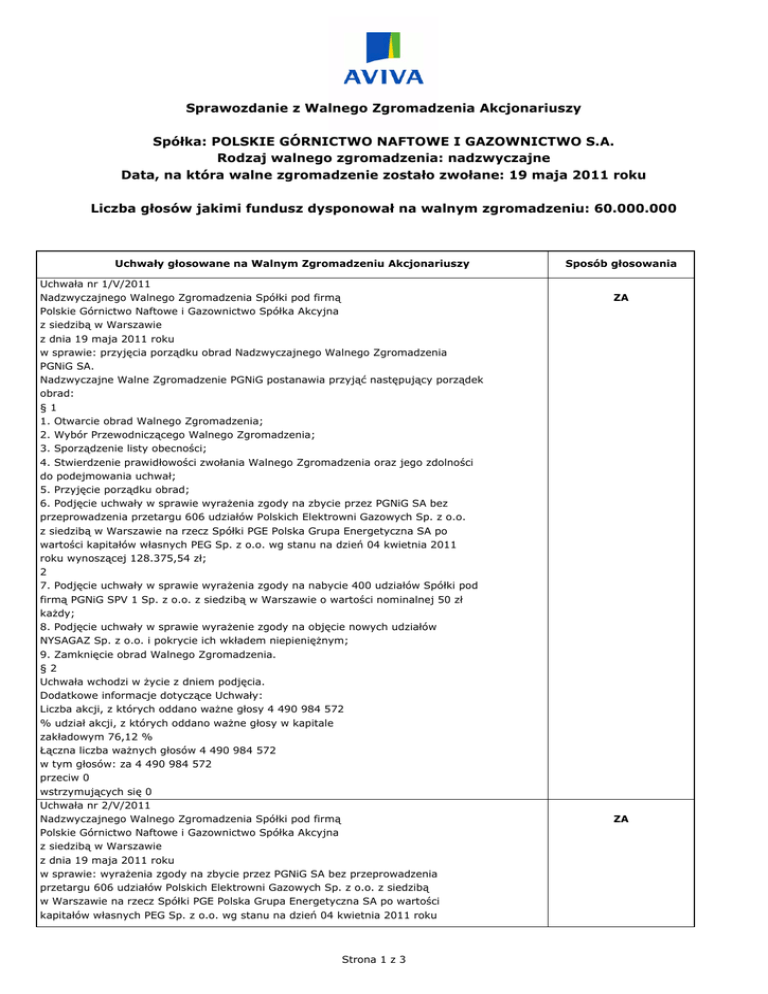 Sprawozdanie z Walnego Zgromadzenia Akcjonariuszy Spółka: POLSKIE GÓRNICTWO NAFTOWE I GAZOWNICTWO S.A. Rodzaj walnego zgromadzenia: nadzwyczajne Data, na która walne zgromadzenie zostało zwołane: 19 maja 2011 roku Liczba głosów jakimi fundusz dysponował na walnym zgromadzeniu: 60.000.000 Uchwały głosowane na Walnym Zgromadzeniu Akcjonariuszy Uchwała nr 1/V/2011 Nadzwyczajnego Walnego Zgromadzenia Spółki pod firmą Polskie Górnictwo Naftowe i Gazownictwo Spółka Akcyjna z siedzibą w Warszawie z dnia 19 maja 2011 roku w sprawie: przyjęcia porządku obrad Nadzwyczajnego Walnego Zgromadzenia PGNiG SA. Nadzwyczajne Walne Zgromadzenie PGNiG postanawia przyjąć następujący porządek obrad: §1 1. Otwarcie obrad Walnego Zgromadzenia; 2. Wybór Przewodniczącego Walnego Zgromadzenia; 3. Sporządzenie listy obecności; 4. Stwierdzenie prawidłowości zwołania Walnego Zgromadzenia oraz jego zdolności do podejmowania uchwał; 5. Przyjęcie porządku obrad; 6. Podjęcie uchwały w sprawie wyrażenia zgody na zbycie przez PGNiG SA bez przeprowadzenia przetargu 606 udziałów Polskich Elektrowni Gazowych Sp. z o.o. z siedzibą w Warszawie na rzecz Spółki PGE Polska Grupa Energetyczna SA po wartości kapitałów własnych PEG Sp. z o.o. wg stanu na dzień 04 kwietnia 2011 roku wynoszącej 128.375,54 zł; 2 7. Podjęcie uchwały w sprawie wyrażenia zgody na nabycie 400 udziałów Spółki pod firmą PGNiG SPV 1 Sp. z o.o. z siedzibą w Warszawie o wartości nominalnej 50 zł każdy; 8. Podjęcie uchwały w sprawie wyrażenie zgody na objęcie nowych udziałów NYSAGAZ Sp. z o.o. i pokrycie ich wkładem niepieniężnym; 9. Zamknięcie obrad Walnego Zgromadzenia. §2 Uchwała wchodzi w życie z dniem podjęcia. Dodatkowe informacje dotyczące Uchwały: Liczba akcji, z których oddano ważne głosy 4 490 984 572 % udział akcji, z których oddano ważne głosy w kapitale zakładowym 76,12 % Łączna liczba ważnych głosów 4 490 984 572 w tym głosów: za 4 490 984 572 przeciw 0 wstrzymujących się 0 Uchwała nr 2/V/2011 Nadzwyczajnego Walnego Zgromadzenia Spółki pod firmą Polskie Górnictwo Naftowe i Gazownictwo Spółka Akcyjna z siedzibą w Warszawie z dnia 19 maja 2011 roku w sprawie: wyrażenia zgody na zbycie przez PGNiG SA bez przeprowadzenia przetargu 606 udziałów Polskich Elektrowni Gazowych Sp. z o.o. z siedzibą w Warszawie na rzecz Spółki PGE Polska Grupa Energetyczna SA po wartości kapitałów własnych PEG Sp. z o.o. wg stanu na dzień 04 kwietnia 2011 roku Strona 1 z 3 Sposób głosowania ZA ZA wynoszącej 128.375,54 zł Działając na podstawie § 56 ust. 6 Statutu Spółki, uwzględniając pozytywną opinię Rady Nadzorczej w Uchwale nr 49/V/2011 z dnia 18 kwietnia 2011 roku do wniosku Zarządu w Uchwale nr 147/2011 z dnia 05 kwietnia 2011 roku Nadzwyczajne Walne Zgromadzenie uchwala co następuje: §1 Wyraża się zgodę na zbycie przez PGNiG SA bez przeprowadzenia przetargu 606 udziałów Polskich Elektrowni Gazowych Sp. z o.o. z siedzibą w Warszawie na rzecz Spółki PGE Polska Grupa Energetyczna SA po wartości kapitałów własnych PEG Sp. z o.o. wg stanu na dzień 04 kwietnia 2011 roku wynoszącej 128.375,54 zł. §2 Uchwała wchodzi w życie z dniem powzięcia. Dodatkowe informacje dotyczące Uchwały: Liczba akcji, z których oddano ważne głosy 4 490 984 572 % udział akcji, z których oddano ważne głosy w kapitale zakładowym 76,12 % Łączna liczba ważnych głosów 4 490 984 572 w tym głosów: za 4 490 974 572 przeciw 0 wstrzymujących się 10 000 Uchwała nr 3/V/2011 Nadzwyczajnego Walnego Zgromadzenia Spółki pod firmą Polskie Górnictwo Naftowe i Gazownictwo Spółka Akcyjna z siedzibą w Warszawie z dnia 19 maja 2011 roku w sprawie: wyrażenia zgody na nabycie 400 udziałów Spółki pod firmą PGNiG SPV 1 Sp. z o.o. z siedzibą w Warszawie o wartości nominalnej 50 zł każdy Działając na podstawie § 56 ust. 6 Statutu Spółki, uwzględniając pozytywną opinię Rady Nadzorczej w Uchwale nr 50/V/2011 z dnia 18 kwietnia 2011 roku do wniosku Zarządu w Uchwale nr 163/2011 z dnia 14 kwietnia 2011 roku Nadzwyczajne Walne Zgromadzenie uchwala co następuje: §1 Wyraża się zgodę na nabycie przez PGNiG SA 400 udziałów o wartości nominalnej 50 zł każdy, stanowiących 100% kapitału zakładowego spółki pod firmą PGNiG SPV 1 Sp. z o.o. z siedzibą w Warszawie, nr KRS 372665. §2 Uchwała wchodzi w życie z dniem powzięcia. Dodatkowe informacje dotyczące Uchwały: Liczba akcji, z których oddano ważne głosy 4 490 984 572 % udział akcji, z których oddano ważne głosy w kapitale zakładowym 76,12 % Łączna liczba ważnych głosów 4 490 984 572 w tym głosów: za 4 490 984 572 przeciw 0 wstrzymujących się 0 Uchwała nr 4/V/2011 Nadzwyczajnego Walnego Zgromadzenia Spółki pod firmą Polskie Górnictwo Naftowe i Gazownictwo Spółka Akcyjna z siedzibą w Warszawie z dnia 19 maja 2011 roku w sprawie: wyrażenie zgody na objęcie nowych udziałów NYSAGAZ Sp. z o.o. i pokrycie ich wkładem niepieniężnym Działając na podstawie § 56 ust. 6 Statutu Spółki, uwzględniając opinię Rady Nadzorczej w Uchwale nr 8/VI/2011 z dnia 05 maja 2011 roku do wniosku Zarządu w Uchwale nr 176/2011 z dnia 19 kwietnia 2011 roku, Nadzwyczajne Walne Zgromadzenie PGNiG SA uchwala, co następuje: §1 Strona 2 z 3 ZA ZA Wyraża się zgodę na objęcie przez PGNiG SA 30.810 (słownie: trzydzieści tysięcy osiemset dziesięć) nowoutworzonych udziałów w podwyższonym kapitale zakładowym NYSAGAZ Sp. z o.o. o wartości nominalnej 100,00 zł (słownie: sto złotych) każdy udział, o łącznej wartości 3.081.000,00 zł (słownie: trzy miliony osiemdziesiąt jeden tysięcy złotych) i pokrycie ich w całości wkładem niepieniężnym. §2 Uchwała wchodzi w życie z dniem powzięcia. Dodatkowe informacje dotyczące Uchwały: Liczba akcji, z których oddano ważne głosy 4 490 984 572 % udział akcji, z których oddano ważne głosy w kapital
