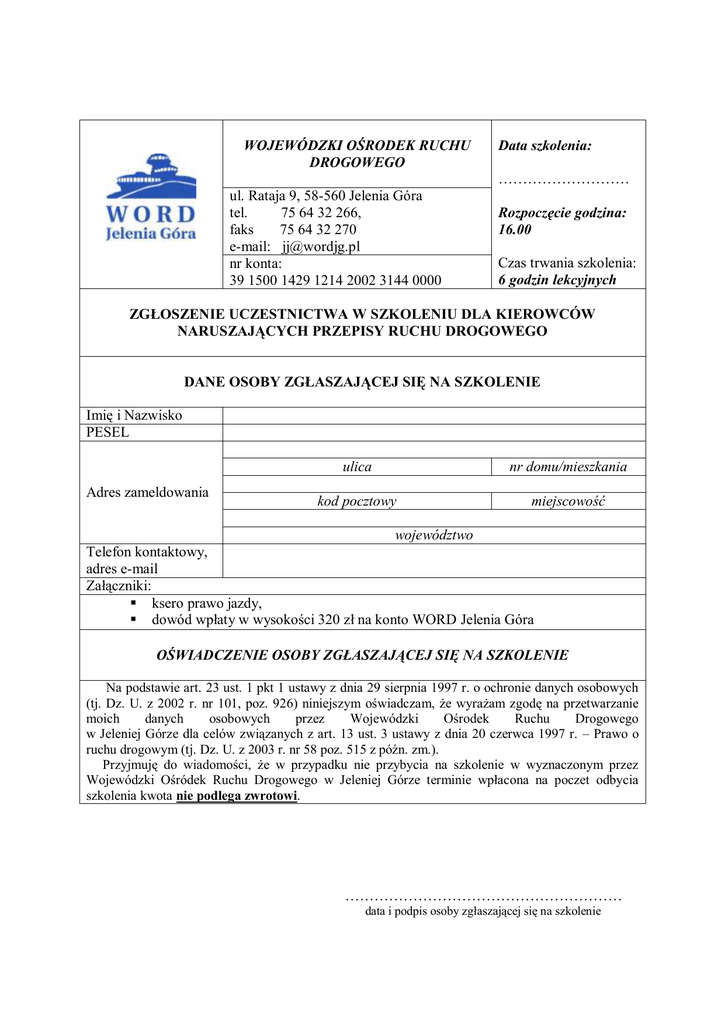 WOJEWÓDZKI OŚRODEK RUCHU DROGOWEGO Data szkolenia: ……………………… ul. Rataja 9, 58-560 Jelenia Góra tel. 75 64 32 266, faks 75 64 32 270 e-mail: [email protected] nr konta: 39 1500 1429 1214 2002 3144 0000 Rozpoczęcie godzina: 16.00 Czas trwania szkolenia: 6 godzin lekcyjnych ZGŁOSZENIE UCZESTNICTWA W SZKOLENIU DLA KIEROWCÓW NARUSZAJĄCYCH PRZEPISY RUCHU DROGOWEGO DANE OSOBY ZGŁASZAJĄCEJ SIĘ NA SZKOLENIE Imię i Nazwisko PESEL Adres zameldowania ulica nr domu/mieszkania kod pocztowy miejscowość województwo Telefon kontaktowy, adres e-mail Załączniki: ksero prawo jazdy, dowód wpłaty w wysokości 320 zł na konto WORD Jelenia Góra OŚWIADCZENIE OSOBY ZGŁASZAJĄCEJ SIĘ NA SZKOLENIE Na podstawie art. 23 ust. 1 pkt 1 ustawy z dnia 29 sierpnia 1997 r. o ochronie danych osobowych (tj. Dz. U. z 2002 r. nr 101, poz. 926) niniejszym oświadczam, że wyrażam zgodę na przetwarzanie moich danych osobowych przez Wojewódzki Ośrodek Ruchu Drogowego w Jeleniej Górze dla celów związanych z art. 13 ust. 3 ustawy z dnia 20 czerwca 1997 r. – Prawo o ruchu drogowym (tj. Dz. U. z 2003 r. nr 58 poz. 515 z późn. zm.). Przyjmuję do wiadomości, że w przypadku nie przybycia na szkolenie w wyznaczonym przez Wojewódzki Ośródek Ruchu Drogowego w Jeleniej Górze terminie wpłacona na poczet odbycia szkolenia kwota nie podlega zwrotowi. ………………………………………………… data i podpis osoby zgłaszającej się na szkolenie