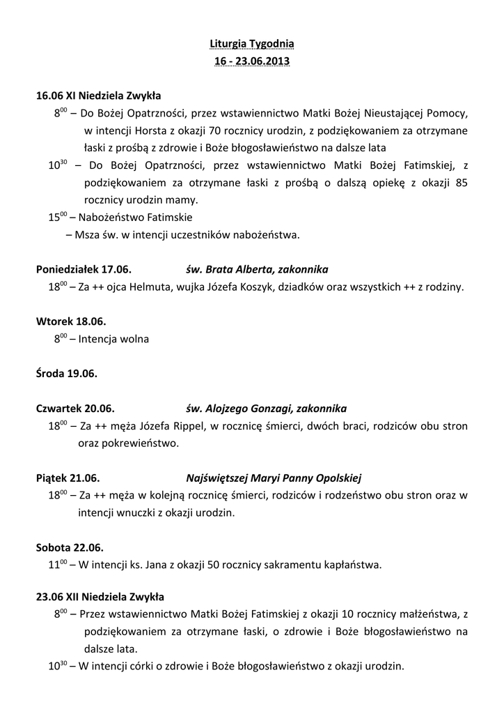 Liturgia Tygodnia 16 - 23.06.2013 16.06 XI Niedziela Zwykła 800 – Do Bożej Opatrzności, przez wstawiennictwo Matki Bożej Nieustającej Pomocy, w intencji Horsta z okazji 70 rocznicy urodzin, z podziękowaniem za otrzymane łaski z prośbą z zdrowie i Boże błogosławieństwo na dalsze lata 1030 – Do Bożej Opatrzności, przez wstawiennictwo Matki Bożej Fatimskiej, z podziękowaniem za otrzymane łaski z prośbą o dalszą opiekę z okazji 85 rocznicy urodzin mamy. 00 15 – Nabożeństwo Fatimskie – Msza św. w intencji uczestników nabożeństwa. Poniedziałek 17.06. św. Brata Alberta, zakonnika 1800 – Za ++ ojca Helmuta, wujka Józefa Koszyk, dziadków oraz wszystkich ++ z rodziny. Wtorek 18.06. 800 – Intencja wolna Środa 19.06. Czwartek 20.06. św. Alojzego Gonzagi, zakonnika 1800 – Za ++ męża Józefa Rippel, w rocznicę śmierci, dwóch braci, rodziców obu stron oraz pokrewieństwo. Piątek 21.06. Najświętszej Maryi Panny Opolskiej 00 18 – Za ++ męża w kolejną rocznicę śmierci, rodziców i rodzeństwo obu stron oraz w intencji wnuczki z okazji urodzin. Sobota 22.06. 1100 – W intencji ks. Jana z okazji 50 rocznicy sakramentu kapłaństwa. 23.06 XII Niedziela Zwykła 800 – Przez wstawiennictwo Matki Bożej Fatimskiej z okazji 10 rocznicy małżeństwa, z podziękowaniem za otrzymane łaski, o zdrowie i Boże błogosławieństwo na dalsze lata. 1030 – W intencji córki o zdrowie i Boże błogosławieństwo z okazji urodzin. Informacje duszpasterskie 1. 2. 3. 4. 5. 6. 7. Bóg zapłać za Ministrantom i Mariankom za przygotowanie terenu zewnętrznego do przeżycia kolejnego Nabożeństwa Fatimskiego. Dzisiaj Nabożeństwo Fatimskie o godz. 1500. Serdecznie zapraszam. Po Mszach św. będzie można złożyć do puszek ofiary na pokrycie kosztów uroczystości 50-lecia kapłaństwa ks. Jana. We wtorek Msza św. będzie odprawiona o godz. 800, natomiast w środę Mszy św. w naszym kościele nie będzie. W piątek zapraszam dzieci i młodzież gimnazjalną na Msze św. szkolną. Po Mszy św. spotkanie dla kandydatów do bierzmowania (uczniowie I i II klasy gimnazjalnej). W imieniu ks. Jana zapraszam w sobotę na Mszę św. o godz. 11 00. Chcemy wraz z Nim dziękować za otrzymane łaski podczas 50 lat życia kapłańskiego. Okazja do spowiedzi pół godziny przed Mszą św.