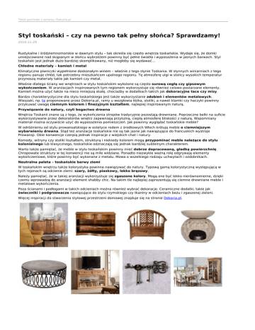 Tekst pochodzi z serwisu: Dekoria.pl Styl toskański – czy na pewno tak pełny słońca? Sprawdzamy! 2016-11-29 Rustykalne i śródziemnomorskie w dawnym stylu – tak określa się często wnętrza toskańskie. Wydaje się, że domki umiejscowione nad skąpanym w słońcu wybrzeżem powinny być pełne światła i wyposażenia w jasnych barwach. Styl toskański jest jednak dużo bardziej skomplikowany, niż mogłoby się wydawać… Chłodne materiały – kamień i metal Klimatyczne piwniczki wypełnione doskonałym winem – właśnie z tego słynie Toskania. W słynnych winiarniach z tego regionu panuje chłód, tak potrzebny mieszkańcom upalnego regionu. Tę atmosferę ulgi w stolicy wysokich temperatur przynoszą materiały takie jak kamień czy metal. Właśnie dlatego ściany we wnętrzach w stylu toskańskim wyłożone są często surową cegłą czy gipsowym wykończeniem. W aranżacjach inspirowanych tym regionem wykorzystuje się również celowo postarzane elementy. Kamień można użyć także na nieco mniejszą skalę, chociażby w dodatkach takich jak dekoracyjne tace czy misy. Bardzo charakterystyczne dla stylu toskańskiego jest także wykorzystanie zdobień i elementów metalowych. Wieszaki, np. te proponowane przez Dekoria.pl, ramy u wezgłowia łóżka, stoliki, a nawet klamki czy haczyki powinny przykuwać uwagę ciemnym kolorem i finezyjnym kształtem, najlepiej inspirowanym naturą. Przywiązanie do natury, czyli bogactwo drewna Wnętrza Toskanii znane są z tego, że wykończenia stropów tradycyjnie pozostają drewniane. Poprzeczne belki na suficie wykorzystywane przez dekoratorów wnętrz zapewniają przytulną, ciepłą atmosferę bliskości z naturą. Wspomniany materiał można oczywiście użyć do wyposażenia pomieszczeń. Jak powinny wyglądać toskańskie meble? W odróżnieniu od stylu prowansalskiego w estetyce rodem z środkowych Włoch królują meble o ciemniejszym wybarwieniu drewna. Stąd też aranżacje toskańskie nie są tak jasne jak nawiązujące do francuskich wystroje Prowansji. Obie konwencje czerpią jednak inspiracje z wiejskich chat i natury. Komody, witryny czy stoliki kształtem, strukturą i niekiedy kolorem mogą przypominać meble należące do stylu kolonialnego lub klasycznego, toskańskie odznaczają się jednak bardziej subtelnym charakterem. Warto także pamiętać, że meble w stylu toskańskim powinny mieć dobrze dopracowaną, gładką powierzchnię. Chropowate struktury w tej konwencji nie są mile widziane. Ponadto niezwykle ważną rolę odgrywają elementy wykończeniowe, które powinny być wykonane z metalu. Mowa o wszelkiego rodzaju uchwytach i ozdobnikach. Neutralna paleta – toskańskie barwy ziemi W toskańskim wnętrzu także kolorystyka powinna nawiązywać do natury. Typową gamą kolorystyczną występującą w tych rejonach są odcienie ziemi: szary, żółty, piaskowy, lekko brązowy. Należy pamiętać, że w takiej aranżacji wykorzystuje się zgaszone kolory. Mogą one być lekko nierównomierne, dzięki czemu wprowadzą do aranżacji element shabby chic. Na takim tle najlepiej zaprezentują się ciemne drewniane meble i metalowe wykończenia. Poza ścianami i podłogami w takich odcieniach można również wybrać dekoracje. Ceramiczne dodatki, takie jak świeczniki i podgrzewacze nawiązujące do stylu rzymskiego czy tkaniny w odcieniach beżu i zgaszonej zieleni. Więcej inspiracji do stworzenia stylowej przestrzeni domowej znajduje się na stronie Dekoria.pl.