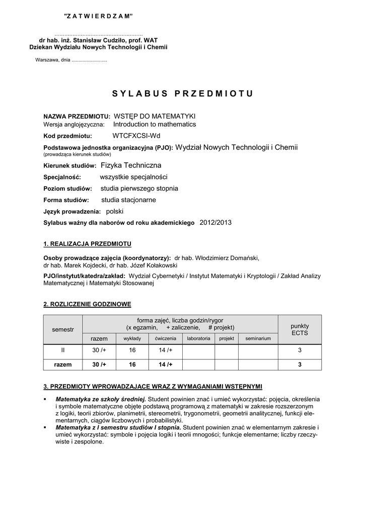 "Z A T W I E R D Z A M” ……………………………………………… dr hab. inż. Stanisław Cudziło, prof. WAT Dziekan Wydziału Nowych Technologii i Chemii Warszawa, dnia .......................... SYLABUS PRZEDMIOTU NAZWA PRZEDMIOTU: WSTĘP DO MATEMATYKI Wersja anglojęzyczna: Introduction to mathematics WTCFXCSI-Wd Kod przedmiotu: Podstawowa jednostka organizacyjna (PJO): Wydział Nowych Technologii i Chemii (prowadząca kierunek studiów) Kierunek studiów: Fizyka Techniczna Specjalność: wszystkie specjalności Poziom studiów: studia pierwszego stopnia Forma studiów: studia stacjonarne Język prowadzenia: polski Sylabus ważny dla naborów od roku akademickiego 2012/2013 1. REALIZACJA PRZEDMIOTU Osoby prowadzące zajęcia (koordynatorzy): dr hab. Włodzimierz Domański, dr hab. Marek Kojdecki, dr hab. Józef Kołakowski PJO/instytut/katedra/zakład: Wydział Cybernetyki / Instytut Matematyki i Kryptologii / Zakład Analizy Matematycznej i Matematyki Stosowanej 2. ROZLICZENIE GODZINOWE forma zajęć, liczba godzin/rygor (x egzamin, + zaliczenie, # projekt) semestr punkty ECTS razem wykłady ćwiczenia II 30 /+ 16 14 /+ 3 razem 30 /+ 16 14 /+ 3 laboratoria projekt seminarium 3. PRZEDMIOTY WPROWADZAJĄCE WRAZ Z WYMAGANIAMI WSTĘPNYMI Matematyka ze szkoły średniej. Student powinien znać i umieć wykorzystać: pojęcia, określenia i symbole matematyczne objęte podstawą programową z matematyki w zakresie rozszerzonym z logiki, teorii zbiorów, planimetrii, stereometrii, trygonometrii, geometrii analitycznej, funkcji elementarnych, ciągów liczbowych i probabilistyki. Matematyka z I semestru studiów I stopnia. Student powinien znać w elementarnym zakresie i umieć wykorzystać: symbole i pojęcia logiki i teorii mnogości; funkcje elementarne; liczby rzeczywiste i zespolone. 4. ZAKŁADANE EFEKTY KSZTAŁCENIA Symbol odniesienie do efektów kształcenia dla kierunku Efekty kształcenia Student, który zaliczył przedmiot, W01 Ma podstawową wiedzę, stanowiącą bazę dla zrozumienia i studiowania przedmiotów kierunkowych, w zakresie podstaw matematyki. Zna symbole i podstawowe pojęcia teorii mnogości i logiki matematycznej w zakresie potrzebnym do dalszego studiowania algebry i analizy matematycznej. K_W01, K_W02 W02 Zna i rozumie podstawowe pojęcia, określenia i twierdzenia teorii mnogości i logiki matematycznej. Zna sposoby formułowania twierdzeń. Zna właściwości zbiorów liczbowych. Rozumie pojęcie funkcji i jej właściwości. Zna pojęcie i najważniejsze przykłady relacji. Rozumie pojęcia mocy zbioru, przeliczalności zbioru i równoliczności zbiorów. Zna zasadę indukcji matematycznej. K_W01, K_W02 U01 Umie posługiwać się w podstawowym zakresie językiem teorii mnogości i logiki matematycznej, rachunkiem zdań i rachunkiem zbiorów. K_U10, K_U17 U02 Umie formułować i rozwiązywać proste problemy z wykorzystaniem elementów teorii mnogości i logiki matematycznej. K_U10, K_U17 K01 Rozumie potrzebę ciągłego dokształcania się i odświeżania wiedzy, w szczególności związanej ze złożoną strukturą matematyki. K_K01 5. METODY DYDAKTYCZNE wykład z możliwym wykorzystaniem technik audiowizualnych, ćwiczenia rachunkowe ułatwiające opanowanie, zrozumienie i usystematyzowanie wiedzy wyniesionej z wykładów i własnych studiów studentów oraz nabycie umiejętności rachunkowych, podanie zadań do samodzielnego rozwiązania i tematów do studiowania, pisemna praca kontrolna. 6. TREŚCI PROGRAMOWE liczba godzin lp temat/tematyka zajęć 1. Zbiory i działania na nich. Zbiór, element zbioru, przynależność. Symbole teorii mnogości i działania na zbiorach. Iloczyn kartezjański zbiorów. 2 2 2. Funkcje. Określenie odwzorowania i funkcji, właściwości funkcji. Funkcje elementarne. 2 2 3. Relacje. Relacje równoważności, relacje porządku. Funkcje jako relacje. Zbiory uporządkowane. 2 2 4. Zbiory liczbowe. Konstrukcje i właściwości zbiorów liczb naturalnych, całkowitych, wymiernych i rzeczywistych. Indukcja matematyczna i rekursja. 2 2 5. Moce zbiorów. Równoliczność zbiorów. Zbiory przeliczalne i nieprzeliczalne. Moce zbiorów. Moc zbioru liczb rzeczywistych. 2 2 wykł. ćwicz. lab. proj. semin. 6. Rachunek zdań. Zdania i funktory logiczne. Symbole logiczne i działania logiczne. Określanie wartości wyrażeń logicznych. 2 7. Prawa rachunku zdań. Prawa rachunku zdań; kwadrat logiczny. Reguły dowodzenia. 2 2 8. Kwantyfikatory. Zastosowania w rachunku zdań. Rachunek kwantyfikatorów. 2 2 16 14 Razem – studia stacjonarne Prace kontrolne przeprowadzane są podczas ćwiczeń. 7. LITERATURA podstawowa: H. Rasiowa: Wstęp do matematyki współczesnej; PWN, Warszawa; 1973. J. Kraszewski: Wstęp do matematyki; WNT, Warszawa; 2007. J. Onyszkiewicz, W. Marek: Elementy logiki i teorii mnogości w zadaniach; WN PWN, 2004. uzupełniająca: W. Guzicki, P. Zakrzewski: Wykłady ze wstępu do matematyki. Wprowadzenie do teorii mnogości; WN PWN, Warszawa, 2005. W. Guzicki, P. Zakrzewski: Wstęp do matematyki. Zbiór zadań; WN PWN, Warszawa, 2005. H. Matuszewska, W. Matuszewski: Elementy logiki i teorii mnogości dla informatyków; BEL Studio, Warszawa, 2003. W. Krysicki, L. Włodarski, Analiza matematyczna w zadaniach, część I i II; PWN, Warszawa, 2002. R. Leitner: Zarys matematyki wyższej, część I i II; WNT, Warszawa, 1994. R. Leitner, J. Zacharski: Zarys matematyki wyższej, część III; WNT, Warszawa, 1994. R. Leitner, M. Matuszewski: Z. Rojek, Zadania z matematyki wyższej, część I i II; WNT, Warszawa, 1998. W. Leksiński, J. Nabiałek, W. Żakowski: Matematyka. Definicje, twierdzenia, przykłady, zadania; WNT, Warszawa, 1992. W. Stankiewicz: Zadania z matematyki dla wyższych uczelni technicznych, część I; WNT, Warszawa, 1995. W. Stankiewicz, J. Wojtowicz: Zadania z matematyki dla wyższych uczelni technicznych, część II; WNT, Warszawa, 1995. 8. SPOSOBY WERYFIKACJI ZAKŁADANYCH EFEKTÓW KSZTAŁCENIA