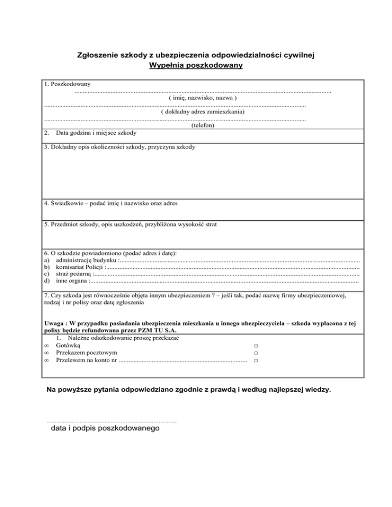 Zgłoszenie szkody z ubezpieczenia odpowiedzialności cywilnej Wypełnia poszkodowany 1. Poszkodowany ............................................................................................................................................................ ( imię, nazwisko, nazwa ) ............................................................................................................................................................... ( dokładny adres zamieszkania) ............................................................................................................................................................... (telefon) 2. Data godzina i miejsce szkody 3. Dokładny opis okoliczności szkody, przyczyna szkody 4. Świadkowie – podać imię i nazwisko oraz adres 5. Przedmiot szkody, opis uszkodzeń, przybliŜona wysokość strat 6. O szkodzie powiadomiono (podać adres i datę): a) administrację budynku :.................................................................................................................................................. b) komisariat Policji :.......................................................................................................................................................... c) straŜ poŜarną :................................................................................................................................................................. d) inne organa :................................................................................................................................................................... 7. Czy szkoda jest równocześnie objęta innym ubezpieczeniem ? – jeśli tak, podać nazwę firmy ubezpieczeniowej, rodzaj i nr polisy oraz datę zgłoszenia Uwaga : W przypadku posiadania ubezpieczenia mieszkania u innego ubezpieczyciela – szkoda wypłacona z tej polisy będzie refundowana przez PZM TU S.A. 1. NaleŜne odszkodowanie proszę przekazać • Gotówką □ • Przekazem pocztowym □ • Przelewem na konto nr .............................................................................. □ Na powyŜsze pytania odpowiedziano zgodnie z prawdą i według najlepszej wiedzy. ............................................................................... data i podpis poszkodowanego