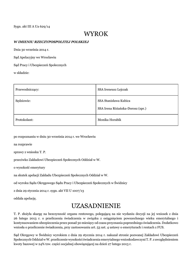 Sygn. akt III A Ua 629/14 WYROK W IMIENIU RZECZYPOSPOLITEJ POLSKIEJ Dnia 30 września 2014 r. Sąd Apelacyjny we Wrocławiu Sąd Pracy i Ubezpieczeń Społecznych w składzie: Przewodniczący: SSA Ireneusz Lejczak Sędziowie: SSA Stanisława Kubica SSA Irena Różańska-Dorosz (spr.) Protokolant: Monika Horabik po rozpoznaniu w dniu 30 września 2014 r. we Wrocławiu na rozprawie sprawy z wniosku T. P. przeciwko Zakładowi Ubezpieczeń Społecznych Oddział w W. o wysokość emerytury na skutek apelacji Zakładu Ubezpieczeń Społecznych Oddział w W. od wyroku Sądu Okręgowego Sądu Pracy i Ubezpieczeń Społecznych w Świdnicy z dnia 29 stycznia 2014 r. sygn. akt VII U 1007/13 oddala apelację. UZASADNIENIE T. P. złożyła skargę na bezczynność organu rentowego, polegającą na nie wydaniu decyzji na jej wniosek z dnia 26 lutego 2013 r. o przeliczenia świadczenia w związku z osiągnięciem powszechnego wieku emerytalnego i kontynuowaniem ubezpieczenia przez ponad 30 miesięcy od czasu przyznania poprzedniego świadczenia. Dodatkowo wniosła o przeliczenie świadczenia, przy zastosowaniu art. 53 ust. 4 ustawy o emeryturach i rentach z FUS. Sąd Okręgowy w Świdnicy wyrokiem z dnia 29 stycznia 2014 r. nakazał stronie pozwanej Zakładowi Ubezpieczeń Społecznych Oddział w W. przeliczenie wysokości świadczenia emerytalnego wnioskodawczyni T. P. z uwzględnieniem kwoty bazowej w 24% tzw. części socjalnej obowiązującej na dzień 27 lutego 2013 r. Powyższe rozstrzygnięcie Sąd pierwszej instancji wydał w oparciu o następująco ustalony stan faktyczny: T. P., urodzona (...), decyzją z dnia 3 kwietnia 2009 r., od dnia 1 marca 2009 r. ma przyznane prawo do emerytury. Ustalając wysokość świadczenia przyjęto podstawę wymiaru w wysokości 3.528,86 zł wyliczoną przez pomnożenie wskaźnika wysokości podstawy wymiaru (WWPW) wyliczonego na podstawie wynagrodzenia z okresu 10 lat (1999-2008), tj. 136,87% przez kwotę bazową w wysokości 2.578,26 zł. Nadto okresy składkowe ustalono na 39 lat 5 miesięcy, a okresy nieskładkowe na 6 miesięcy. Do wyliczenia części socjalnej przyjęto również kwotę bazową w wysokości 2.578,26 zł. Wnioskiem z dnia 27 lutego 2013 r. wnioskodawczyni wniosła o przyznanie prawa do emerytury w związku z osiągnięciem wieku powszechnego i przyjęcie przy ustalaniu jej wysokości, że kontynuowała ubezpieczenie przez ponad 30 miesięcy (art. 53 ust. 3 i 4 w zw. z ust. 1 pkt 1 ustawy o emeryturach i rentach z Funduszu Ubezpieczeń Społecznych). Nadto dodała, że domaga się przyznania prawa do emerytury na „starych zasadach”, a nie „mieszanej” do czego zresztą nie ma prawa w związku z brzmieniem art. 183 ww. ustawy. Z zaświadczenia o zatrudnieniu i wynagrodzeniu z dnia 26 lutego 2013 r. wydanego przez pracodawcę - Sąd Rejonowy w W.- wynika, że wnioskodawczyni pozostaje w zatrudnieniu od 1 marca 1969 r. do chwili obecnej. Zakład Ubezpieczeń Społecznych Oddział w W. nie wydał decyzji w sprawie wniosku wnioskodawczyni. Jedynie pismem z dnia 10 maja 2013 r. poinformował ją, że winna złożyć wniosek o przyznanie kolejnej emerytury, której wysokość będzie ustalona na nowych zasadach, czyli bez znaczenia pozostanie fakt przepracowania na emeryturze wcześniejszej co najmniej 30 miesięcy. W dniu 6 czerwca 2013 r. wnioskodawczyni wystąpiła ze skargą na bezczynność organu rentowego w związku z niewydaniem decyzji na jej wniosek z dnia 27 lutego 2013 r. Przy tak ustalonym stanie faktycznym Sąd Okręgowy uznał, że skarga wnioskodawczyni jest w pełni zasadna, zarówno w kwestii formalnej, tj. nieuprawnionego niewydania decyzji przez organ rentowy, jak i zasadności zawartego w skardze żądania. Sąd powołał się w tym względzie na treść przepisów art. 118 ustawy z dnia 17 grudnia 1998 r. o emeryturach i rentach z Funduszu Ubezpieczeń Społecznych, art. 83 ust. 3 ustawy z dnia 13 października 1998 r. o systemie ubezpieczeń społecznych i stwierdził, że dokładnie sformułowany przez wnioskodawczynię wniosek z dnia 27 lutego 2013 r. wymuszał na organie rentowym jego rozpoznanie w należyty sposób, a więc w drodze decyzji. Skoro zaś, organ rentowy nie mając wątpliwości co do celu, jaki w wyniku jego rozpoznania zamierzała osiągnąć wnioskodawczyni, nie wydał decyzji w sprawie, to oczywistym jest, że dopuścił się bezczynności, która na dzień wystąpienia ze skargą sięgała blisko dwóch miesięcy. To zaś spowodowało, zdaniem Sądu pierwszej instancji, że skarga nadawała się do merytorycznego rozpoznania. Natomiast odnosząc się do meritum Sąd ten ocenił, że słuszność ma wnioskodawczyni, nie domagając się przyznania nowego świadczenia, ale przeliczenia emerytury w związku z ukończeniem 60 roku życia i przepracowania ponad 30 miesięcy w ramach stosunku pracy od czasu przyznania jej wcześniejszej emerytury tj. od 1 marca 2009 r. To zaś oznacza według Sądu Okręgowego, że emerytura, o którą wystąpiła wnioskodawczyni nie stanowi nowego świadczenia, którego wysokość ustala się według reguł dotyczących przyznawania emerytury po raz pierwszy. Potwierdzenie to znajduje w uchwale Sądu Najwyższego z dnia 14 czerwca 2006 r. sygn. akt I UZP 3/06 (OSNP 2007/1-2/22) wskazującej, że prawo do emerytury wcześniejszej nie wygasa, a w art. 21 ust. 2 pkt 1 ustawy o emeryturach i rentach z FUS jest mowa o emeryturze dla osoby, która wcześniej miała ustalone prawo do emerytury, z czego wynika, że w zakresie tego samego świadczenia - emerytury - w związku ze spełnieniem warunku osiągnięcia wieku emerytalnego następuje jedynie ustalenie na nowo podstawy wymiaru. Już choćby z tego faktu nie można automatycznie przyjąć, że skoro wnioskodawczyni urodziła się (...) nie może domagać się przeliczenia emerytury na zasadach dotyczących osób urodzonych przed 1 stycznia 1949 r. Sąd zwrócił uwagę na to, że ubezpieczonej została już przyznana eme