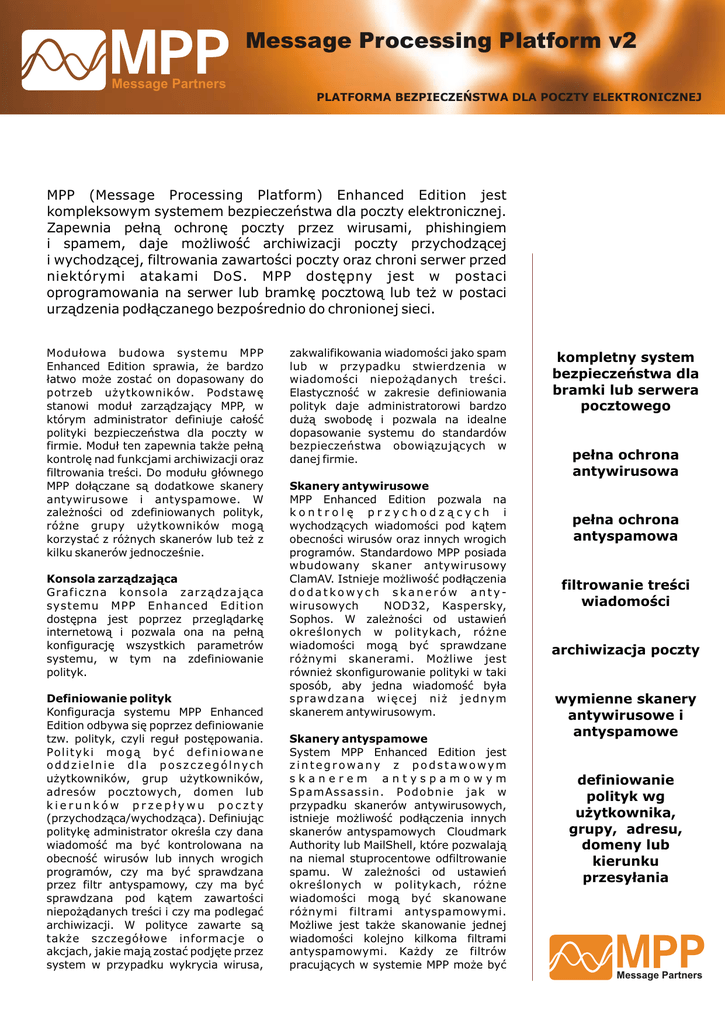 Message Processing Platform v2 Message Partners PLATFORMA BEZPIECZEŃSTWA DLA POCZTY ELEKTRONICZNEJ MPP (Message Processing Platform) Enhanced Edition jest kompleksowym systemem bezpieczeństwa dla poczty elektronicznej. Zapewnia pełną ochronę poczty przez wirusami, phishingiem i spamem, daje możliwość archiwizacji poczty przychodzącej i wychodzącej, filtrowania zawartości poczty oraz chroni serwer przed niektórymi atakami DoS. MPP dostępny jest w postaci oprogramowania na serwer lub bramkę pocztową lub też w postaci urządzenia podłączanego bezpośrednio do chronionej sieci. Modułowa budowa systemu MPP Enhanced Edition sprawia, że bardzo łatwo może zostać on dopasowany do potrzeb użytkowników. Podstawę stanowi moduł zarządzający MPP, w którym administrator definiuje całość polityki bezpieczeństwa dla poczty w firmie. Moduł ten zapewnia także pełną kontrolę nad funkcjami archiwizacji oraz filtrowania treści. Do modułu głównego MPP dołączane są dodatkowe skanery antywirusowe i antyspamowe. W zależności od zdefiniowanych polityk, różne grupy użytkowników mogą korzystać z różnych skanerów lub też z kilku skanerów jednocześnie. Konsola zarządzająca Graficzna konsola zarządzająca systemu MPP Enhanced Edition dostępna jest poprzez przeglądarkę internetową i pozwala ona na pełną konfigurację wszystkich parametrów systemu, w tym na zdefiniowanie polityk. Definiowanie polityk Konfiguracja systemu MPP Enhanced Edition odbywa się poprzez definiowanie tzw. polityk, czyli reguł postępowania. Po l i ty k i m o g ą by ć d e f i n i o wa n e oddzielnie dla poszczególnych użytkowników, grup użytkowników, adresów pocztowych, domen lub kierunków przepływu poczty (przychodząca/wychodząca). Definiując politykę administrator określa czy dana wiadomość ma być kontrolowana na obecność wirusów lub innych wrogich programów, czy ma być sprawdzana przez filtr antyspamowy, czy ma być sprawdzana pod kątem zawartości niepożądanych treści i czy ma podlegać archiwizacji. W polityce zawarte są także szczegółowe informacje o akcjach, jakie mają zostać podjęte przez system w przypadku wykrycia wirusa, zakwalifikowania wiadomości jako spam lub w przypadku stwierdzenia w wiadomości niepożądanych treści. Elastyczność w zakresie definiowania polityk daje administratorowi bardzo dużą swobodę i pozwala na idealne dopasowanie systemu do standardów bezpieczeństwa obowiązujących w danej firmie. Skanery antywirusowe MPP Enhanced Edition pozwala na kontrolę przychodzących i wychodzących wiadomości pod kątem obecności wirusów oraz innych wrogich programów. Standardowo MPP posiada wbudowany skaner antywirusowy ClamAV. Istnieje możliwość podłączenia dodatkowych skanerów antywirusowych NOD32, Kaspersky, Sophos. W zależności od ustawień określonych w politykach, różne wiadomości mogą być sprawdzane różnymi skanerami. Możliwe jest również skonfigurowanie polityki w taki sposób, aby jedna wiadomość była sprawdzana więcej niż jednym skanerem antywirusowym. Skanery antyspamowe System MPP Enhanced Edition jest zintegrowany z podstawowym skanerem antyspamowym SpamAssassin. Podobnie jak w przypadku skanerów antywirusowych, istnieje możliwość podłączenia innych skanerów antyspamowych Cloudmark Authority lub MailShell, które pozwalają na niemal stuprocentowe odfiltrowanie spamu. W zależności od ustawień określonych w politykach, różne wiadomości mogą być skanowane różnymi filtrami antyspamowymi. Możliwe jest także skanowanie jednej wiadomości kolejno kilkoma filtrami antyspamowymi. Każdy ze filtrów pracujących w systemie MPP może być kompletny system bezpieczeństwa dla bramki lub serwera pocztowego pełna ochrona antywirusowa pełna ochrona antyspamowa filtrowanie treści wiadomości archiwizacja poczty wymienne skanery antywirusowe i antyspamowe definiowanie polityk wg użytkownika, grupy, adresu, domeny lub kierunku przesyłania Message Partners Message Processing Platform v2 Message Partners PLATFORMA BEZPIECZEŃSTWA DLA POCZTY ELEKTRONICZNEJ niezależnie ustawiony na inną czułość, co pozwala na bardzo precyzyjne dostrojenie. Dodatkowo istnieje możliwość ustawienia białej i czarnej listy. wiadomości pod wskazany adres (tylko dla wiadomości spamowych) lub wyleczenia infekcji (tylko w przypadku wykrycia wirusa). W przypadku wykrycia przez filtr zawartości treści niedozwolonego wyrażenia lub załącznika, w zależności od ustawienia polityki, wiadomości taka może zostać przesłana na konkretny adres, umieszczona w katalogu kwarantanny lub zostać usunięta lub odrzucona. Filtrowanie treści Moduł filtrowania treści pozwala na kontrolę poczty przychodzącej i wychodzącej pod kątem zawartości określonych słów czy wyrażeń lub też pod kątem zawartości określonych załączników. Pozwala zatrzymać wiadomości mogące zawierać informacje, które nie powinny wyjść poza firmę np. informacje poufne. Treść wiadomości, jej temat i nagłówek mogą być filtrowane pod kątem zawartości określonych słów lub wyrażeń, które definiowane są w politykach przez administratora w postaci wyrażeń regularnych. Co ważne, system rozpoznaje także polskie znaki (standard UTF-8). Załączniki wiadomości mogą być filtrowane pod kątem określonej nazwy, rozszerzenia lub zawartej treści. Dodatkowo system pozwala na zdefiniowanie tzw. list dostępu określających reguły wysyłania i odbierania wiadomości. Listy dostępu dają możliwość szczegółowego określenia, na jakie adresy dana osoba może wysyłać pocztę lub z jakich może je otrzymywać. W przypadku wykrycia wiadomości, która zawiera niepożądaną treść lub załącznik, system podejmuje akcję zgodną ze zdefiniowaną polityką bezpieczeństwa. Archiwizacja wiadomości System MPP Enhanced Edition umożliwia archiwizację przychodzących oraz wychodzących wiadomości.