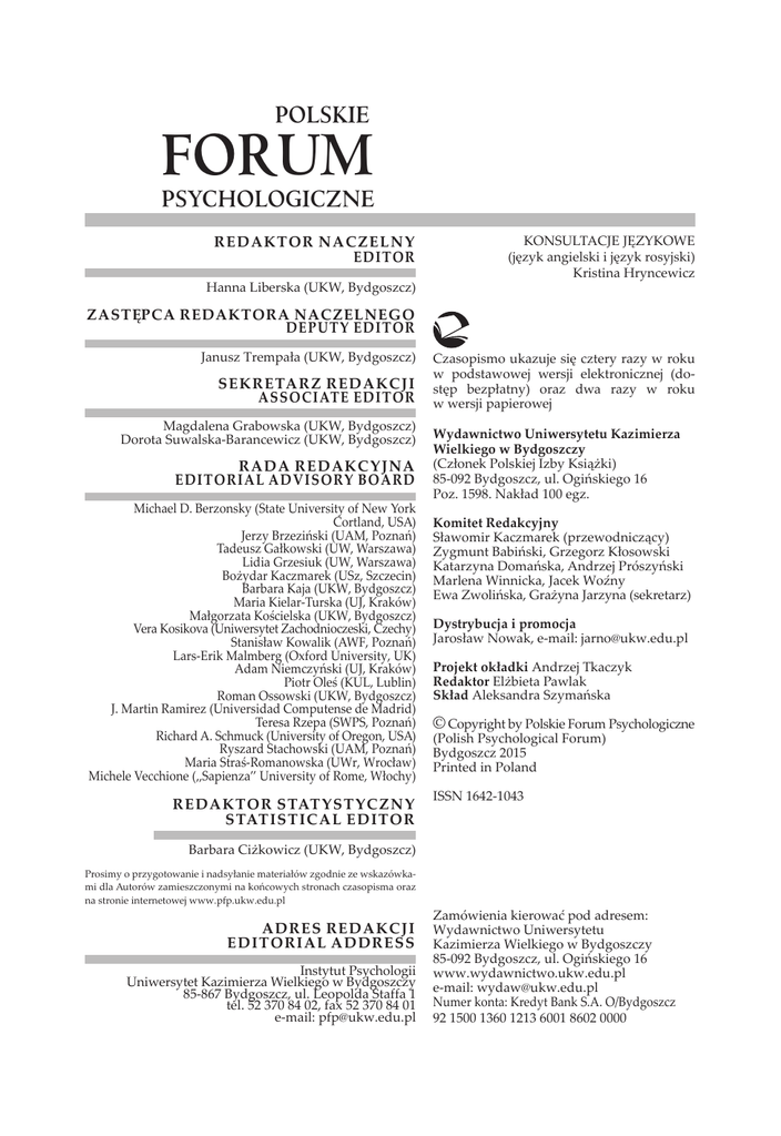 polskie forum psychologiczne ReDaKtoR naczelny eDitoR Hanna Liberska (UKW, Bydgoszcz) KONSULTACJE JĘZYKOWE (język angielski i język rosyjski) Kristina hryncewicz ZASTĘPCA REDAKTORA nACZElnEGO DePUty eDitoR Janusz Trempała (UKW, Bydgoszcz) SeKRetaRz ReDaKcji aSSociate eDitoR Magdalena Grabowska (UKW, Bydgoszcz) Dorota Suwalska-Barancewicz (UKW, Bydgoszcz) RaDa ReDaKcyjna eDitoRial aDviSoRy BoaRD michael D. Berzonsky (state university of new york Cortland, USA) Jerzy Brzeziński (UAM, Poznań) Tadeusz Gałkowski (UW, Warszawa) Lidia Grzesiuk (UW, Warszawa) Bożydar Kaczmarek (USz, Szczecin) Barbara Kaja (UKW, Bydgoszcz) Maria Kielar-Turska (UJ, Kraków) Małgorzata Kościelska (UKW, Bydgoszcz) Vera Kosikova (Uniwersytet Zachodnioczeski, Czechy) Stanisław Kowalik (AWF, Poznań) Lars-Erik Malmberg (Oxford University, UK) Adam Niemczyński (UJ, Kraków) Piotr Oleś (KUL, Lublin) Roman Ossowski (UKW, Bydgoszcz) J. Martin Ramirez (Universidad Computense de Madrid) Teresa Rzepa (SWPS, Poznań) Richard A. Schmuck (University of Oregon, USA) Ryszard Stachowski (UAM, Poznań) Maria Straś-Romanowska (UWr, Wrocław) Michele Vecchione („Sapienza” University of Rome, Włochy) ReDaKtoR StatyStyczny StatiStical eDitoR Czasopismo ukazuje się cztery razy w roku w podstawowej wersji elektronicznej (dostęp bezpłatny) oraz dwa razy w roku w wersji papierowej Wydawnictwo Uniwersytetu Kazimierza Wielkiego w Bydgoszczy (Członek Polskiej Izby Książki) 85-092 Bydgoszcz, ul. Ogińskiego 16 Poz. 1598. Nakład 100 egz. Komitet Redakcyjny Sławomir Kaczmarek (przewodniczący) Zygmunt Babiński, Grzegorz Kłosowski Katarzyna Domańska, Andrzej Prószyński Marlena Winnicka, Jacek Woźny Ewa Zwolińska, Grażyna Jarzyna (sekretarz) Dystrybucja i promocja Jarosław Nowak, e-mail: [email protected] Projekt okładki Andrzej Tkaczyk Redaktor Elżbieta Pawlak Skład Aleksandra Szymańska © Copyright by Polskie Forum Psychologiczne (Polish Psychological Forum) Bydgoszcz 2015 printed in poland issn 1642-1043 Barbara Ciżkowicz (UKW, Bydgoszcz) Prosimy o przygotowanie i nadsyłanie materiałów zgodnie ze wskazówkami dla Autorów zamieszczonymi na końcowych stronach czasopisma oraz na stronie internetowej www.pfp.ukw.edu.pl aDReS ReDaKcji eDitoRial aDDReSS instytut psychologii uniwersytet Kazimierza Wielkiego w Bydgoszczy 85-867 Bydgoszcz, ul. leopolda staffa 1 tel. 52 370 84 02, fax 52 370 84 01 e-mail: [email protected] strona 146 Zamówienia kierować pod adresem: Wydawnictwo uniwersytetu Kazimierza Wielkiego w Bydgoszczy 85-092 Bydgoszcz, ul. Ogińskiego 16 www.wydawnictwo.ukw.edu.pl e-mail: [email protected] Numer konta: Kredyt Bank S.A. O/Bydgoszcz 92 1500 1360 1213 6001 8602 0000 Redakcja 85-867 Bydgoszcz, ul. leopolda staffa 1 tel. 52 370 84 02, fax 52 370 84 01 e-mail: [email protected] polskie forum psychologiczne Spis treści [Contents] ARTYKUŁY [Articles] nina Ogińska-Bulik: Strategie radzenia sobie a osobowy wzrost u nastolatków, którzy doświadczyli negatywnych wydarzeń życiowych [Coping strategies and personal growth in adolescents who have experienced negative life events] ....................................................................................................... 149 Katharina eckstein, Peter noack, Philipp jugert: Pathways to Active Citizenship in Adolescence and young Adulthood ....................................................................... 165 Magdalena Połom: Syndrom gotowości anorektycznej a struktura motywacji osiągnięć u uczennic szkoły średniej [Anorexia readiness syndrome and structure of achievement motivation among secondary school girls] .................................................................................................. 184 Michalina Sołtys, Izabela Grzankowska: Emocjonalność rodziców a natężenie zachowań agresywnych u dzieci [Emotionality of parents and aggressive behaviour among children] ................... 201 Michał Gacek, Władysława Pilecka: Bezradność edukacyjna dzieci i młodzieży z lekkim stopniem niepełnosprawności intelektualnej na etapie kształcenia podstawowego, gimnazjalnego i zawodowego [educational helplessness in children and adolescents with mild intellectual disability in elementary, middle, and vocational schools] ...................................... 216 arleta chojniak: Determinacja funkcjonalna i subiektywno-racjonalna w psychoanalizie freuda [The functional and subjectively-rational determination in freud’s psychoanalysis] .............................................................................................................. 236 strona 147 Agata Szäefer, Agata Złotogórska: Kto je oczami? Rola wrażliwości sensorycznej i stylów poznawczych w odbiorze bodźców smakowych [Who eats with their eyes? The role of sensory sensivity and cognitive styles in flavour perception] .................................................................................................... 244 Iwona Głowacka, Tomasz nowikiewicz, Krystyna nowacka, Wojciech Hagner, Wojciech zegarski: Ocena jakości życia kobiet leczonych metodą BCT z procedurą węzła wartowniczego z powodu raka piersi [Quality of life evaluation in women with breast cancer undergoing bct with sentinel lymph node biopsy] ............................................................................... 261 Recenzje i SPRaWozDania [Reviews and reports] Daniel Goleman (2014). Focus: sztuka koncentracji jako ukryte dążenie do doskonałości Poznań: Media Rodzina (ss. 343) [rec. Arkadiusz Jarzecki] ............................................................................................... 273 Sprawozdanie z II Międzynarodowej Konferencji: Morpho-biomechanical and psycho-physical aspects of youth lifestyle in V4 countries (10 października 2014, Bydgoszcz) [ewelina Kamasz] .......................................................................................................... 276 strona 148