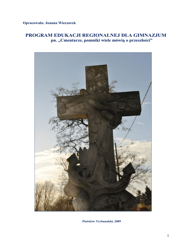 Opracowała: Joanna Wieczorek PROGRAM EDUKACJI REGIONALNEJ DLA GIMNAZJUM pn. „Cmentarze, pomniki wiele mówią o przeszłości” Piotrków Trybunalski, 2009 1 Lecz aby drogę mierzyć przyszłą Trzeba nam pomnieć, skąd się wyszło [ C. K. Norwid ] CHARAKTERYSTYKA PROGRAMU Program stworzony został z myślą o uczniach klas pierwszych gimnazjum. Realizowany będzie przede wszystkim na lekcjach historii (koła historycznego), lekcjach języka polskiego i plastyki. Konstrukcyjnie program winien stanowić uzupełnienie realizowanych w tych klasach wcześniej przedsięwzięć: wycieczki do muzeum (poznanie niemych świadków historii - zabytków grodu piotrkowskiego), udziału w spotkaniu ze świadkiem II wojny światowej. Treści nauczania tego programu mają przekazywać wiedzą historyczną, etnograficzną o regionie, a także wiedzę o jego kulturze. Program ma wspierać również kształtowanie walorów wychowawczych: uczyć empatii, szacunku dla przeszłości, przypominać o ludziach zmarłych regionu, którzy żyli i tworzyli nie tylko „małą historię”. Tak naprawdę nie trzeba przeszukiwać książek historycznych, aby odnaleźć bohaterów historycznych na wielką skalę. Program ma również uświadamiać uczniom, że: „naród bez cmentarzy nie jest narodem” (M. Gudro). Niniejszy projekt służy wspieraniu aktywności poznawczej uczniów, kształtowaniu zainteresowań. Ma pomóc w określeniu własnej tożsamości, kształtowaniu postaw patriotycznych i humanitarnych, doskonaleniu umiejętności komunikacji międzyludzkiej, wreszcie rozwijaniu więzi uczuciowych z najbliższym otoczeniem. Takie więzi rodzą się poprzez pogłębianie wiedzy o regionie, ale przede wszystkim w kontakcie z jego przyrodą, kulturą, ludźmi tu żyjącymi. Dlatego nauczyciele realizujący program będą pełnili głównie funkcje inspiratorów i współuczestników zajęć. Z uwagi na specyfikę wybranych przedmiotów należy założyć, że realizacja przedsięwzięcia będzie kładła nacisk na ,,wyrobienie” w uczniach postawy wyrażającej się w takich cechach jak: Przeświadczeniu, że w życiu człowieka podstawowe znaczenie mają takie wartości jak dobro, prawda, obowiązkowość, solidarność i tolerancja. Szacunku dla dorobku minionych pokoleń. Krytycyzmie wobec wszelkich postaw i odmian nietolerancji, rasizmu, nacjonalizmu itp. 2 Patriotyzmie wyrażającym się dumą z osiągnięć własnego narodu przy zachowaniu pełnego szacunku dla ludzi innych narodów, ras, kultur, religii i poglądów. Dociekliwości i wnikliwości w ustalaniu prawdy historycznej. W programie zaplanowano też zajęcia w terenie - Szlakiem piotrkowskich cmentarzy. Główny cel wycieczki będzie wiązał się z kształtowaniem tożsamości narodowej, świadomości obywatelskiej i społecznej oraz uczczeniem pamięci zmarłych, zwłaszcza walczących w obronie ojczyzny. Uczniowie poznają: piotrkowskie nekropolie, tradycje, obrzędy, które towarzyszyły pochówkom: katolickim, prawosławnym, ewangelickim i żydowskim, znaczenie symboli nagrobkowych, historie wielu wybitnych i ciekawych osób związanych z naszym regionem, elementy architektury nagrobków i kaplic grobowych, najstarsze pomniki, będące zabytkami sztuki sakralnej, których renowacją zajmuje się Towarzystwo Przyjaciół Miasta Piotrkowa Trybunalskiego, ciekawostki związane z modą cmentarną, które wiąże się z fotografią nagrobkową, ozdobami, parkanami itp. zbiorowe mogiły nieznanych żołnierzy oraz tablice z nazwiskami poległych za wolność ojczyzny, tradycje cmentarza ewangelickiego, gdzie znajduje się wiele nagrobków, które stanowią dziś cenny przykład sztuki sakralnej, zwłaszcza rzeźby, „ bogactwa” epitafiów uwiecznionych na nagrobkach, które wyszły spod pióra wybitnych twórców poezji polskiej: Jana Kochanowskiego, Cypriana Norwida czy Marii Konopnickiej. Na cmentarzu żydowskim obejrzą: macewy i kaplice żydowskich cadyków. Wysłuchają objaśnień dotyczących ceremonii pogrzebowej, symboli, szczególnego usytuowania grobów. Na zakończenie uczniowie zwiedzą cmentarz na skraju Lasu Rakowskiego gdzie znajdują się symboliczne mogiły żołnierzy armii radzieckiej oraz pomniki poświęcone rozstrzelanym Polakom i Żydom. 3 Cmentarze wiele mówią o przeszłości. Kto chce się dowiedzieć czegoś o historii, musi zacząć od cmentarzy [ Arno Surmiński] WARUNKI WDRAŻANIA PROGRAMU Opracowanie i wdrożenie autorskiego programu z zakresu edukacji regionalnej pn. „Cmentarze, pomniki wiele mówią o przeszłości” dla klas pierwszych gimnazjum: Zaprezentowanie programu na RP. Zaznajomienie uczniów z programem. WSTĘP Związek człowieka z dziedzictwem własnego regionu jest wartością, którą należy uświadomić dziecku i młodemu człowiekowi po to, by ukształtować w nim poczucie własnej tożsamości, jako podstawy zaangażowania się w funkcjonowanie własnego środowiska i otwarcia na inne kultury czy społeczności. Tak pojmując edukację regionalną, budzi się potrzeba ochrony dziedzictwa kulturalnego oraz świadomość wartości tego dziedzictwa. W dobie globalizacji na nowo musimy odkryć wartość społeczności lokalnych, a także bogactwo kulturowe, bowiem w problematyce regionalnej dostrzega się szansę na wzbogacenie i odnalezienie drogi do wspólnoty ogólnonarodowej. W procesie zaś edukacji niezwykle ważne jest odwoływanie się do historii, tradycji, miejsca. Człowiek winien wzrastać przez pryzmat małej ojczyzny. Edukacja regionalna daje możliwość realizacji szeregu celów edukacyjnych, przyswojenia wiedzy z różnych przedmiotów: języka polskiego, historii, geografii, sztuki (elementy dziedzictwa kulturowego). Zatem kształcenie więzi z regionem czyli z ,,najbliższą ojczyzną” należy do ważniejszych zadań stawianych we współczesnej dydaktyce przedmiotów humanistycznych. Jest to zadanie wdzięczne, ale jednoczenie dość trudne. Wdzięczne gdyż jego 