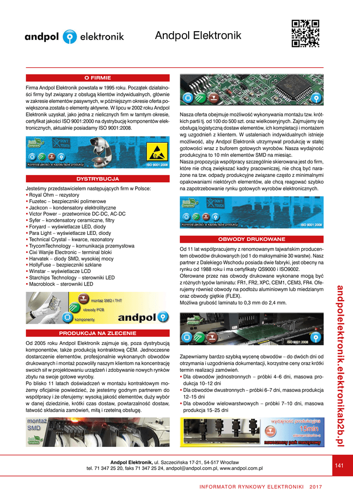 Andpol Elektronik O FIRMIE Firma Andpol Elektronik powstała w 1995 roku. Początek działalności firmy był związany z obsługą klientów indywidualnych, głównie w zakresie elementów pasywnych, w późniejszym okresie oferta powiększona została o elementy aktywne. W lipcu w 2002 roku Andpol Elektronik uzyskał, jako jedna z nielicznych firm w tamtym okresie, certyfikat jakości ISO 9001:2000 na dystrybucję komponentów elektronicznych, aktualnie posiadamy ISO 9001:2008. DYSTRYBUCJA OBWODY DRUKOWANE Od 11 lat współpracujemy z renomowanym tajwańskim producentem obwodów drukowanych (od 1 do maksymalnie 30 warstw). Nasz partner z Dalekiego Wschodu posiada dwie fabryki, jest obecny na rynku od 1988 roku i ma certyfikaty QS9000 i ISO9002. Oferowane przez nas obwody drukowane wykonane mogą być z różnych typów laminatu: FR1, FR2, XPC, CEM1, CEM3, FR4. Oferujemy również obwody na podłożu aluminiowym lub miedzianym oraz obwody giętkie (FLEX). Możliwa grubość laminatu to 0,3 mm do 2,4 mm. PRODUKCJA NA ZLECENIE Od 2005 roku Andpol Elektronik zajmuje się, poza dystrybucją komponentów, także produkcją kontraktową CEM. Jednoczesne dostarczenie elementów, profesjonalnie wykonanych obwodów drukowanych i montaż pozwoliły naszym klientom na koncentrację swoich sił w projektowaniu urządzeń i zdobywanie nowych rynków zbytu na swoje gotowe wyroby. Po blisko 11 latach doświadczeń w montażu kontraktowym możemy oficjalnie powiedzieć, że jesteśmy godnym partnerem do współpracy i że oferujemy: wysoką jakość elementów, duży wybór w danej dziedzinie, krótki czas dostaw, powtarzalność dostaw, łatwość składania zamówień, miłą i rzetelną obsługę. Zapewniamy bardzo szybką wycenę obwodów – do dwóch dni od otrzymania i uzgodnienia dokumentacji, korzystne ceny oraz krótki termin realizacji zamówień. Dla obwodów jednostronnych – próbki 4–6 dni, masowa produkcja 10–12 dni Dla obwodów dwustronnych – próbki 6–7 dni, masowa produkcja 12–15 dni Dla obwodów wielowarstwowych – próbki 7–10 dni, masowa produkcja 15–25 dni Andpol Elektronik, ul. Szczecińska 17-21, 54-517 Wrocław tel. 71 347 25 20, faks 71 347 25 24, [email protected], www.andpol.com.pl I N F O R M AT O R R Y N KO W Y E L E K T R O N I K I andpolelektronik.elektronikab2b.pl Jesteśmy przedstawicielem następujących firm w Polsce: Royal Ohm – rezystory Fuzetec – bezpieczniki polimerowe Jackcon – kondensatory elektrolityczne Victor Power – przetwornice DC-DC, AC-DC Syfer – kondensatory ceramiczne, filtry Foryard – wyświetlacze LED, diody Para Light – wyświetlacze LED, diody Technical Crystal – kwarce, rezonatory TrycomTechnology – komunikacja przemysłowa Cixi Wanjie Electronic – terminal bloki Harvatek – diody SMD, wysokiej mocy HollyFuse – bezpieczniki szklane Winstar – wyświetlacze LCD Starchips Technology – sterowniki LED Macroblock – sterowniki LED Nasza oferta obejmuje możliwość wykonywania montażu tzw. krótkich partii tj. od 100 do 500 szt. oraz wielkoseryjnych. Zajmujemy się obsługą logistyczną dostaw elementów, ich kompletacji i montażem wg uzgodnień z klientem. W ustaleniach indywidualnych istnieje możliwość, aby Andpol Elektronik utrzymywał produkcję w stałej gotowości wraz z buforem gotowych wyrobów. Nasza wydajność produkcyjna to 10 mln elementów SMD na miesiąc. Nasza propozycja współpracy szczególnie skierowana jest do firm, które nie chcą zwiększać kadry pracowniczej, nie chcą być narażone na tzw. odpady produkcyjne związane często z minimalnymi opakowaniami niektórych elementów, ale chcą reagować szybko na zapotrzebowanie rynku gotowych wyrobów elektronicznych. 141 2017