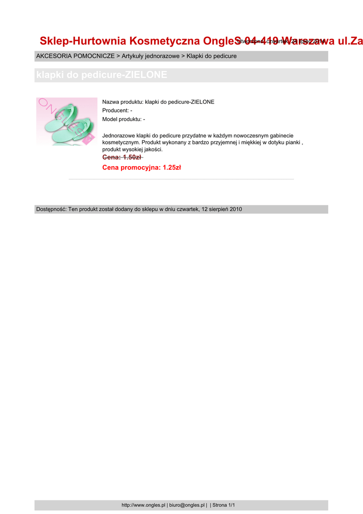 czwartek, 24 lipiec 2014 Sklep-Hurtownia Kosmetyczna OngleSUtworzono: 04-419 Warszawa ul.Za AKCESORIA POMOCNICZE > Artykuły jednorazowe > Klapki do pedicure klapki do pedicure-ZIELONE Nazwa produktu: klapki do pedicure-ZIELONE Producent: Model produktu: Jednorazowe klapki do pedicure przydatne w każdym nowoczesnym gabinecie kosmetycznym. Produkt wykonany z bardzo przyjemnej i miękkiej w dotyku pianki , produkt wysokiej jakości. Cena: 1.50zł Cena promocyjna: 1.25zł Dostępność: Ten produkt został dodany do sklepu w dniu czwartek, 12 sierpień 2010 http://www.ongles.pl | [email protected] | | Strona 1/1