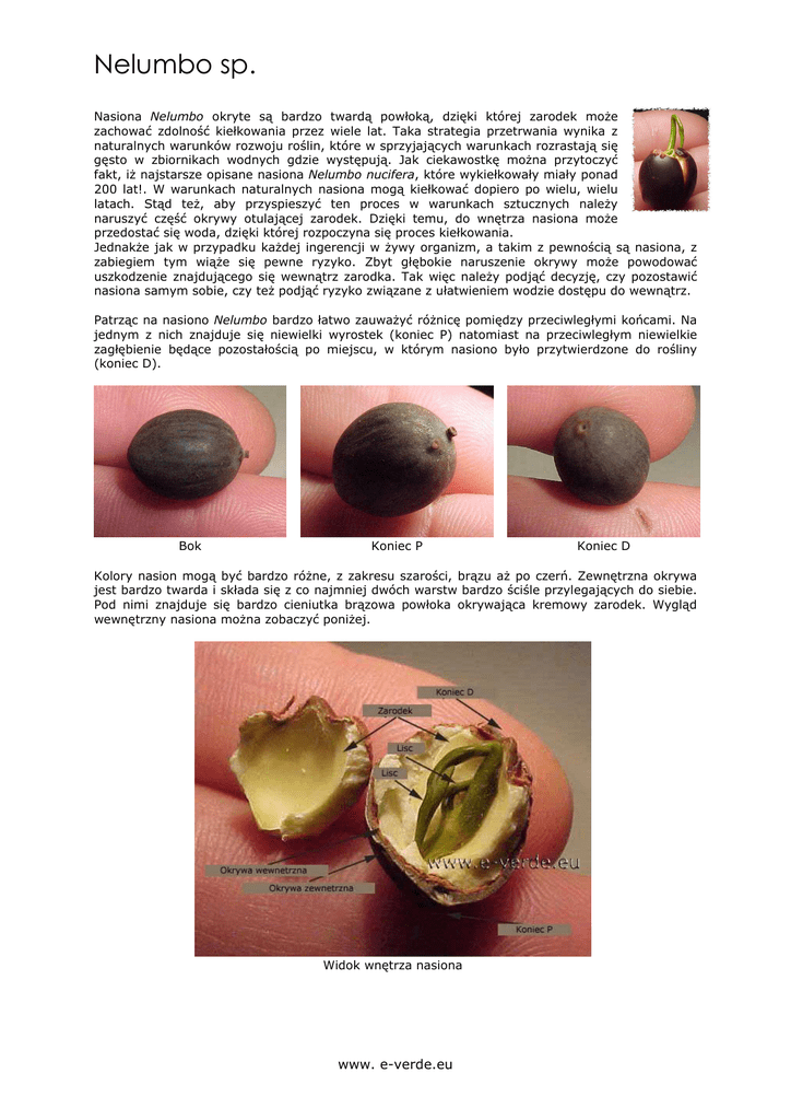Nelumbo sp. Nasiona Nelumbo okryte są bardzo twardą powłoką, dzięki której zarodek moŜe zachować zdolność kiełkowania przez wiele lat. Taka strategia przetrwania wynika z naturalnych warunków rozwoju roślin, które w sprzyjających warunkach rozrastają się gęsto w zbiornikach wodnych gdzie występują. Jak ciekawostkę moŜna przytoczyć fakt, iŜ najstarsze opisane nasiona Nelumbo nucifera, które wykiełkowały miały ponad 200 lat!. W warunkach naturalnych nasiona mogą kiełkować dopiero po wielu, wielu latach. Stąd teŜ, aby przyspieszyć ten proces w warunkach sztucznych naleŜy naruszyć część okrywy otulającej zarodek. Dzięki temu, do wnętrza nasiona moŜe przedostać się woda, dzięki której rozpoczyna się proces kiełkowania. JednakŜe jak w przypadku kaŜdej ingerencji w Ŝywy organizm, a takim z pewnością są nasiona, z zabiegiem tym wiąŜe się pewne ryzyko. Zbyt głębokie naruszenie okrywy moŜe powodować uszkodzenie znajdującego się wewnątrz zarodka. Tak więc naleŜy podjąć decyzję, czy pozostawić nasiona samym sobie, czy teŜ podjąć ryzyko związane z ułatwieniem wodzie dostępu do wewnątrz. Patrząc na nasiono Nelumbo bardzo łatwo zauwaŜyć róŜnicę pomiędzy przeciwległymi końcami. Na jednym z nich znajduje się niewielki wyrostek (koniec P) natomiast na przeciwległym niewielkie zagłębienie będące pozostałością po miejscu, w którym nasiono było przytwierdzone do rośliny (koniec D). Bok Koniec P Koniec D Kolory nasion mogą być bardzo róŜne, z zakresu szarości, brązu aŜ po czerń. Zewnętrzna okrywa jest bardzo twarda i składa się z co najmniej dwóch warstw bardzo ściśle przylegających do siebie. Pod nimi znajduje się bardzo cieniutka brązowa powłoka okrywająca kremowy zarodek. Wygląd wewnętrzny nasiona moŜna zobaczyć poniŜej. Widok wnętrza nasiona www. e-verde.eu Nelumbo sp. Jak juŜ wspomniano na początku, nasiona Nelumbo dzięki swojej budowie zachowują zdolność kiełkowania przez bardzo długi okres. Jest to w duŜej mierze zasługa twardej okrywy, niemalŜe nieprzepuszczalnej dla wody. Dlatego teŜ cały sekret w przyspieszeniu kiełkowania nasion Nelumbo leŜy w umiejętnym usunięciu zewnętrznej okrywy w taki sposób by uszkodzeniu nie uległ zarodek. Są rozmaite metody usuwania zewnętrznej okrywy. W niektórych źródłach moŜna znaleźć informację o namaczanie w kwasie siarkowym przez około 5 godzin. Inne podają bardziej bezpieczny sposób: mechaniczne usunięcie części okrywy. Ten właśnie sposób zostanie opisany poniŜej. NaleŜy przygotować narzędzie umoŜliwiające przytrzymanie nasiona podczas zabiegu oraz papier ścierny lub pilniczek. Gdzie "piłować"? Na powierzchni nasiona są dwie strefy, których uszkodzenie jest najbardziej zalecane. Część boczna (pomiędzy końcami P i D) lub koniec D. Ścianka boczna Na początku ścierania pojawia się bardzo ciemna warstwa. Następnie pojawi się bardzo cienka jasna obwódka. Kiedy dotrzemy do tego miejsc moŜna juŜ zaprzestać ścierania. Jest to szczególnie wskazane dla osób wykonujących tez zabieg po raz pierwszy, nie mających jeszcze doświadczenia w tejŜe czynności. JeŜeli przeoczysz ten etap, kolejnym będzie pojawienie się kremowej plamki umieszczonej centralnie w spiłowanym obszarze. W tym miejscu naleŜy definitywnie zaprzestać dalszego piłowania. Przekroczenie tej "granicy" wiąŜe się juŜ z moŜliwością uszkodzenia zarodka znajdującego się wewnątrz. Osoby o duŜym doświadczeniu mogą przekraczać tę "granicę" mając juŜ wyczucie kiedy zaprzestać piłowania. JednakŜe nie jest to warte ryzyka związanego z uszkodzeniem zarodka albowiem juŜ na tym etapie woda będzie miała swobodny dostęp do zarodka. A to właśnie jest główny cel całego procesu. Koniec D Jest mniej zalecanym miejscem spiłowania okrywy ze względu na fakt, iŜ opisane poniŜej warstwy są mniej wyraźne niŜ w przypadku spiłowania ścianki bocznej. Podczas spiłowywania nasiona w tym miejscy moŜna równieŜ natrafić na niewielki obszar wypełniony powietrzem, który juŜ bezpośrednio przylega do zarodka. W związku z tym, moŜna łatwo uszkodzić zarodek. Wstępne przygotowanie nasion mamy juŜ za sobą, co dalej? Przygotowane nasiona naleŜy umieścić w naczyniu wypełnionym świeŜą wodą. Nie naleŜy uŜywać wody chlorowanej "prosto z kranu" – chlor ma bardzo niekorzystny wpływ na Ŝywotność zarodka! MoŜna równieŜ umieścić nasiono w naczyniu ze sterylnym piaskiem i całość umieścić w wodzie tak, aby poziom wody nie był mniejszy niŜ 5cm ponad powierzchnie piasku. W obydwu przypadkach naleŜy zapewnić temperaturę otoczenia w zakresie pomiędzy 22 a 30˚C JuŜ po kilku godzinach o umieszczenia nasion w wodzie przybierze ona brązowawy kolor i stanie się mętna. Na jej powierzchni moŜe równieŜ pojawić się cieniutki "koŜuch". Jest to spowodowane rozwojem bakterii. Zalecane jest, więc wymienianie wody na świeŜą tak aby zapewnić odpowiednie środowisko dla rozwoju rośliny. Czynność tę naleŜy wykonywać nie częściej niŜ raz dziennie. W przypadku, jeśli zapomnimy o wymianie wody przez 2-3 dni nie stanie się nic strasznego. JednakŜe dłuŜsze utrzymywanie mętnej wody będzie mogło juŜ niekorzystnie odbić się na kondycji rośliny! MoŜna będzie równieŜ zaobserwować, iŜ nasiono znacznie zwiększy swoją objętość. JeŜeli nasiono będzie umieszczone wyłącznie w wodzie, zazwyczaj w przeciągu kilku godzin opadnie ono na dno naczynia. JednakŜe często zdarza się, iŜ proces nawadniania moŜe potrwać nawet kilka dni podczas, których nasiono będzie unosić się na powierzchni wody. Następnie następuje okres kiedy nie będą widoczne Ŝadne zmiany. MoŜe to potrwać od kilku dni do kilku tygodni w zaleŜności od warunków, w jakich znajduje się nasiono. Po tym okresie wchodzimy juŜ w czas wzrostu rośliny. W tym czasie juŜ praktycznie kaŜdego dn