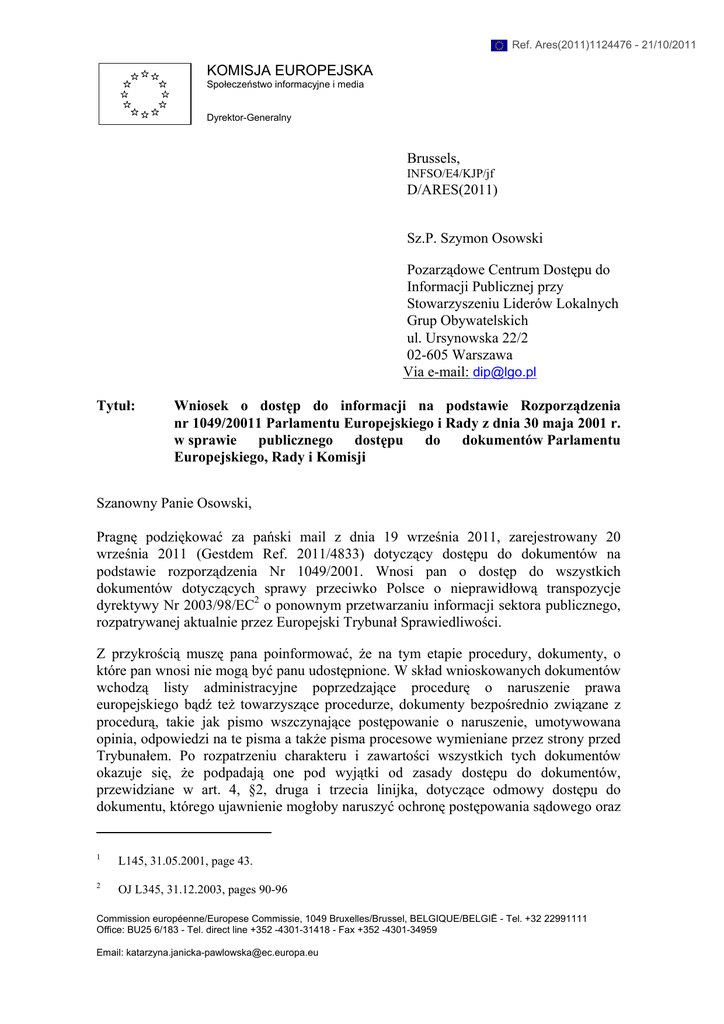 Ref. Ares(2011)1124476 - 21/10/2011 KOMISJA EUROPEJSKA Społeczeństwo informacyjne i media Dyrektor-Generalny Brussels, INFSO/E4/KJP/jf D/ARES(2011) Sz.P. Szymon Osowski Pozarządowe Centrum Dostępu do Informacji Publicznej przy Stowarzyszeniu Liderów Lokalnych Grup Obywatelskich ul. Ursynowska 22/2 02-605 Warszawa Via e-mail: [email protected] Tytuł: Wniosek o dostęp do informacji na podstawie Rozporządzenia nr 1049/20011 Parlamentu Europejskiego i Rady z dnia 30 maja 2001 r. w sprawie publicznego dostępu do dokumentów Parlamentu Europejskiego, Rady i Komisji Szanowny Panie Osowski, Pragnę podziękować za pański mail z dnia 19 września 2011, zarejestrowany 20 września 2011 (Gestdem Ref. 2011/4833) dotyczący dostępu do dokumentów na podstawie rozporządzenia Nr 1049/2001. Wnosi pan o dostęp do wszystkich dokumentów dotyczących sprawy przeciwko Polsce o nieprawidłową transpozycje dyrektywy Nr 2003/98/EC2 o ponownym przetwarzaniu informacji sektora publicznego, rozpatrywanej aktualnie przez Europejski Trybunał Sprawiedliwości. Z przykrością muszę pana poinformować, że na tym etapie procedury, dokumenty, o które pan wnosi nie mogą być panu udostępnione. W skład wnioskowanych dokumentów wchodzą listy administracyjne poprzedzające procedurę o naruszenie prawa europejskiego bądź też towarzyszące procedurze, dokumenty bezpośrednio związane z procedurą, takie jak pismo wszczynające postępowanie o naruszenie, umotywowana opinia, odpowiedzi na te pisma a także pisma procesowe wymieniane przez strony przed Trybunałem. Po rozpatrzeniu charakteru i zawartości wszystkich tych dokumentów okazuje się, że podpadają one pod wyjątki od zasady dostępu do dokumentów, przewidziane w art. 4, §2, druga i trzecia linijka, dotyczące odmowy dostępu do dokumentu, którego ujawnienie mogłoby naruszyć ochronę postępowania sądowego oraz 1 L145, 31.05.2001, page 43. 2 OJ L345, 31.12.2003, pages 90-96 Commission européenne/Europese Commissie, 1049 Bruxelles/Brussel, BELGIQUE/BELGIË - Tel. +32 22991111 Office: BU25 6/183 - Tel. direct line +352 -4301-31418 - Fax +352 -4301-34959 Email: [email protected] ochronę dochodzenia, chyba że nadrzędny interes społeczny przemawiałby za ich udostępnieniem. W załączeniu przesyłam listę wyjątków ustanowioną rozporządzeniem 1049/2001. Sądy europejskie wielokrotnie wypowiadały się na temat zakresu wyjątków (zob. np sprawę Petrie T-191/99, wyrok z 11 grudnia 2001 oraz sprawy C-514/07 P, C-528/07 P i C-532/07 P, wyrok z 21 września 2011). Europejski Trybunał Sprawiedliwości uznał, iż państwa członkowskie mają prawo oczekiwać, że Komisja zagwarantuje poufność podczas dochodzenia, które może prowadzić do postępowania o naruszenie prawa europejskiego. Wymóg poufności pozostaje aktualny nawet po przedłożeniu sprawy przed Europejski Trybunał Sprawiedliwości, gdyż nie można wykluczyć, że dyskusje pomiędzy Komisją a danym państwem członkowskim dotyczące dobrowolnego dostosowania się tego ostatniego do wymogów Traktatu mogą trwać także podczas postępowania przed Trybunałem aż do momentu wydania wyroku. Ponadto, udostępnienie pism procesowaych w danej sprawie mogłoby mieć niekorzystny wpływ na postępowanie sądowe. Po rozpatrzeniu wnioskowanych dokumentów, okazało się również, że częściowe udostępnienie, tj.; udostępnienie niektórych tylko dokumentów, bądź ich części, jednakowoż mogłoby podważyć możliwość przyjaznego zakończenia sporu oraz wpłynąć na postępowanie sądowe. Poza tym, po rozpatrzeniu pańskiego wniosku, stwierdzam, że nie ma przeważającego interesu publicznego, który przemawiałby za ujawnieniem dokumentów. Niemniej jednak, pragnę zwrócić pańską uwagę na fakt, że zgodnie z kalendarzem Trybunału, wyrok w sprawie C-362/10 dotyczącej nieprawidłowej transpozycji prawa europejskiego przez Polskę przewidziany jest na 27 października 2011. Po ogłoszeniu wyroku, wyżej wymienione wyjątki nie będą miały już zastosowania. Gdyby jednak uznał pan, że powyższe stanowisko powinno zostać ponownie rozpatrzone, może pan napisać do Sekretariatu Generalnego Komisji, na podany niżej adres i potwierdzić pański wniosek. Pismo takie musi być wysłane w ciągu 15 dni roboczych od momentu otrzymania tego listu. Sekretariat Generalny poinformuje pana o wyniku ponownego rozpatrzenia w ciągu 15 dni roboczych od dnia rejestracji pańskiego wniosku, przyznając panu dostęp do wnioskowanych dokumentów lub potwierdzając odrzucenie wniosku. W tym ostatnim przypadku zostaną panu wskazane możliwe drogi odwoławcze. Korespondencje proszę przesyłać na poniższy adres. The Secretary-General European Commission B-1049 BRUSSELS Yours sincerely, (e-Signed) Robert Madelin 2 Załącznik: – Lista wyjątków od zasady dostępu do informacji, przewidziana Rozporządzeniem nr 1049/2001 Parlamentu Europejskiego i Rady z dnia 30 maja 2001 r. w sprawie publicznego dostępu do dokumentów Parlamentu Europejskiego, Rady i Komisji 3 Lista wyjątków od zasady dostępu do informacji, przewidziana Rozporządzeniem nr 1049/2001 Parlamentu Europejskiego i Rady z dnia 30 maja 2001 r. w sprawie publicznego dostępu do dokumentów Parlamentu Europejskiego, Rady i Komisji Artykuł 4 Wyjątki 1. Instytucja odmówi dostępu do dokumentu, jeśli ujawnienie go naruszyłoby ochronę: a) interesu publicznego w odniesieniu do: - bezpieczeństwa publicznego, - kwestii obronnych i wojskowych, - stosunków międzynarodowych, - finansowej, monetarnej czy ekonomicznej polityki Wspólnoty lub Państwa Członkowskiego; b) prywatności i integralności osoby fizycznej, w szczególności w odniesieniu do ustawodawstwa Wspólnoty związanych z ochroną danych osobowych. 2. Instytucje odmówią dostępu do dokumentu, jeśli ujawnienie go naruszyłoby ochronę: - interesów handlowych osoby fizycznej lub prawnej, w tym własności intelektualnej, - postępowania 