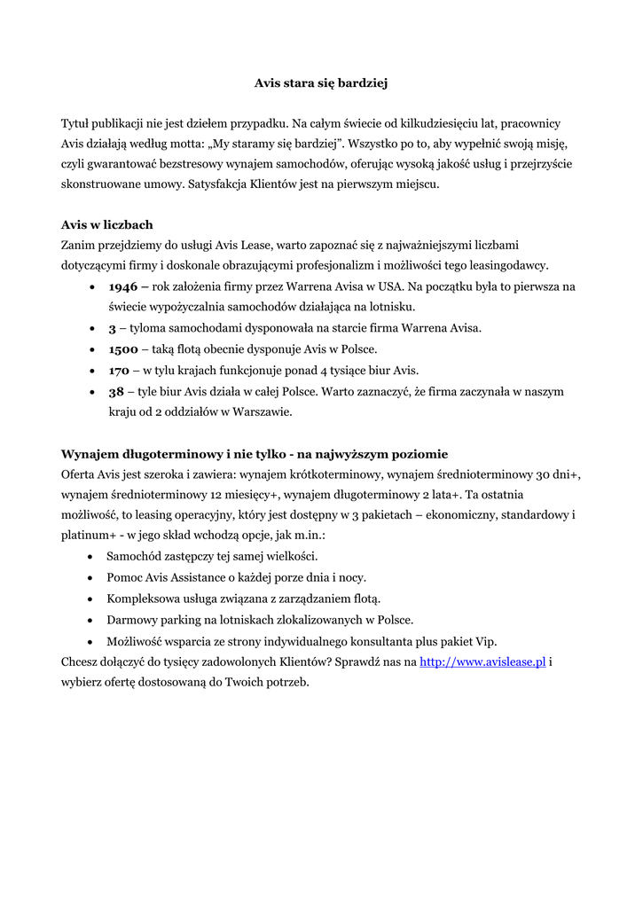 Avis stara się bardziej Tytuł publikacji nie jest dziełem przypadku. Na całym świecie od kilkudziesięciu lat, pracownicy Avis działają według motta: „My staramy się bardziej”. Wszystko po to, aby wypełnić swoją misję, czyli gwarantować bezstresowy wynajem samochodów, oferując wysoką jakość usług i przejrzyście skonstruowane umowy. Satysfakcja Klientów jest na pierwszym miejscu. Avis w liczbach Zanim przejdziemy do usługi Avis Lease, warto zapoznać się z najważniejszymi liczbami dotyczącymi firmy i doskonale obrazującymi profesjonalizm i możliwości tego leasingodawcy. 1946 – rok założenia firmy przez Warrena Avisa w USA. Na początku była to pierwsza na świecie wypożyczalnia samochodów działająca na lotnisku. 3 – tyloma samochodami dysponowała na starcie firma Warrena Avisa. 1500 – taką flotą obecnie dysponuje Avis w Polsce. 170 – w tylu krajach funkcjonuje ponad 4 tysiące biur Avis. 38 – tyle biur Avis działa w całej Polsce. Warto zaznaczyć, że firma zaczynała w naszym kraju od 2 oddziałów w Warszawie. Wynajem długoterminowy i nie tylko - na najwyższym poziomie Oferta Avis jest szeroka i zawiera: wynajem krótkoterminowy, wynajem średnioterminowy 30 dni+, wynajem średnioterminowy 12 miesięcy+, wynajem długoterminowy 2 lata+. Ta ostatnia możliwość, to leasing operacyjny, który jest dostępny w 3 pakietach – ekonomiczny, standardowy i platinum+ - w jego skład wchodzą opcje, jak m.in.: Samochód zastępczy tej samej wielkości. Pomoc Avis Assistance o każdej porze dnia i nocy. Kompleksowa usługa związana z zarządzaniem flotą. Darmowy parking na lotniskach zlokalizowanych w Polsce. Możliwość wsparcia ze strony indywidualnego konsultanta plus pakiet Vip. Chcesz dołączyć do tysięcy zadowolonych Klientów? Sprawdź nas na http://www.avislease.pl i wybierz ofertę dostosowaną do Twoich potrzeb.