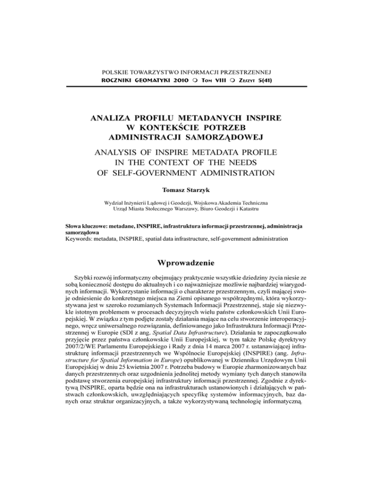 ANALIZA PROFILU METADANYCH INSPIRE W KONTEKCIE POTRZEB ADMINISTRACJI SAMORZ¥DOWEJ POLSKIE TOWARZYSTWO INFORMACJI PRZESTRZENNEJ 105 ROCZNIKI GEOMATYKI 2010 m TOM VIII m ZESZYT 5(41) ANALIZA PROFILU METADANYCH INSPIRE W KONTEKCIE POTRZEB ADMINISTRACJI SAMORZ¥DOWEJ ANALYSIS OF INSPIRE METADATA PROFILE IN THE CONTEXT OF THE NEEDS OF SELF-GOVERNMENT ADMINISTRATION Tomasz Starzyk Wydzia³ In¿ynierii L¹dowej i Geodezji, Wojskowa Akademia Techniczna Urz¹d Miasta Sto³ecznego Warszawy, Biuro Geodezji i Katastru S³owa kluczowe: metadane, INSPIRE, infrastruktura informacji przestrzennej, administracja samorz¹dowa Keywords: metadata, INSPIRE, spatial data infrastructure, self-government administration Wprowadzenie Szybki rozwój informatyczny obejmuj¹cy praktycznie wszystkie dziedziny ¿ycia niesie ze sob¹ koniecznoæ dostêpu do aktualnych i co najwa¿niejsze mo¿liwie najbardziej wiarygodnych informacji. Wykorzystanie informacji o charakterze przestrzennym, czyli maj¹cej swoje odniesienie do konkretnego miejsca na Ziemi opisanego wspó³rzêdnymi, która wykorzystywana jest w szeroko rozumianych Systemach Informacji Przestrzennej, staje siê niezwykle istotnym problemem w procesach decyzyjnych wielu pañstw cz³onkowskich Unii Europejskiej. W zwi¹zku z tym podjête zosta³y dzia³ania maj¹ce na celu stworzenie interoperacyjnego, wrêcz uniwersalnego rozwi¹zania, definiowanego jako Infrastruktura Informacji Przestrzennej w Europie (SDI z ang. Spatial Data Infrastructure). Dzia³ania te zapocz¹tkowa³o przyjêcie przez pañstwa cz³onkowskie Unii Europejskiej, w tym tak¿e Polskê dyrektywy 2007/2/WE Parlamentu Europejskiego i Rady z dnia 14 marca 2007 r. ustanawiaj¹cej infrastrukturê informacji przestrzennych we Wspólnocie Europejskiej (INSPIRE) (ang. Infrastructure for Spatial Information in Europe) opublikowanej w Dzienniku Urzêdowym Unii Europejskiej w dniu 25 kwietnia 2007 r. Potrzeba budowy w Europie zharmonizowanych baz danych przestrzennych oraz uzgodnienia jednolitej metody wymiany tych danych stanowi³a podstawê stworzenia europejskiej infrastruktury informacji przestrzennej. Zgodnie z dyrektyw¹ INSPIRE, oparta bêdzie ona na infrastrukturach ustanowionych i dzia³aj¹cych w pañstwach cz³onkowskich, uwzglêdniaj¹cych specyfikê systemów informacyjnych, baz danych oraz struktur organizacyjnych, a tak¿e wykorzystywan¹ technologiê informatyczn¹. 106 TOMASZ STARZYK Dostêp do praktycznie nieograniczonej liczby danych i informacji przestrzennych p³yn¹cych z ich przetworzenia oraz zwi¹zanych z nimi us³ug przestrzennych, opracowanych du¿ym nak³adem czasu i rodków, niesie ze sob¹ koniecznoæ znalezienia rozwi¹zania maj¹cego usprawniæ proces klasyfikowania i co za tym idzie odnajdywania interesuj¹cych nas zasobów o charakterze przestrzennym. W zwi¹zku z tym, jednym z elementów sk³adowych tworz¹cych krajow¹ i europejsk¹ infrastrukturê informacji przestrzennej sta³y siê metadane, czyli najogólniej definiuj¹c, dane o danych. A zatem, musimy sobie odpowiedzieæ na zasadnicze pytanie, jakie treci mo¿emy uzyskaæ po zapoznaniu siê z metadan¹ opisuj¹c¹ interesuj¹cy nas zasób przestrzenny. Metadane pozwalaj¹ nam znaleæ odpowiedzi na pytania takie jak: 1) co czyli jakiego rodzaju danych dotycz¹, 2) gdzie czyli lokalizacji przestrzennej, 3) jak wiêc w jaki sposób zosta³y dane pozyskane i przetworzone w procesie analitycznym i w jaki sposób s¹ udostêpniane, 4) kto czyli informacja wskazuj¹ca na jednostkê b¹d komórkê zbieraj¹ca dane oraz odpowiedzialn¹ za metadane, 5) kiedy a wiêc moment i zakres czasowy którego dotycz¹. Wiedza, któr¹ otrzymujemy z odpowiedzi na powy¿sze pytania w znacz¹cym stopniu u³atwia u¿ytkownikowi zrozumienie zakresu informacyjnego oferowanych zasobów geoinformacyjnych, ale równie¿ ich wyszukiwanie i ocenê pod wzglêdem indywidualnych zapotrzebowañ. Metadane tworzy siê wed³ug pewnych sprecyzowanych regu³, które definiuj¹ ich kszta³t oraz zakres tematyczny. Do wykorzystania i udostêpniania danych przestrzennych niezbêdne s¹ tak¿e opisane metadanymi us³ugi sieciowe (z ang. web services), które to umo¿liwiaj¹ wyszukiwanie, przetwarzanie, przegl¹danie i pobieranie danych przestrzennych oraz wykorzystanie danych przestrzennych i us³ug wiadczonych drog¹ elektroniczn¹. Podobnie jak ma to miejsce w przypadku metadanych opisuj¹cych zasoby danych przestrzennych, tak równie¿ us³ugi w celu zapewnienia interoperacyjnoci infrastruktur utworzonych przez pañstwa cz³onkowskie powinny funkcjonowaæ zgodnie ze wspólnie uzgodnionymi specyfikacjami i kryteriami wydajnoci. Z punktu widzenia funkcjonowania tworzonych baz metadanych, najistotniejsza staje siê us³uga katalogowa, która podobnie jak pozosta³e us³ugi geoprzestrzenne, okrelona jest przez standardy OGC (OGC Catalogue Web Services 2.0) bazuj¹ce na modelu klient-serwer oraz normy z serii 19100. Us³ugi katalogowe stanowi¹ jeden z kluczowych elementów infrastruktury geoinformacyjnej pozwalaj¹cej na odnajdywanie zasobów danych oraz us³ug wraz z mo¿liwoci¹ przegl¹dania rezultatów wyszukiwania. Zasada dzia³ania us³ugi katalogowej opiera siê na przeszukiwaniu metadanych w rozga³êzionej strukturze serwerów katalogowych i zwracaniu odpowiedzi na zadane pytanie. Budowa sprawnie funkcjonuj¹cej infrastruktury danych przestrzennych oparta jest w du¿ej mierze o mo¿liwoæ wyszukiwania danych przestrzennych, podobnie jak ma to miejsce w przypadku sieci Internet i analogicznej roli przegl¹darek internetowych (np. Google). W dobie potê¿nej iloci informacji, która tworzy zasoby globalnej sieci, brak mo¿liwoci wyszukiwania i odnajdywania interesuj¹cych nas treci, stanowiæ mo¿e ogromny problem nie tyle natury technicznej, co przede wszystkim problem ograniczonych mo¿liwoci wykorzystania Internetu i perspektyw jego rozwoju. Zgodnie z definicj¹ zaproponowana przez organizacjê GSDI (z ang. Global Spatial Data Infrastructure) (G